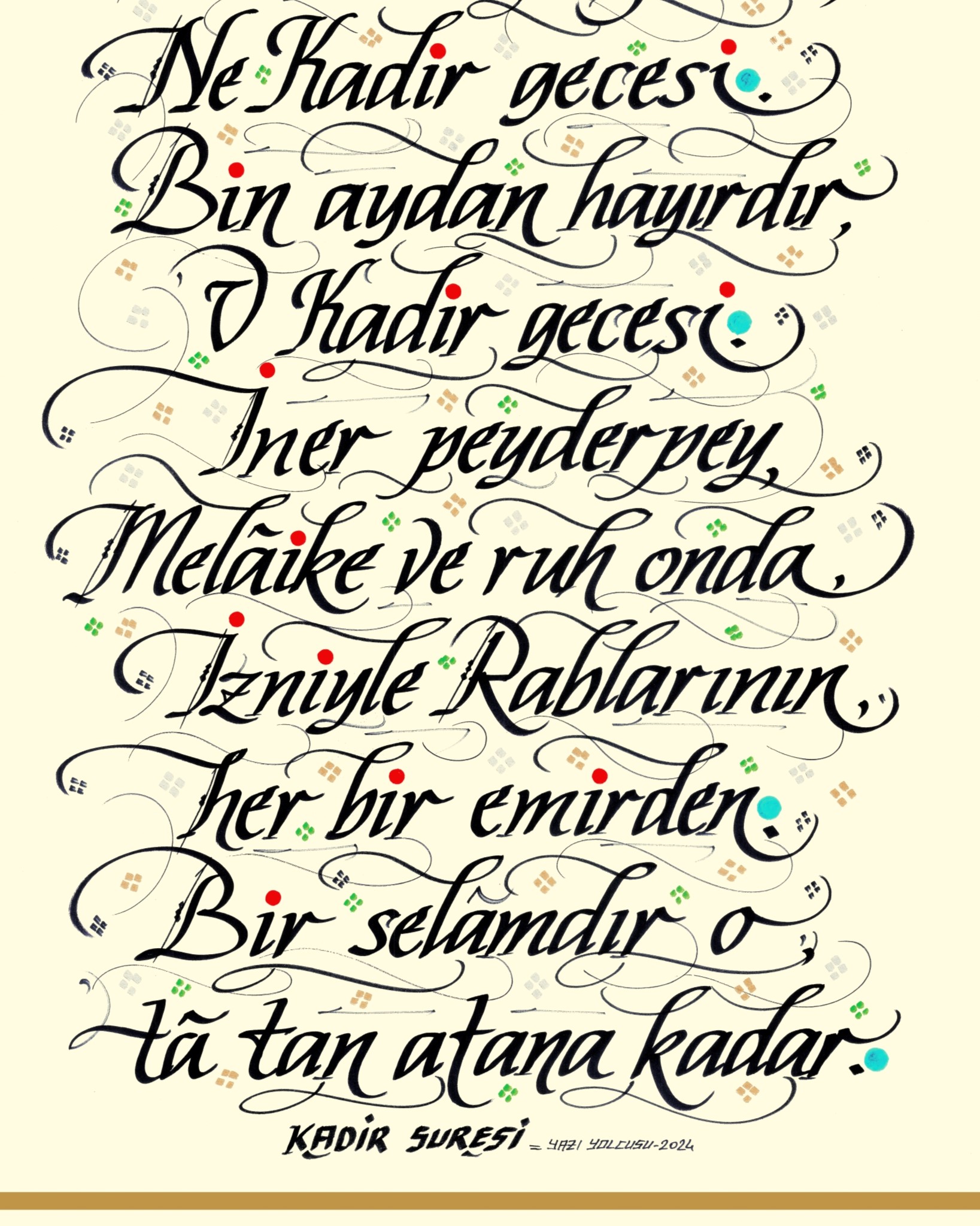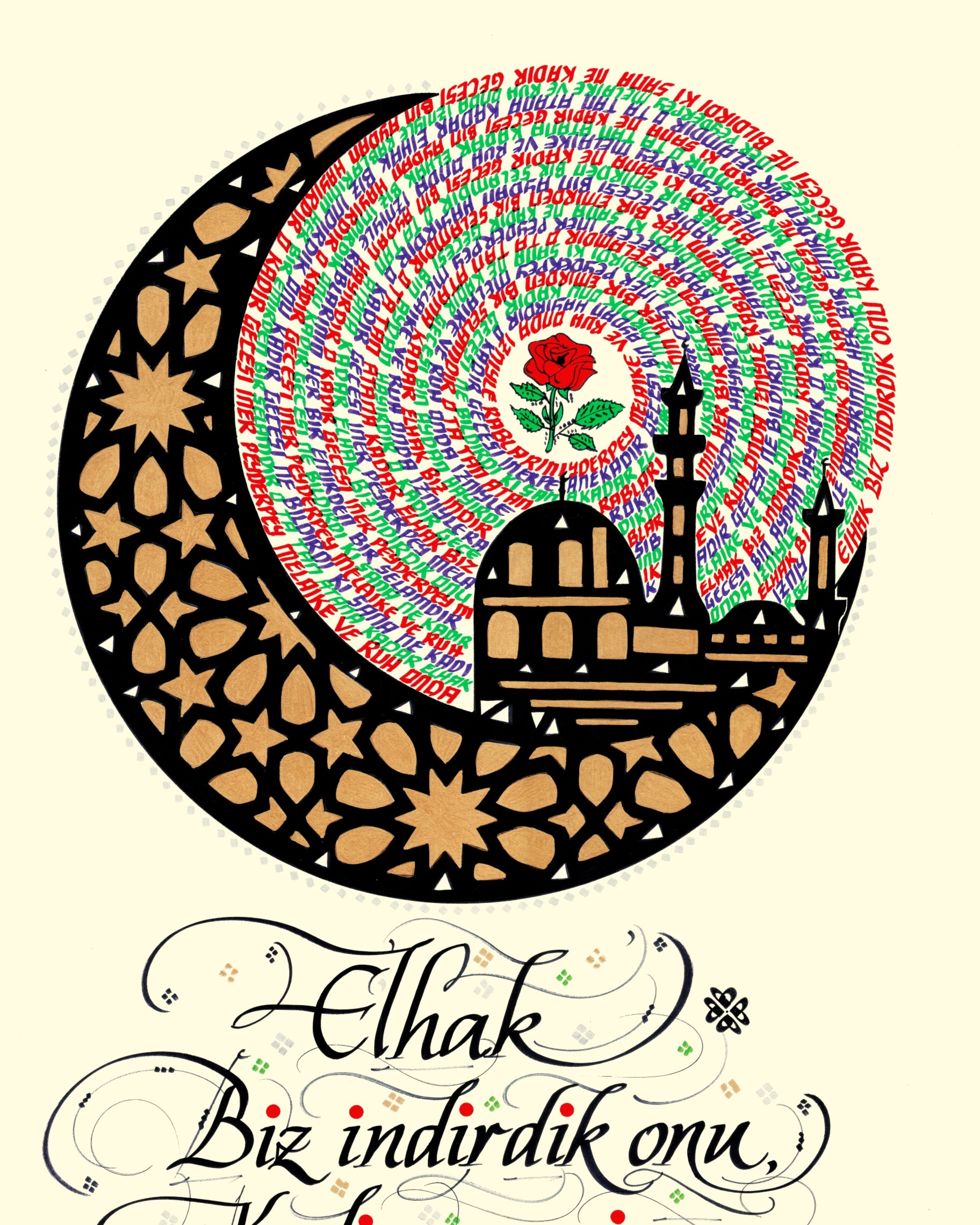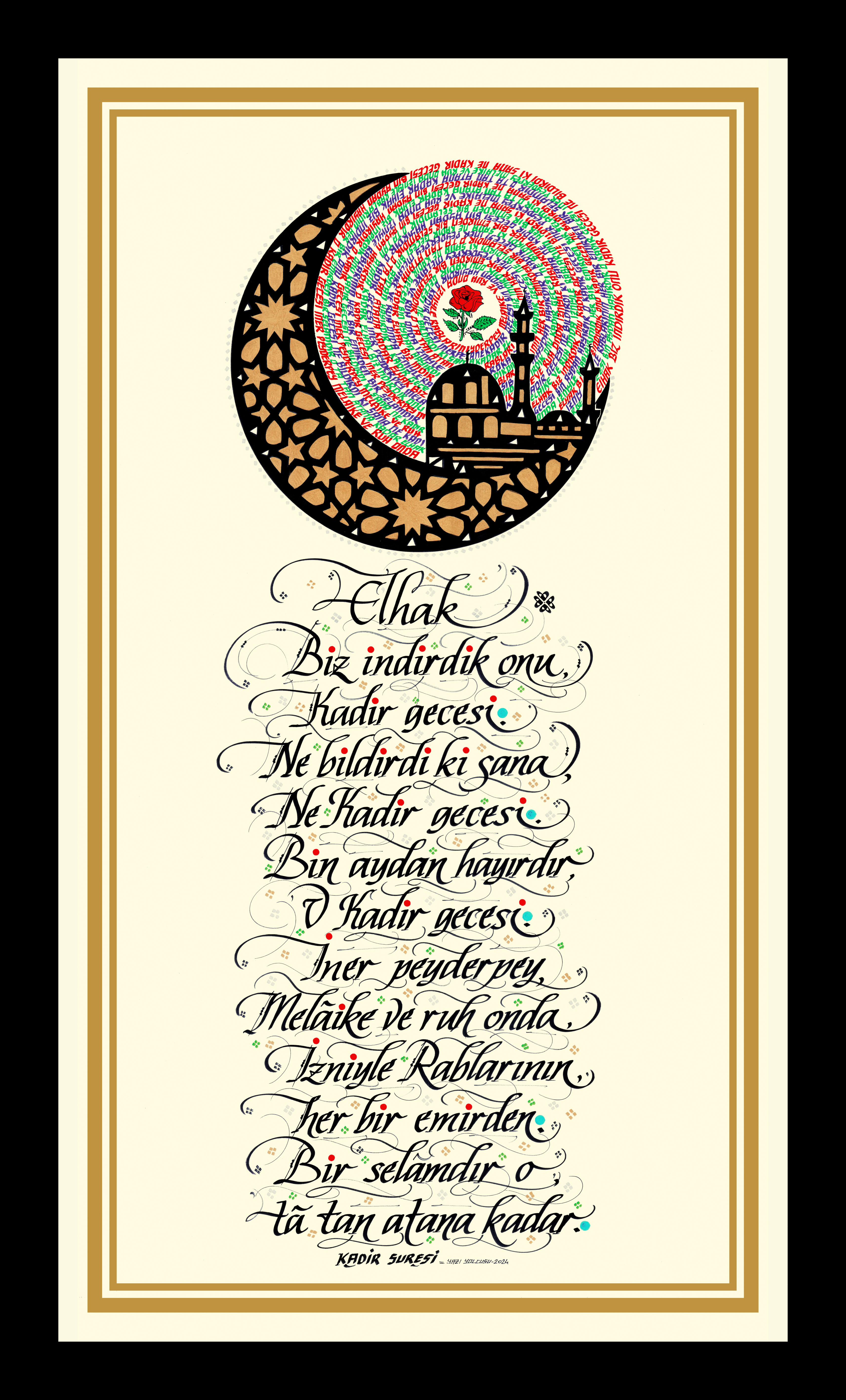 “Kadir Suresi”. Elmalılı Hamdi Yazır'ın, sadeleştirilmeyen özgün Türkçe meali. Kadir Suresi. Üst bölüme Hilal içerisine kırmızı, mor ve yeşil renklerle Surenin tekrarı yazılarak merkeze gül nakşedildi. Hilal içerisi siyahla boyanarak altın sarısıyla Selçuklu deseni ve Selçuklu Camisiyle bezendi. Surenin özgün Türkçe meali;