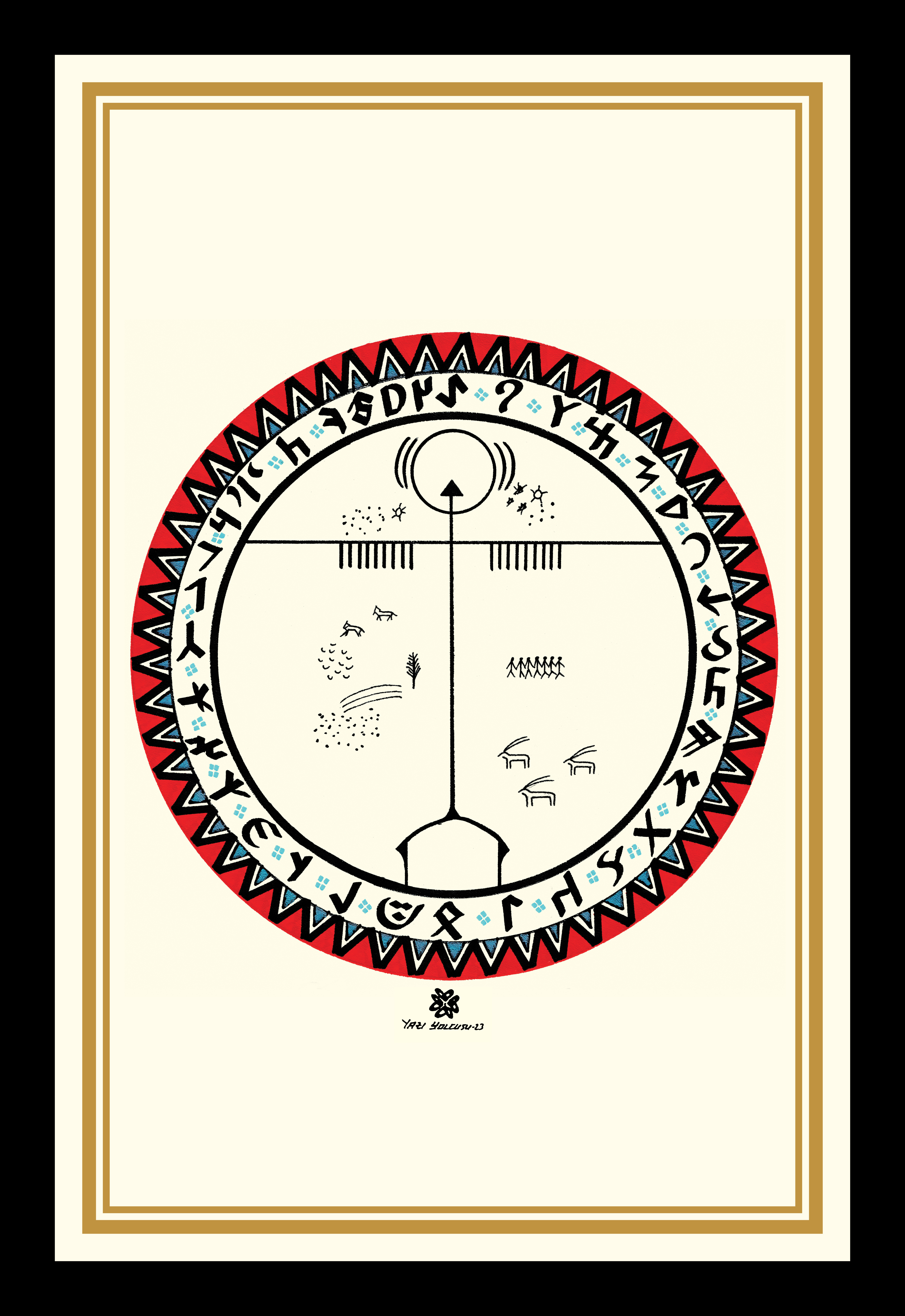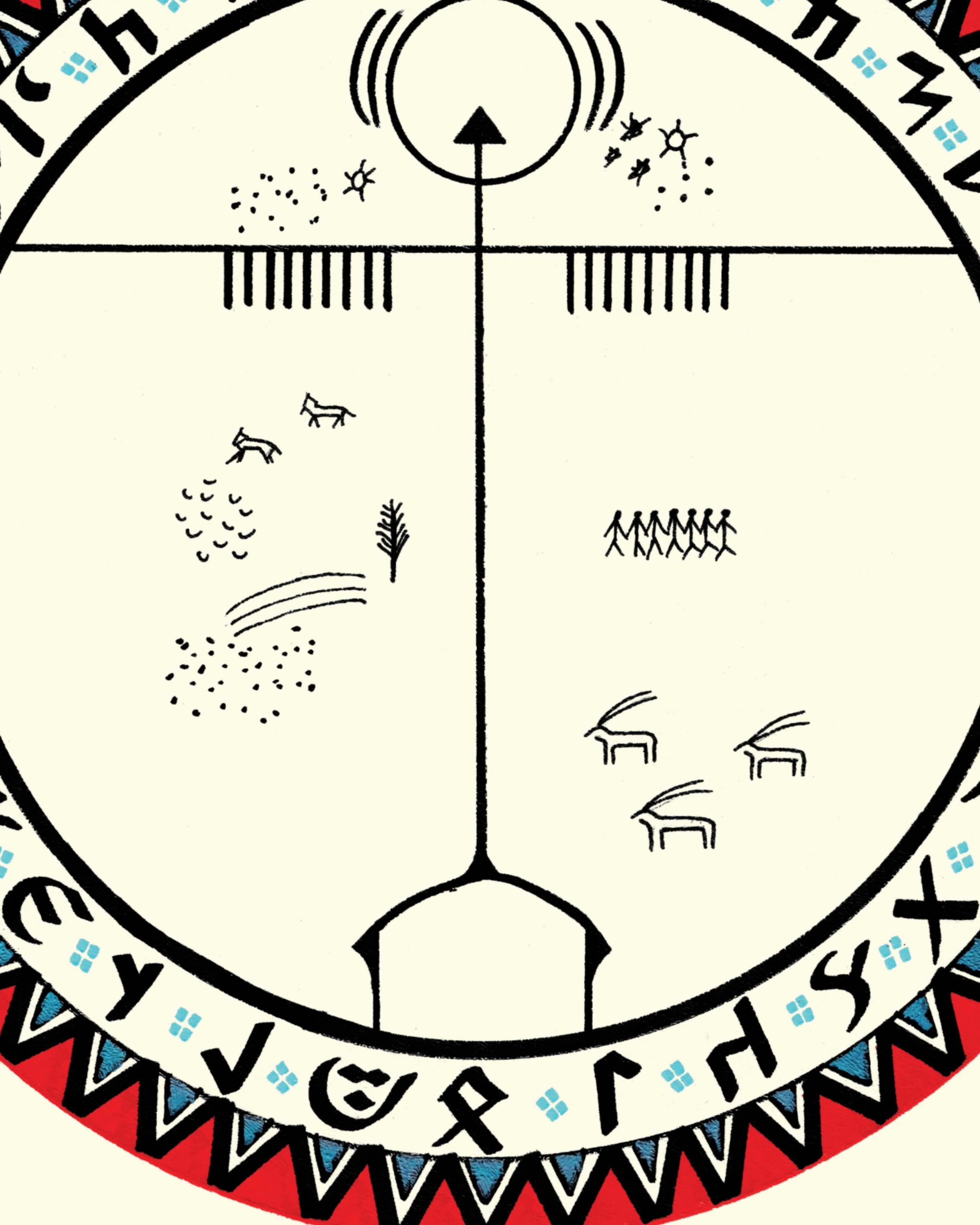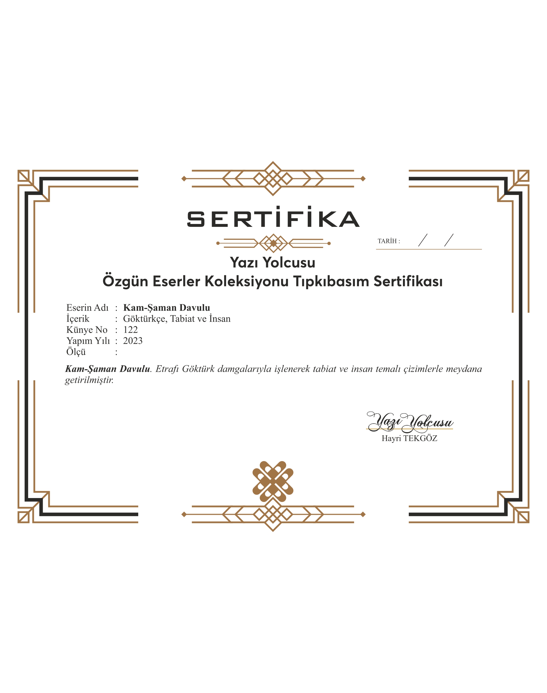 Davul etrafı Göktürk damgalarıyla işlenerek tabiat ve insan temalı çizimlerle meydana getirilmiştir.