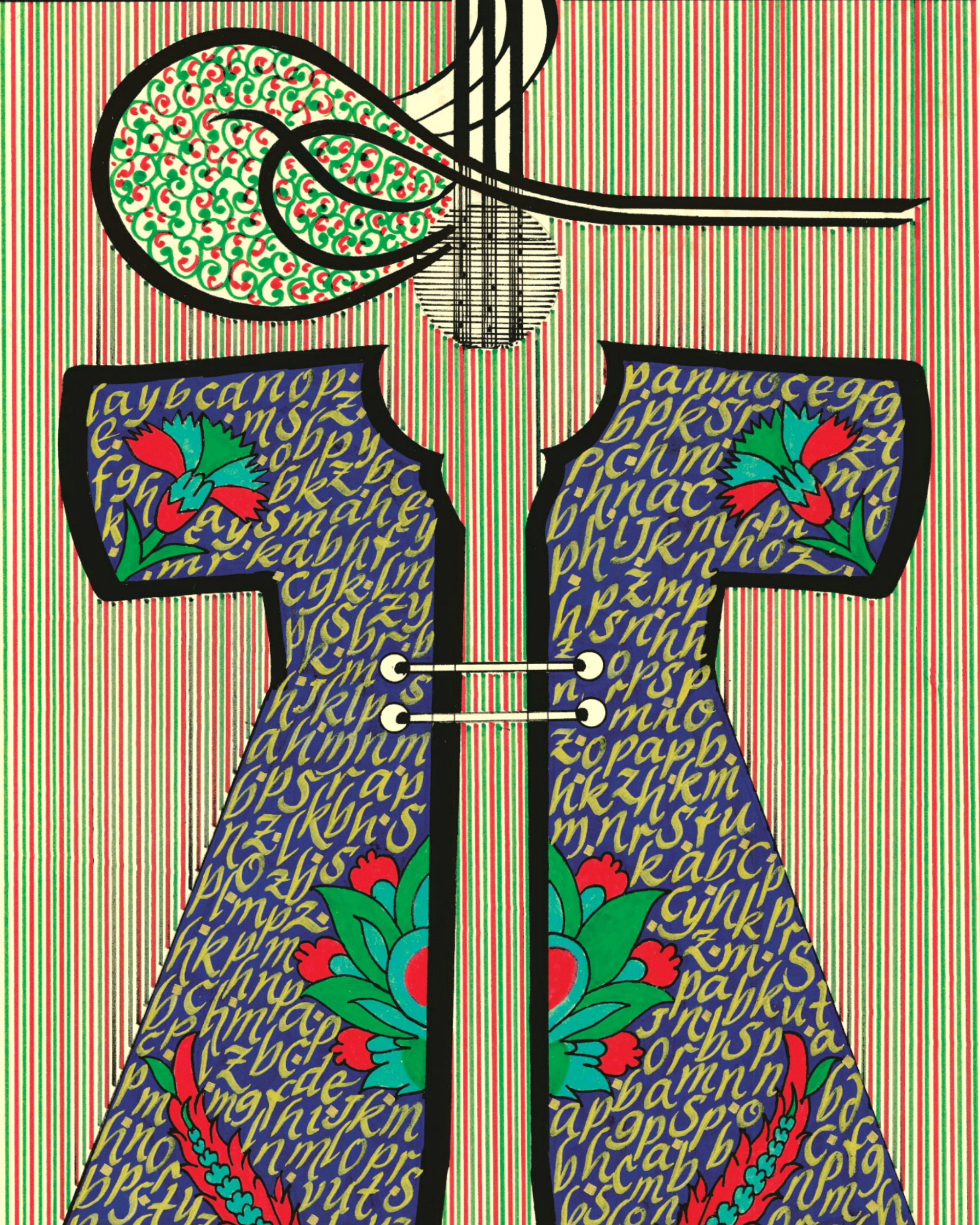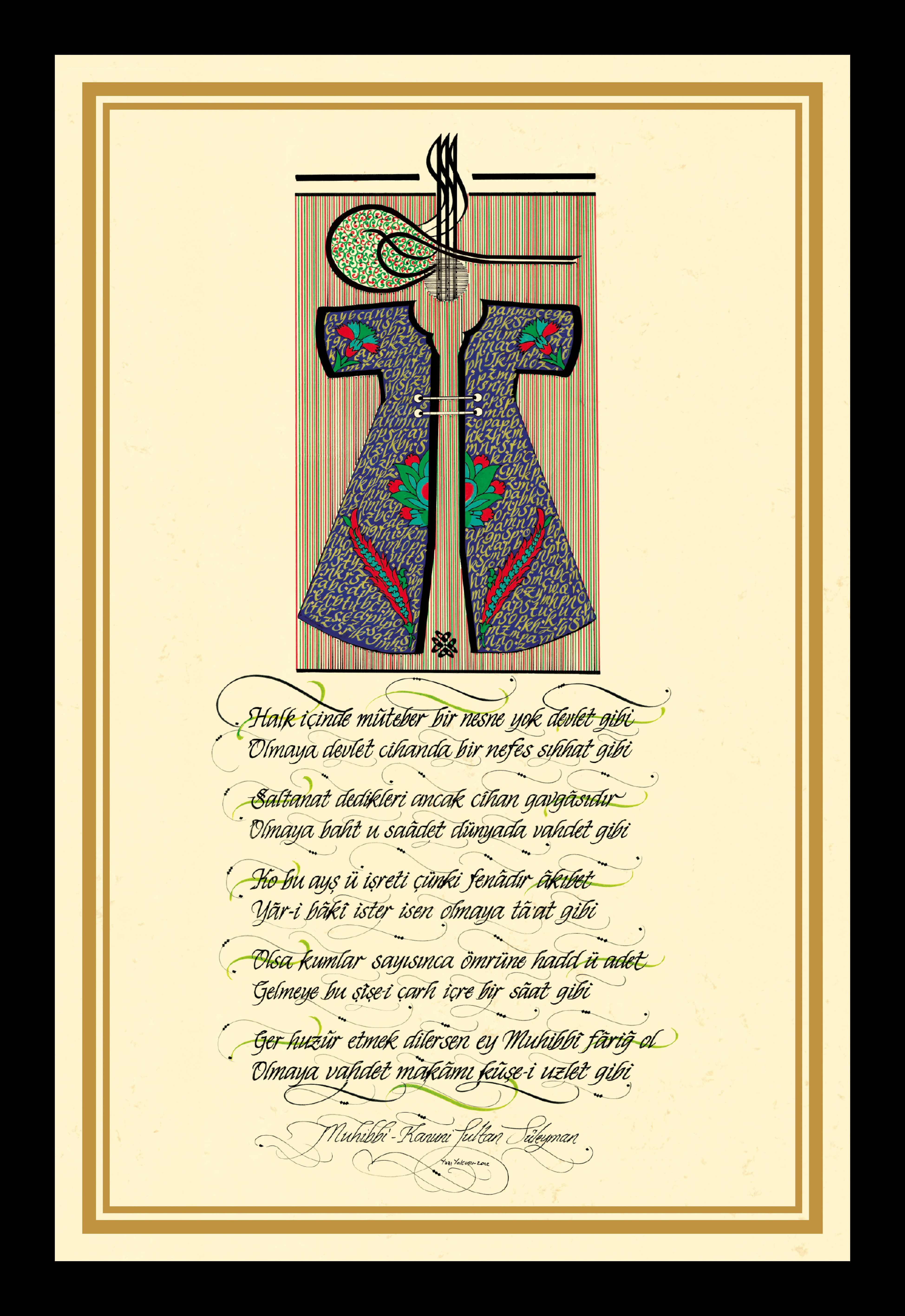 Sarı zemine Muhibbi mahlaslı Kanuni Sultan Süleyman’a ait yazılı şiir. Üstte Kanuni’nin Tuğrası çizilerek kaftan formuyla bezendi. Tuğranın yalnızca kalıbı tasarlandı ve kaftan içerisine çiçeklerle harfler işlenerek süslendi.