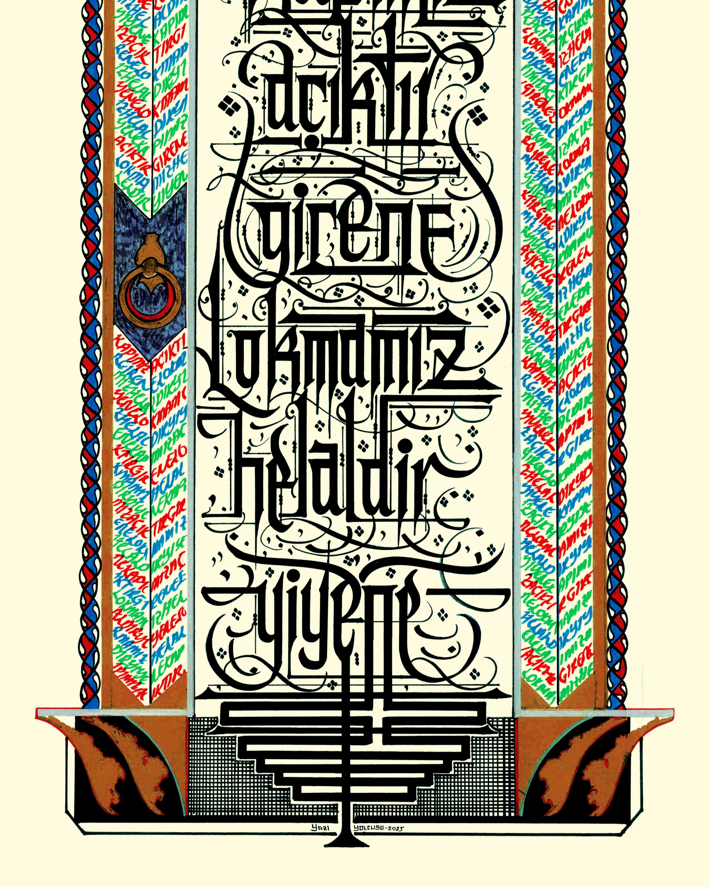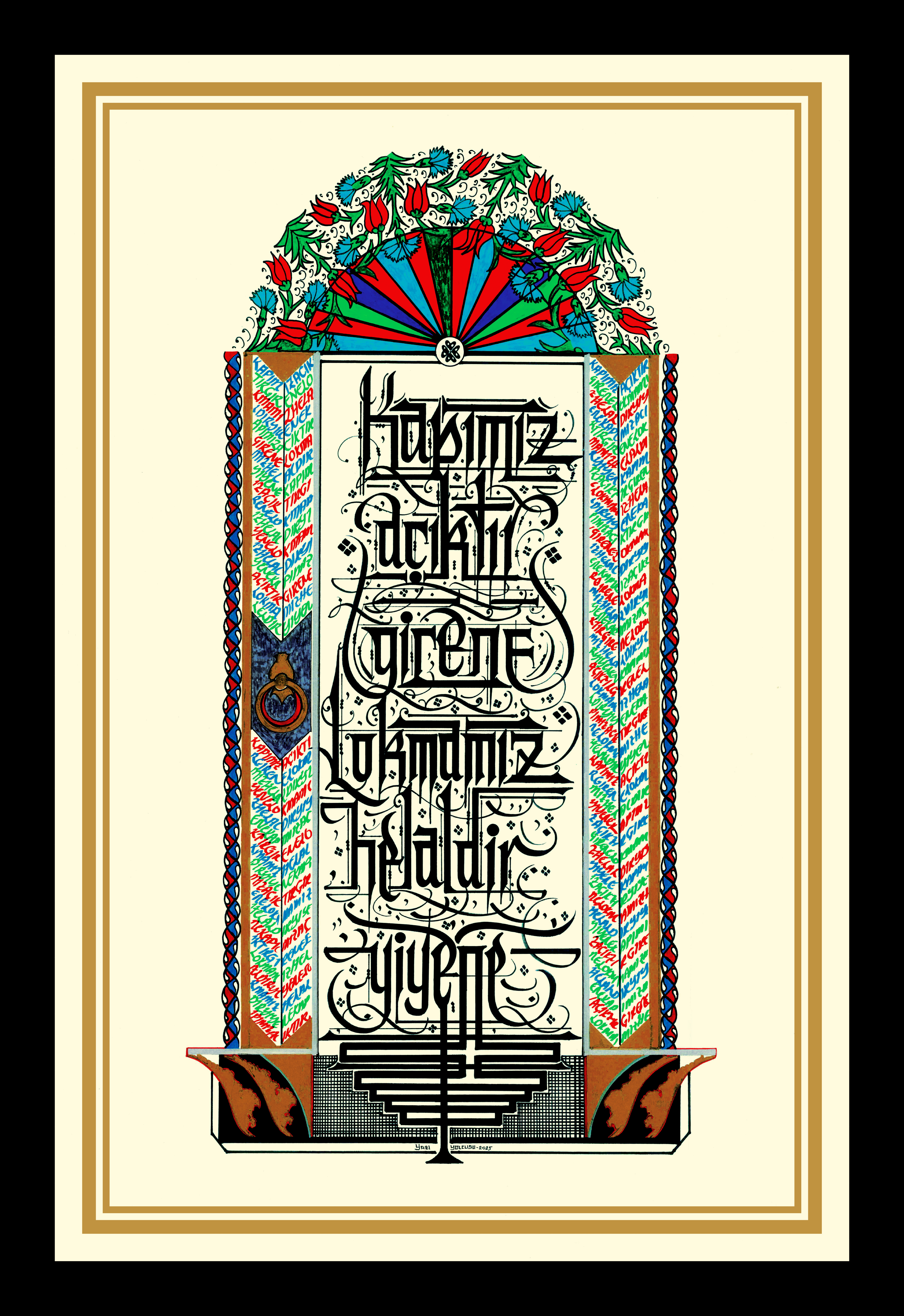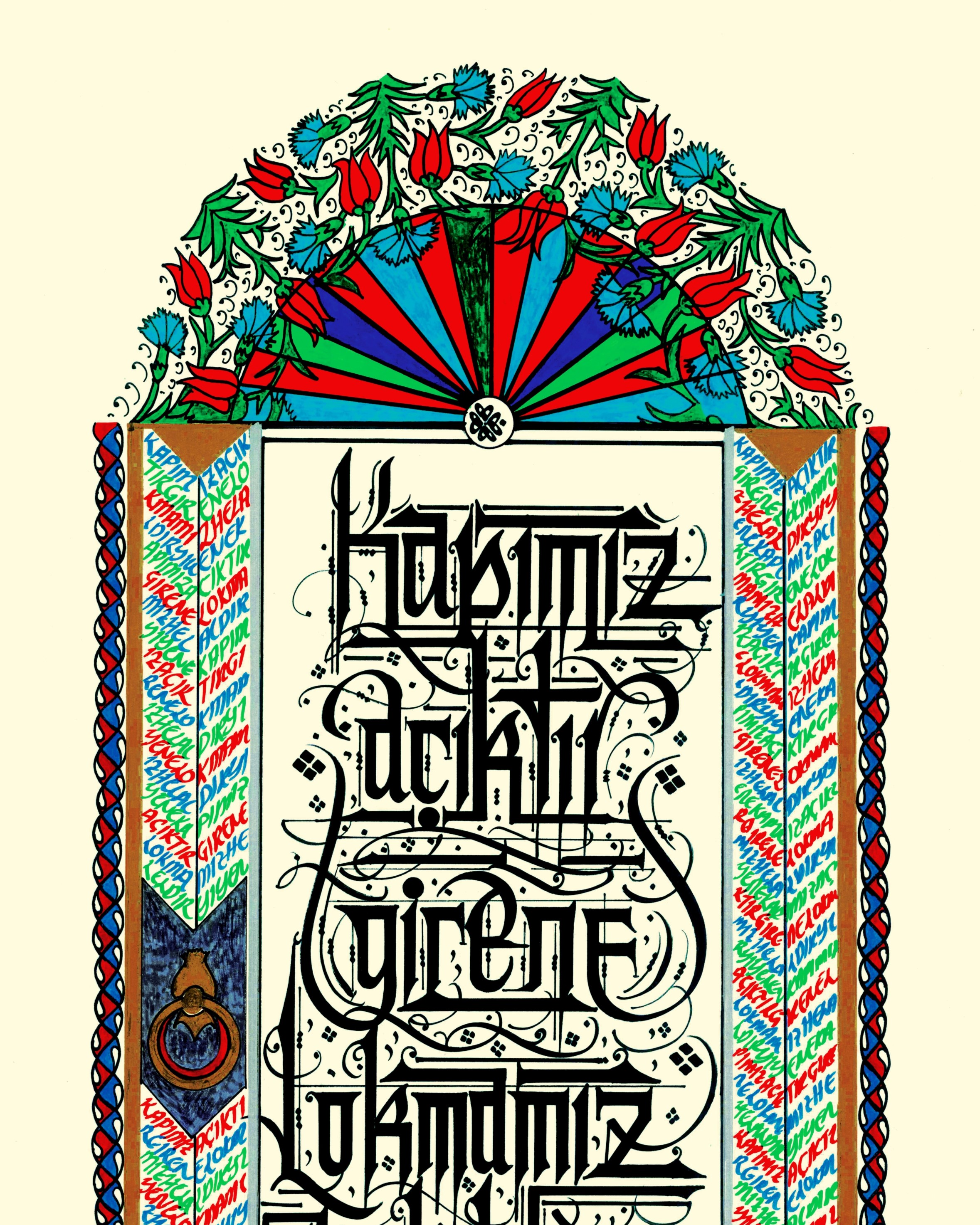 “Kapımız açıktır girene, Lokmamız helaldir yiyene” Karamanoğlu İbrahim Bey tarafından 1432’de yaptırılan İmaret Kümbeti’nin kapısında yer alan söz. Üst bölüm lale ve karanfil çiçekleriyle bezendi. Sağ ve sol kolonlar, yazılı olan sözün tekrarıyla meydana getirilerek kapı görselinde betimlendi.