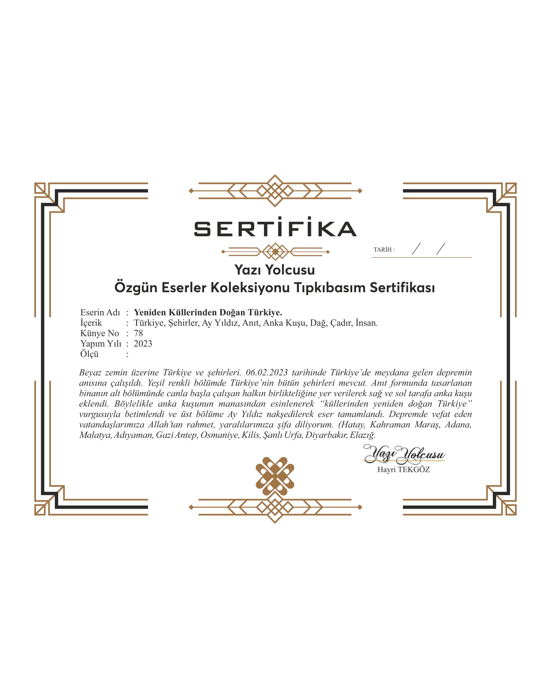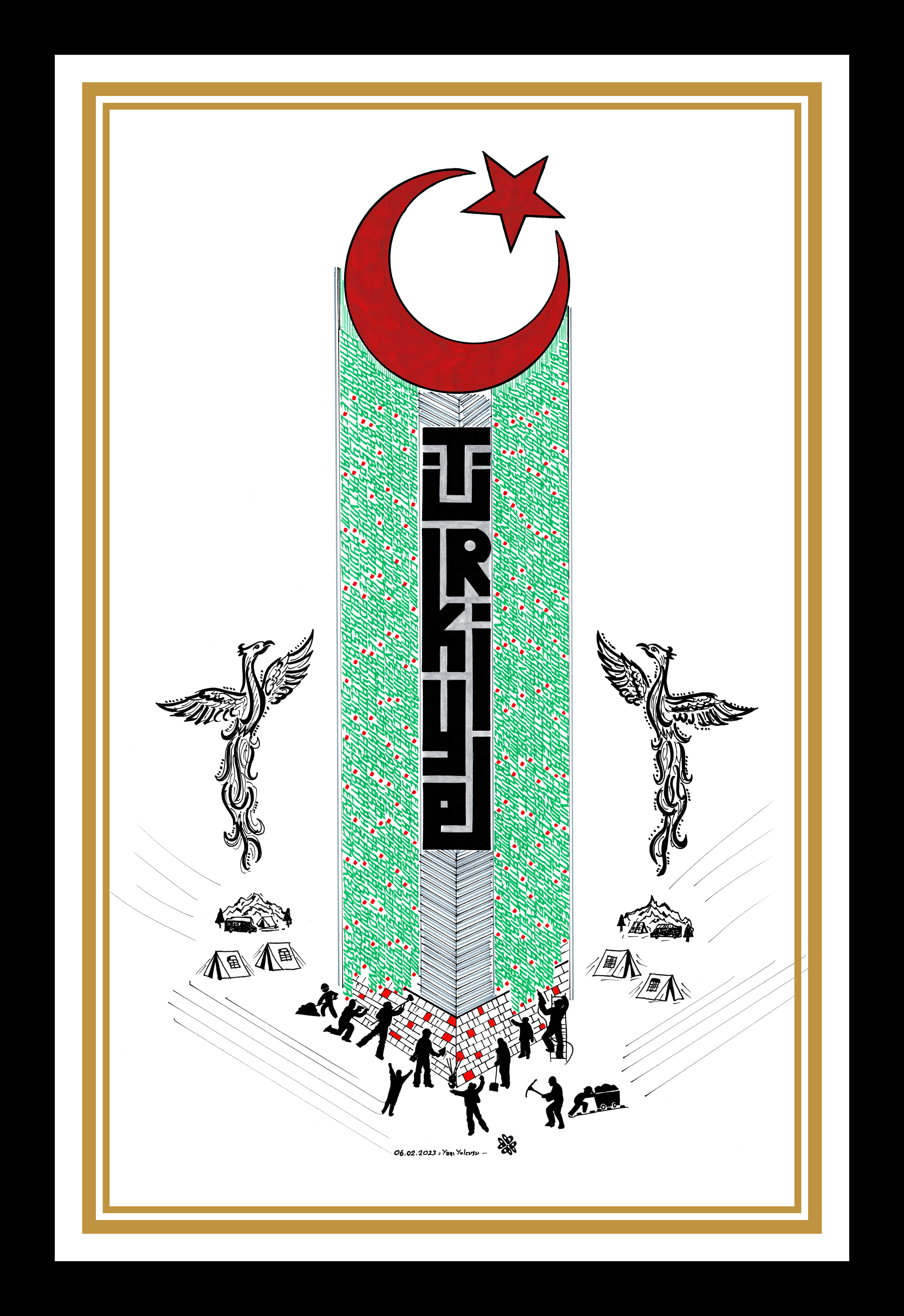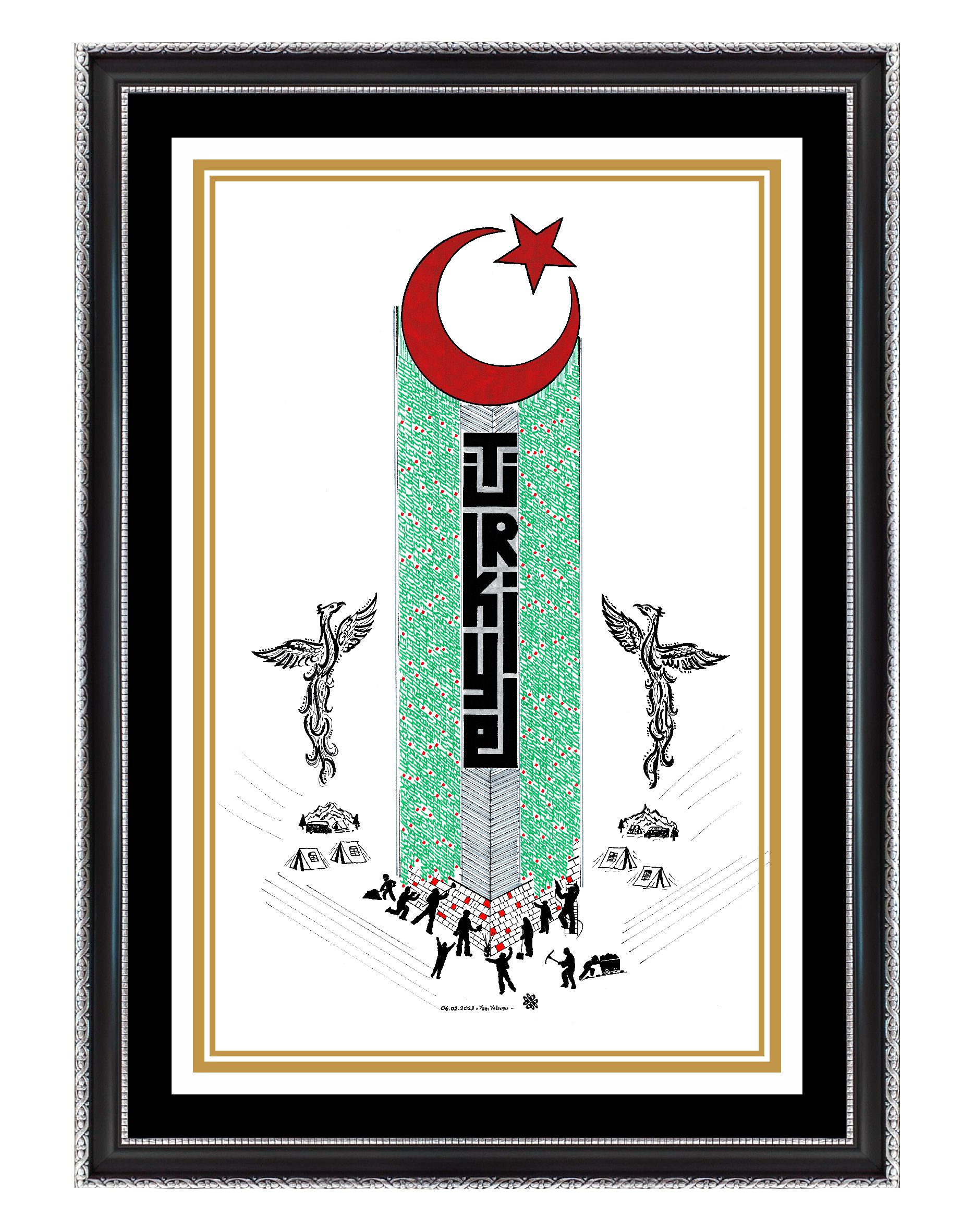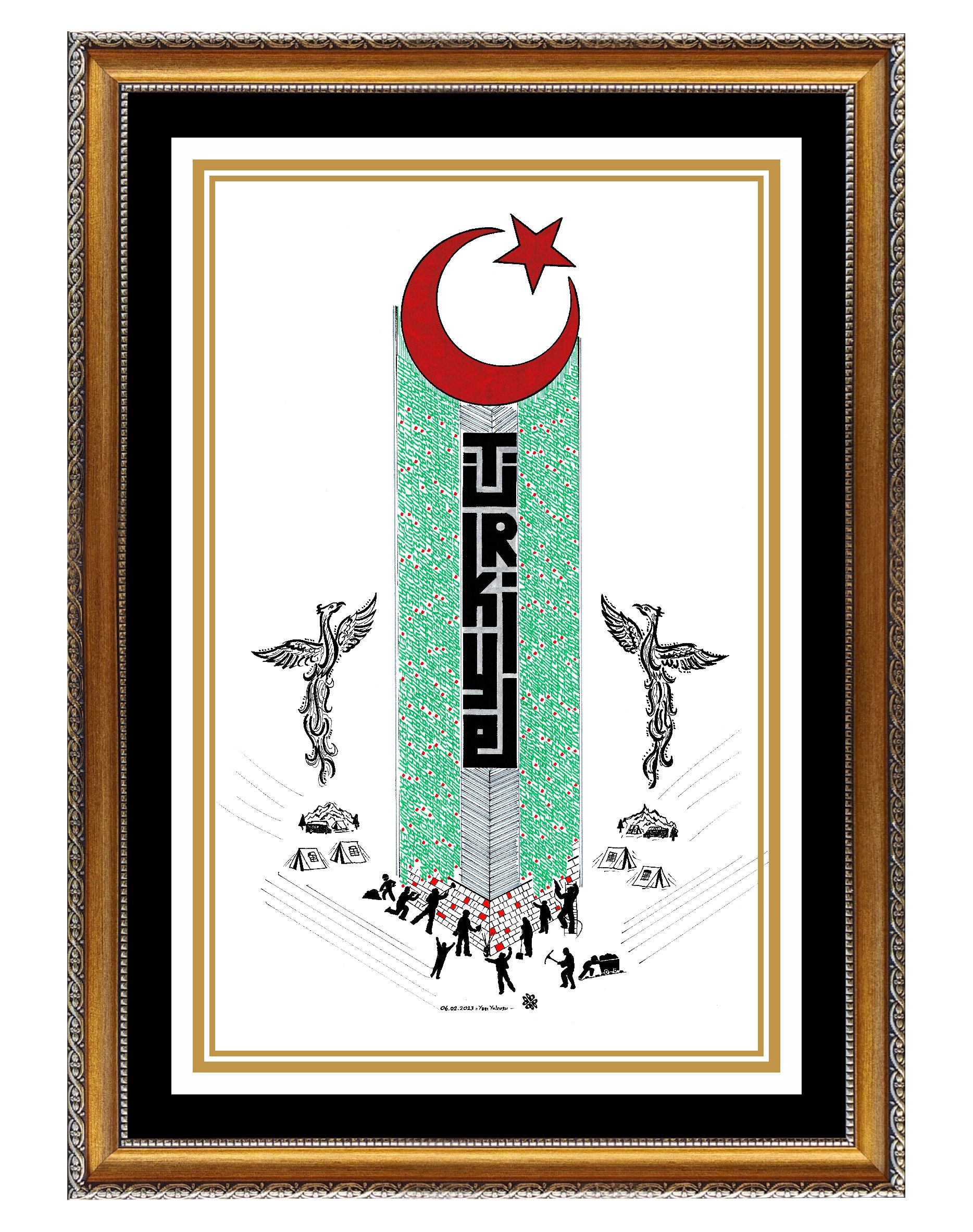 Beyaz zemin üzerine Türkiye ve şehirleri. 06.02.2023 tarihinde Türkiye’de meydana gelen depremin anısına çalışıldı. Yeşil renkli bölümde Türkiye’nin bütün şehirleri mevcut. Anıt formunda tasarlanan binanın alt bölümünde canla başla çalışan halkın birlikteliğine yer verilerek sağ ve sol tarafa anka kuşu eklendi. Böylelikle anka kuşunun manasından esinlenerek “küllerinden yeniden doğan Türkiye” vurgusuyla betimlendi ve üst bölüme Ay Yıldız nakşedilerek eser tamamlandı. Depremde vefat eden vatandaşlarımıza Allah’tan rahmet, yaralılarımıza şifa diliyorum. (Hatay, Kahraman Maraş, Adana, Malatya, Adıyaman, Gazi Antep, Osmaniye, Kilis, Şanlı Urfa, Diyarbakır, Elazığ)