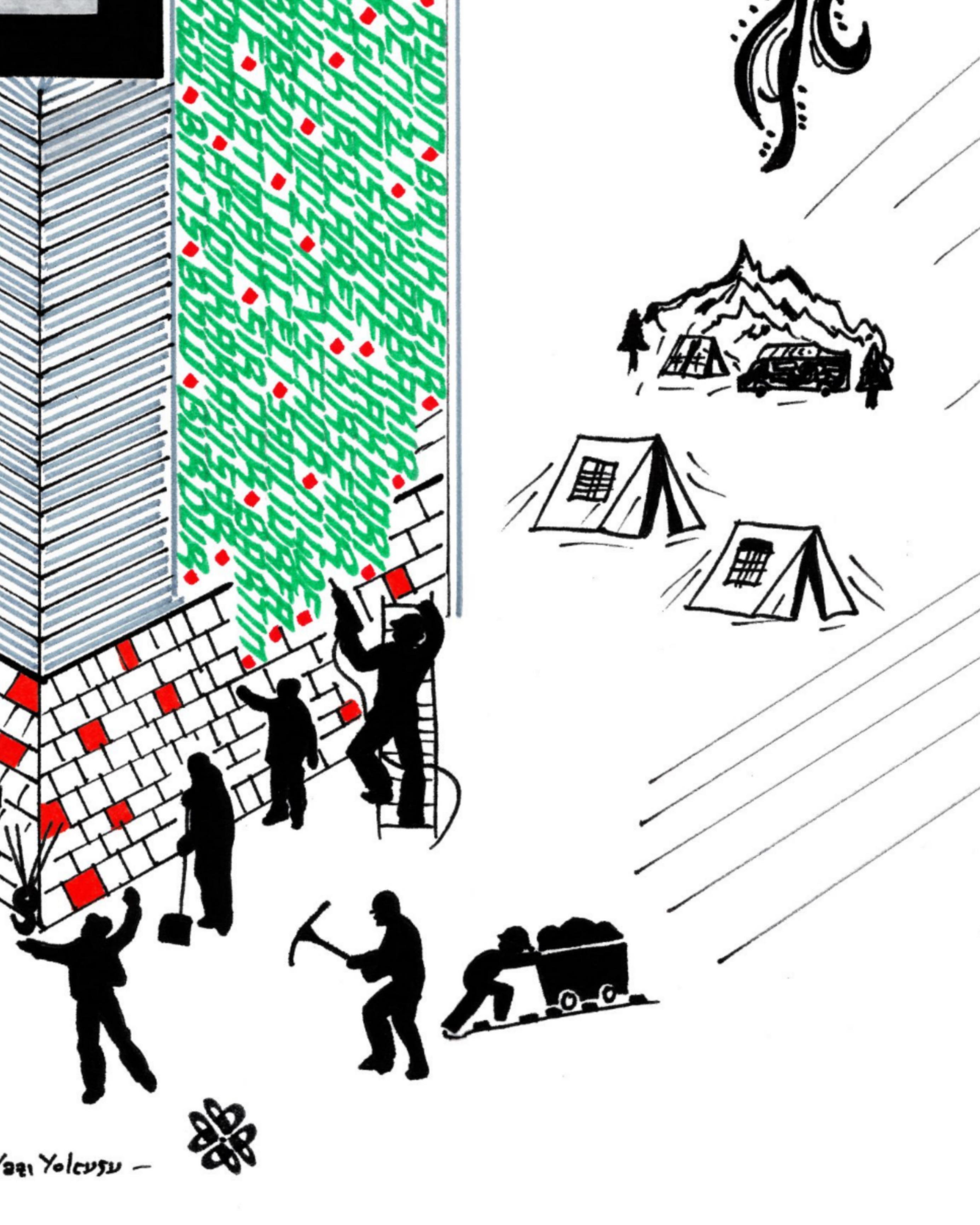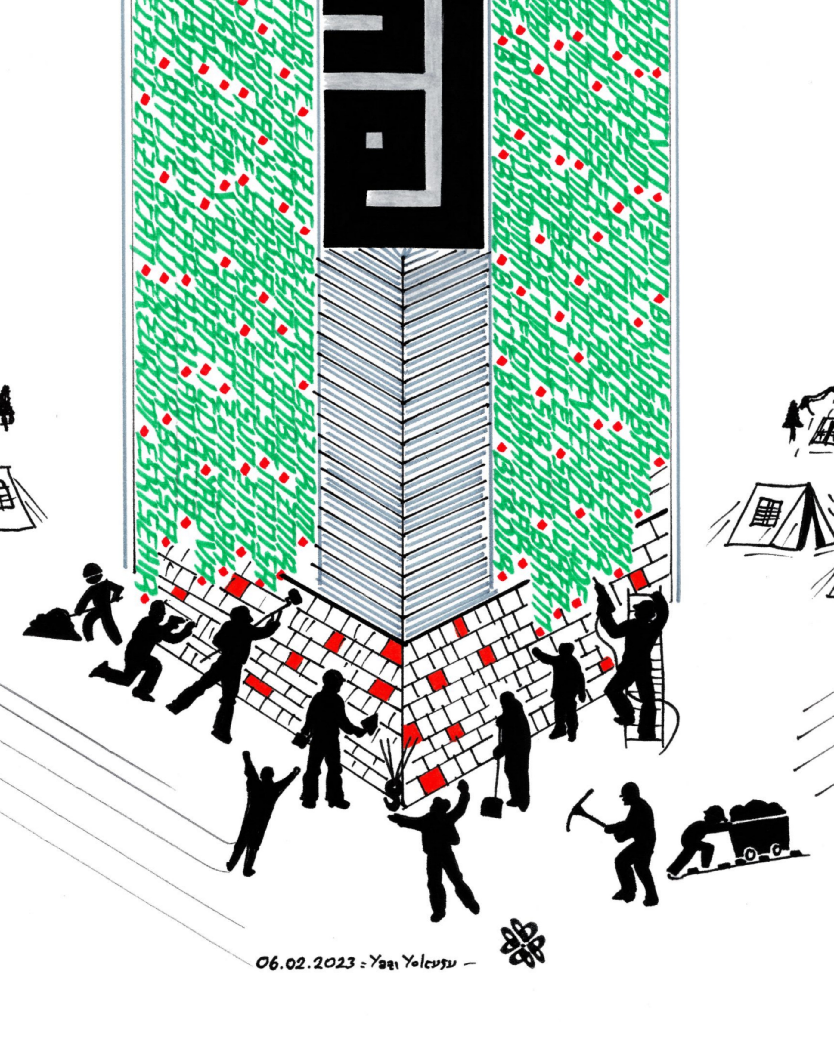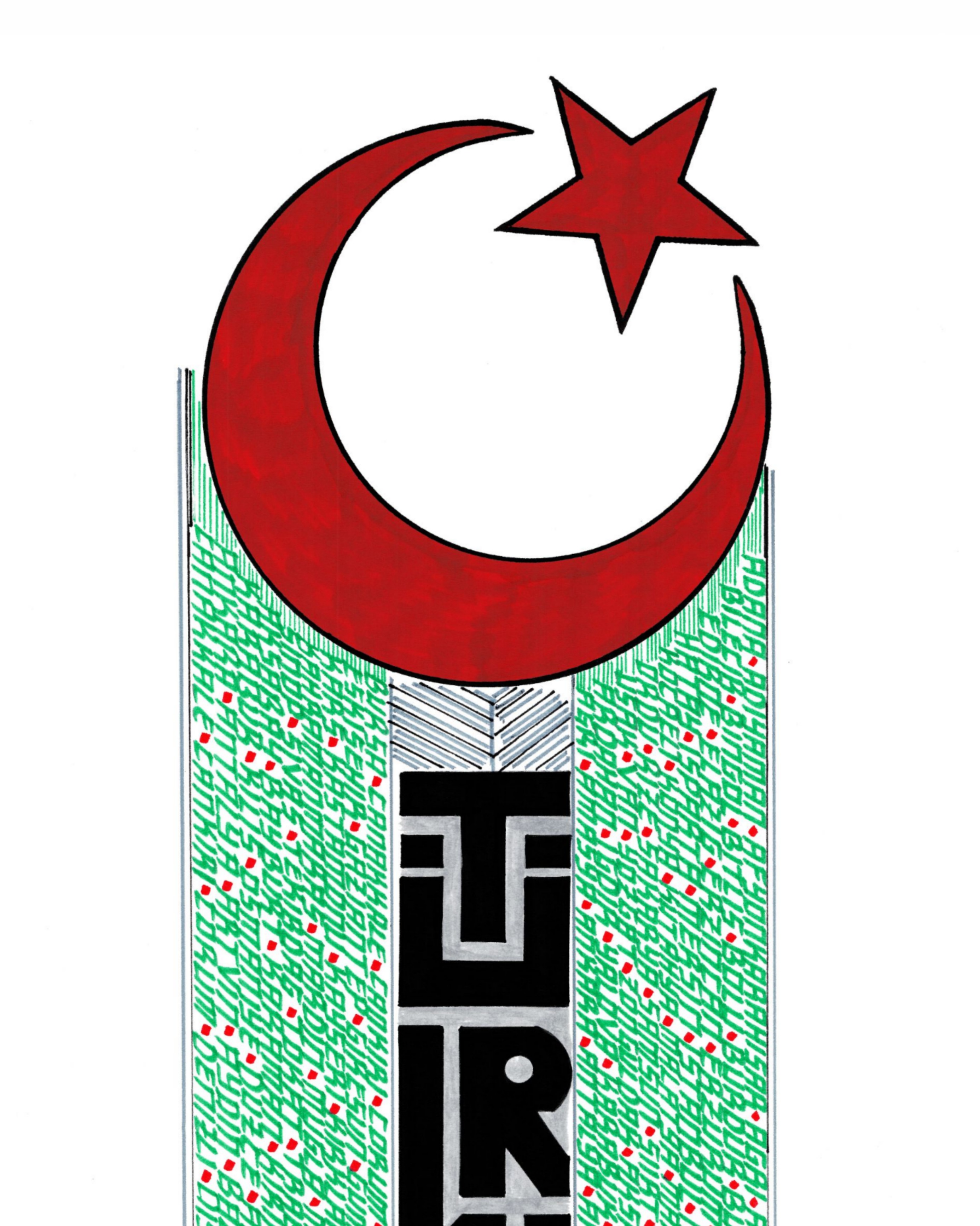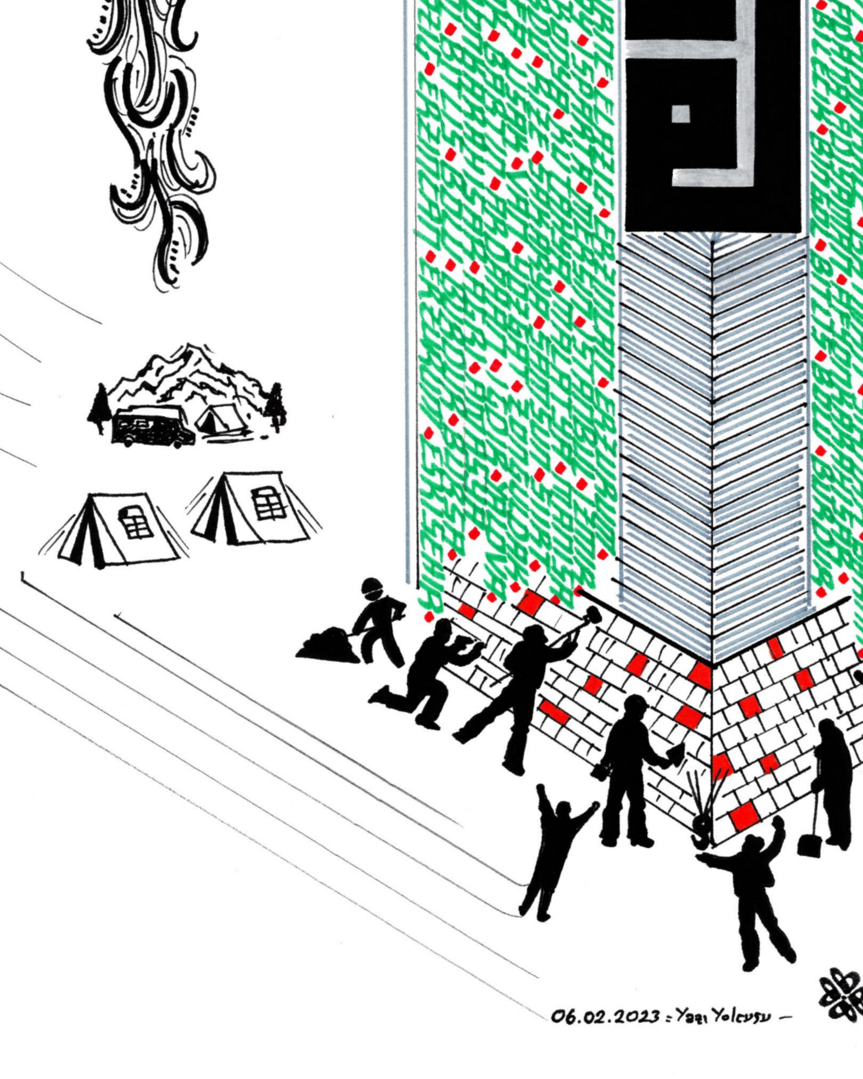 Beyaz zemin üzerine Türkiye ve şehirleri. 06.02.2023 tarihinde Türkiye’de meydana gelen depremin anısına çalışıldı. Yeşil renkli bölümde Türkiye’nin bütün şehirleri mevcut. Anıt formunda tasarlanan binanın alt bölümünde canla başla çalışan halkın birlikteliğine yer verilerek sağ ve sol tarafa anka kuşu eklendi. Böylelikle anka kuşunun manasından esinlenerek “küllerinden yeniden doğan Türkiye” vurgusuyla betimlendi ve üst bölüme Ay Yıldız nakşedilerek eser tamamlandı. Depremde vefat eden vatandaşlarımıza Allah’tan rahmet, yaralılarımıza şifa diliyorum. (Hatay, Kahraman Maraş, Adana, Malatya, Adıyaman, Gazi Antep, Osmaniye, Kilis, Şanlı Urfa, Diyarbakır, Elazığ)
