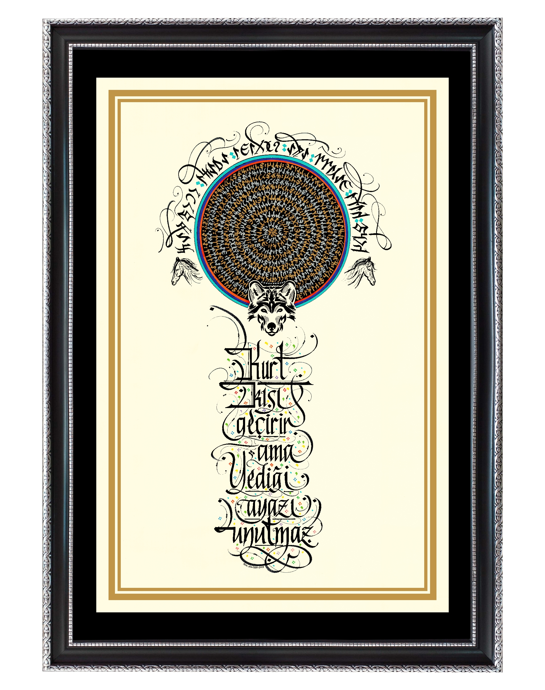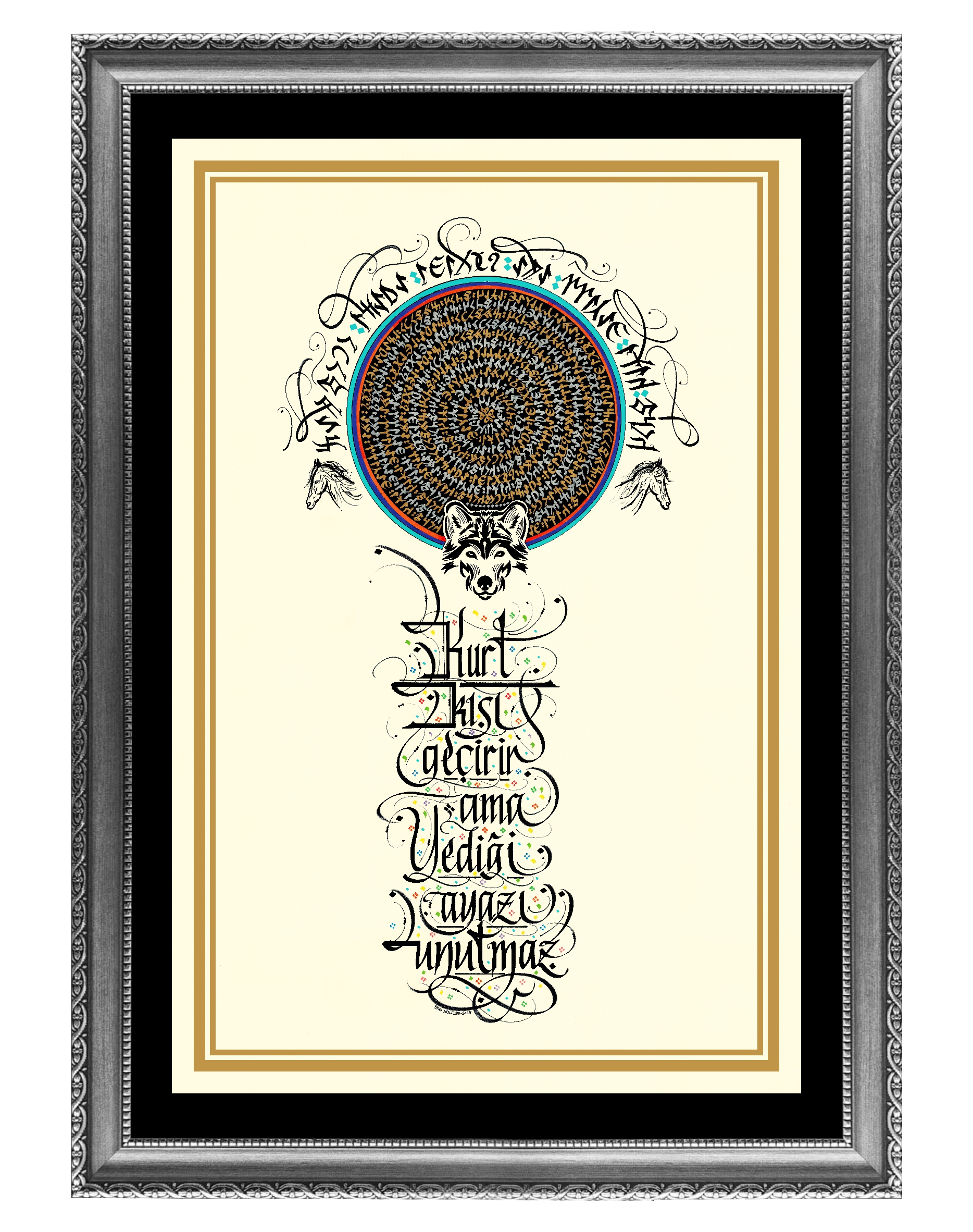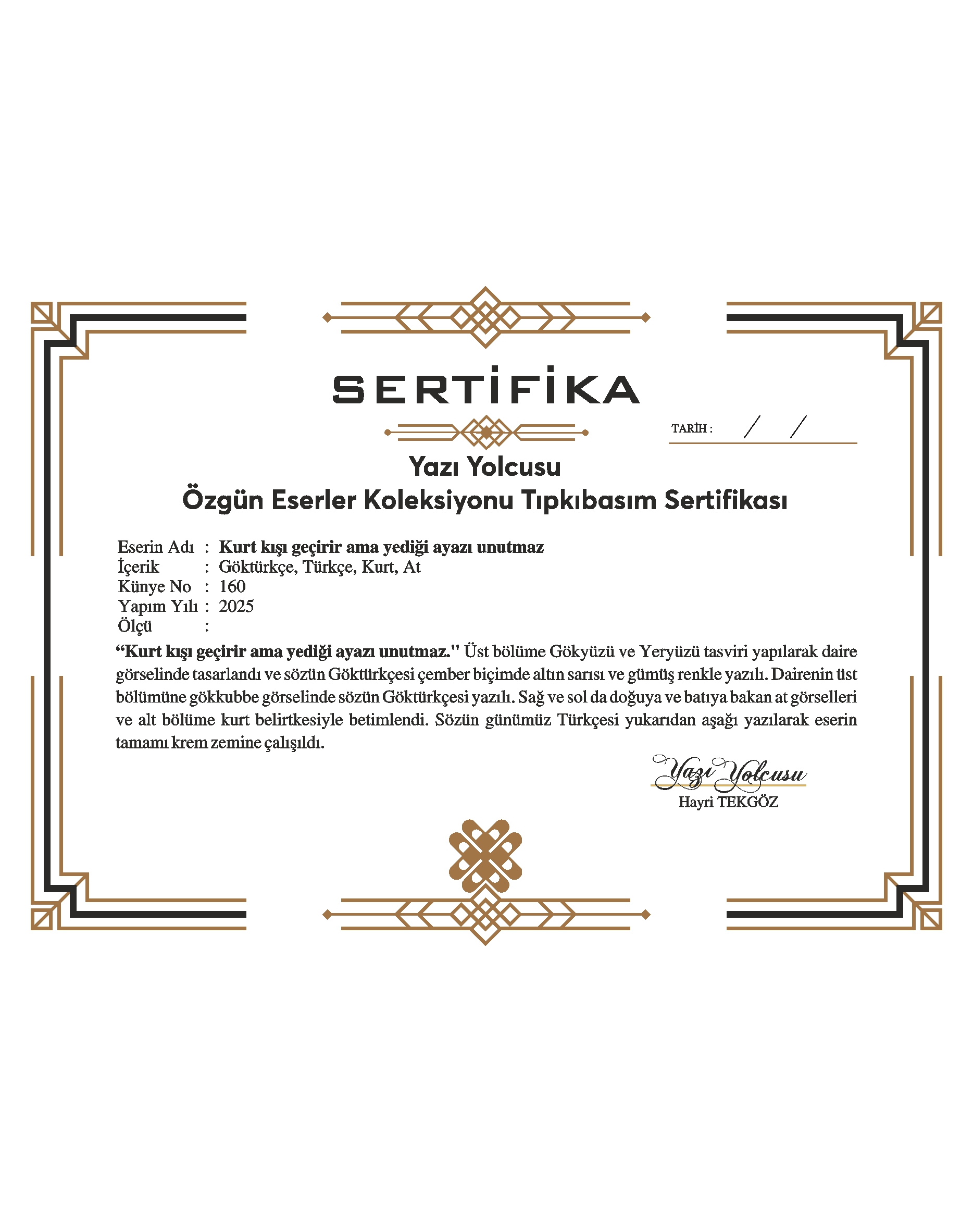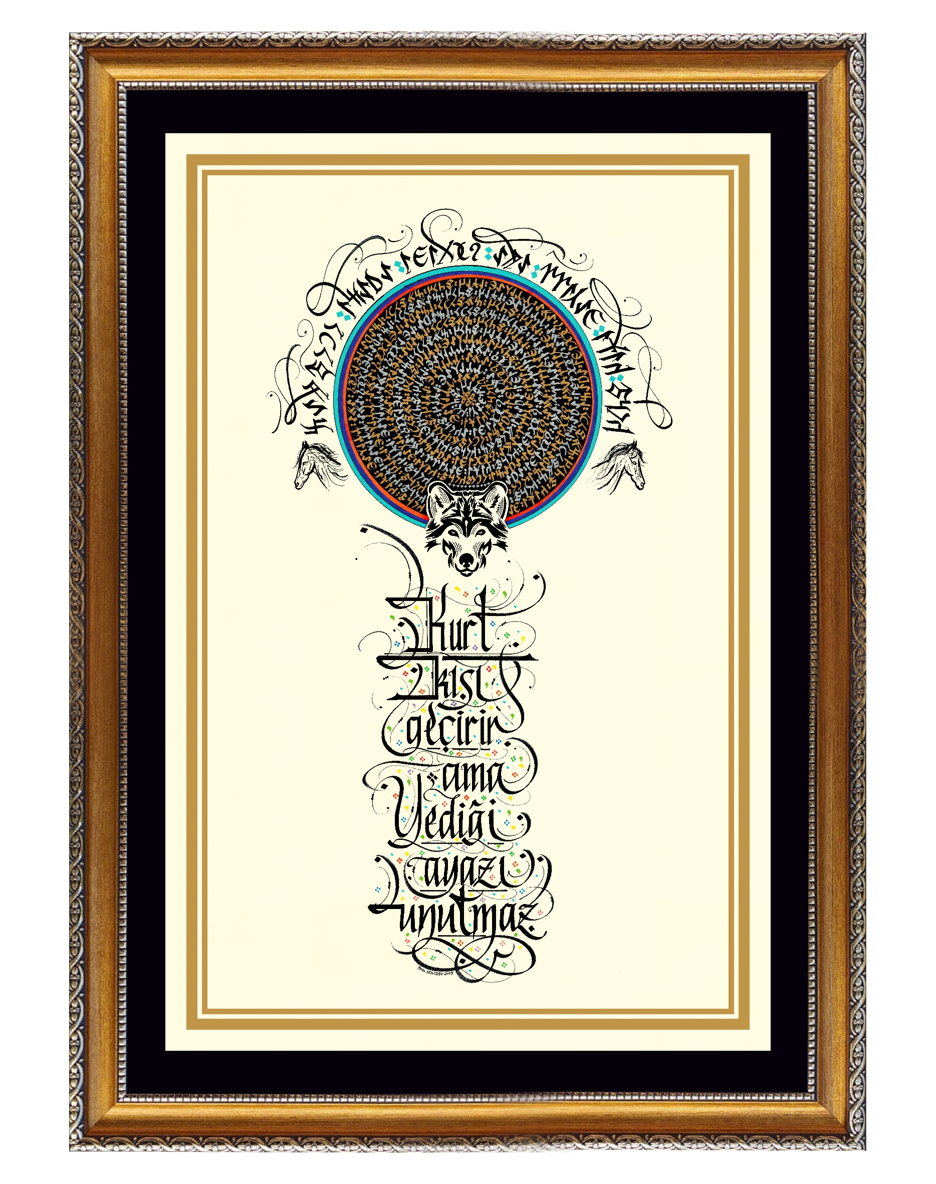 “Kurt kışı geçirir ama yediği ayazı unutmaz.” Üst bölüme Gökyüzü ve Yeryüzü tasviri yapılarak daire görselinde tasarlandı ve sözün Göktürkçesi çember biçimde altın sarısı ve gümüş renkle yazılı. Dairenin üst bölümüne gökkubbe görselinde sözün Göktürkçesi yazılı. Sağ ve sol da doğuya ve batıya bakan at görselleri ve alt bölüme kurt belirtkesiyle betimlendi. Sözün günümüz Türkçesi yukarıdan aşağı yazılarak eserin tamamı krem zemine çalışıldı.