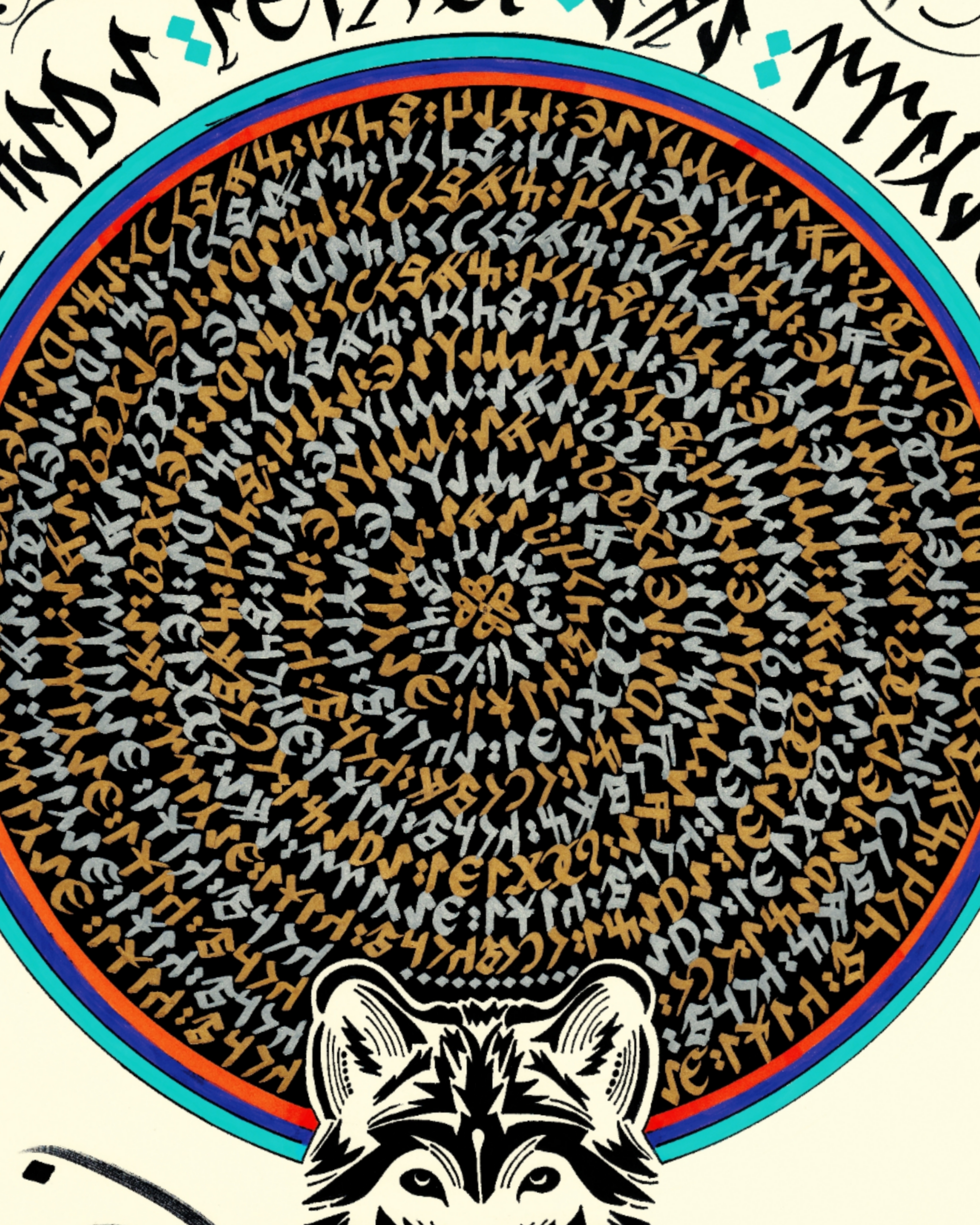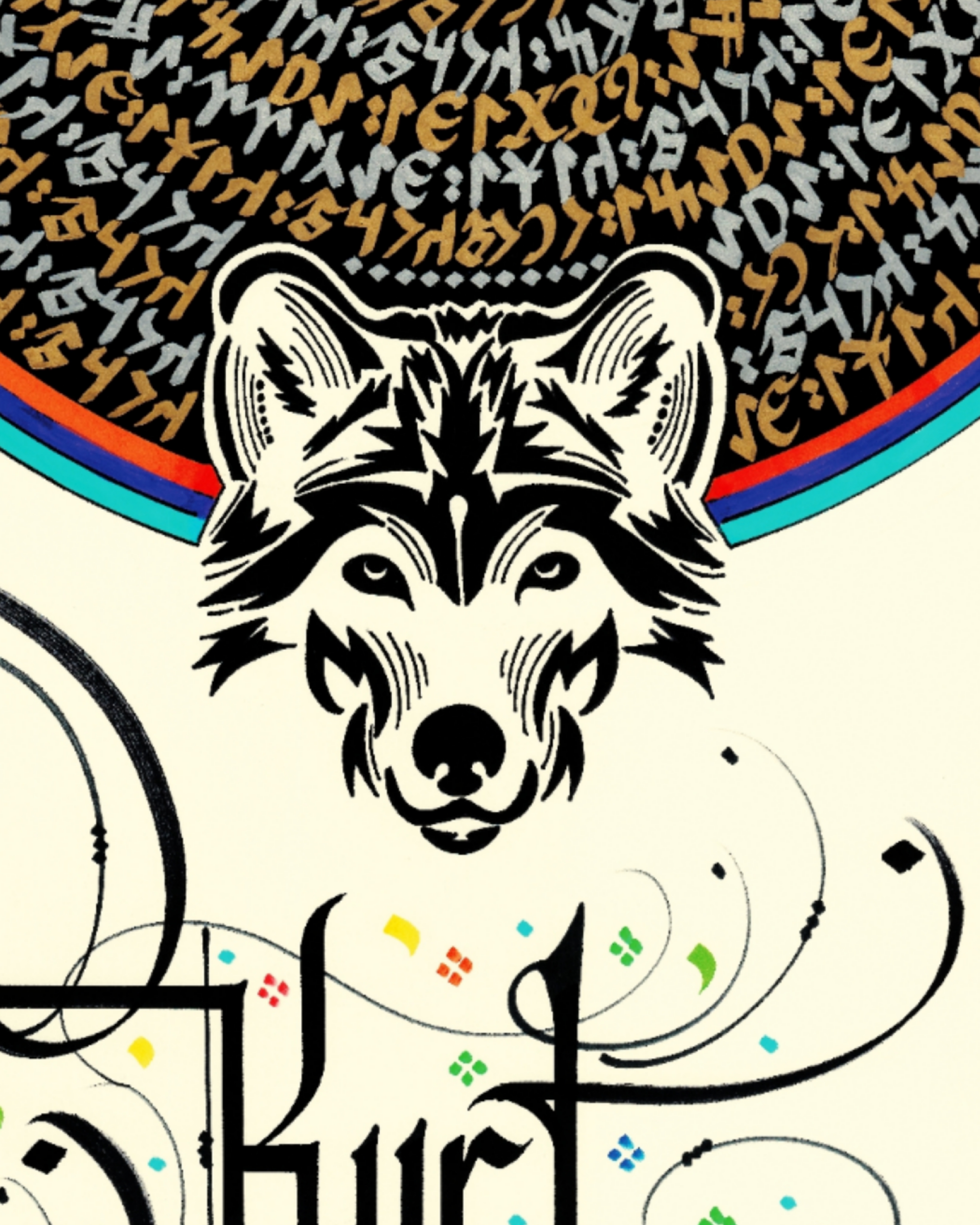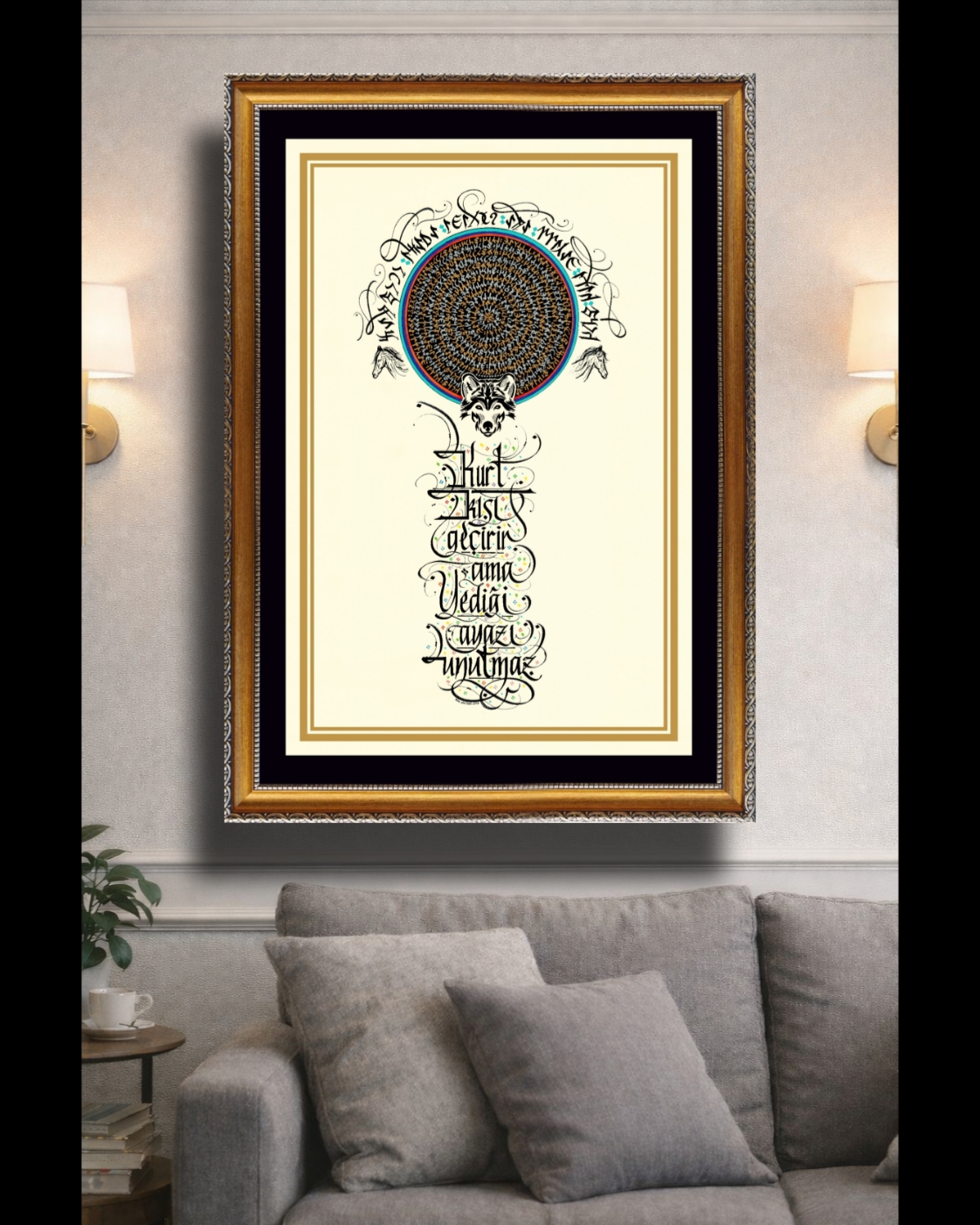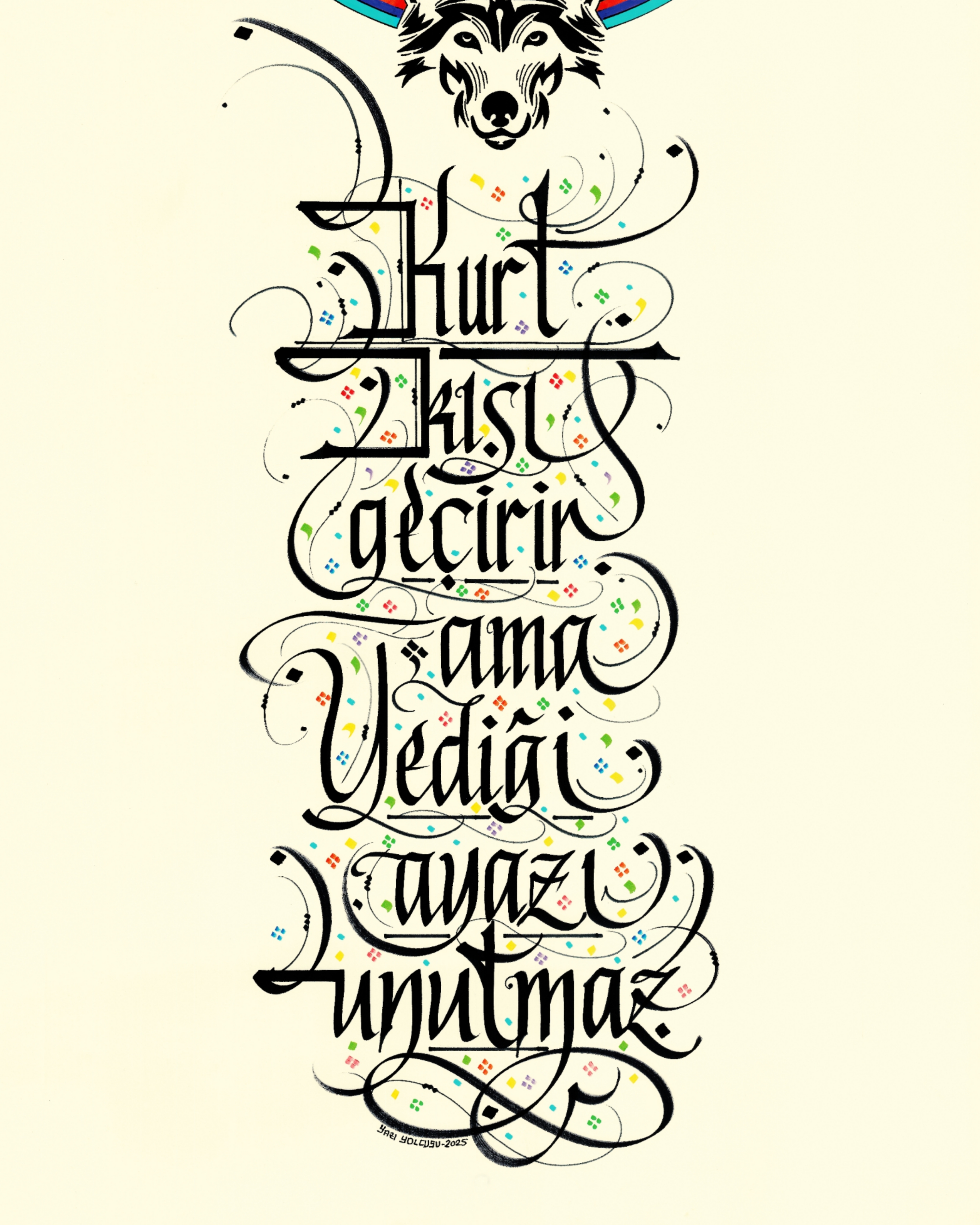“Kurt kışı geçirir ama yediği ayazı unutmaz.” Üst bölüme Gökyüzü ve Yeryüzü tasviri yapılarak daire görselinde tasarlandı ve sözün Göktürkçesi çember biçimde altın sarısı ve gümüş renkle yazılı. Dairenin üst bölümüne gökkubbe görselinde sözün Göktürkçesi yazılı. Sağ ve sol da doğuya ve batıya bakan at görselleri ve alt bölüme kurt belirtkesiyle betimlendi. Sözün günümüz Türkçesi yukarıdan aşağı yazılarak eserin tamamı krem zemine çalışıldı.