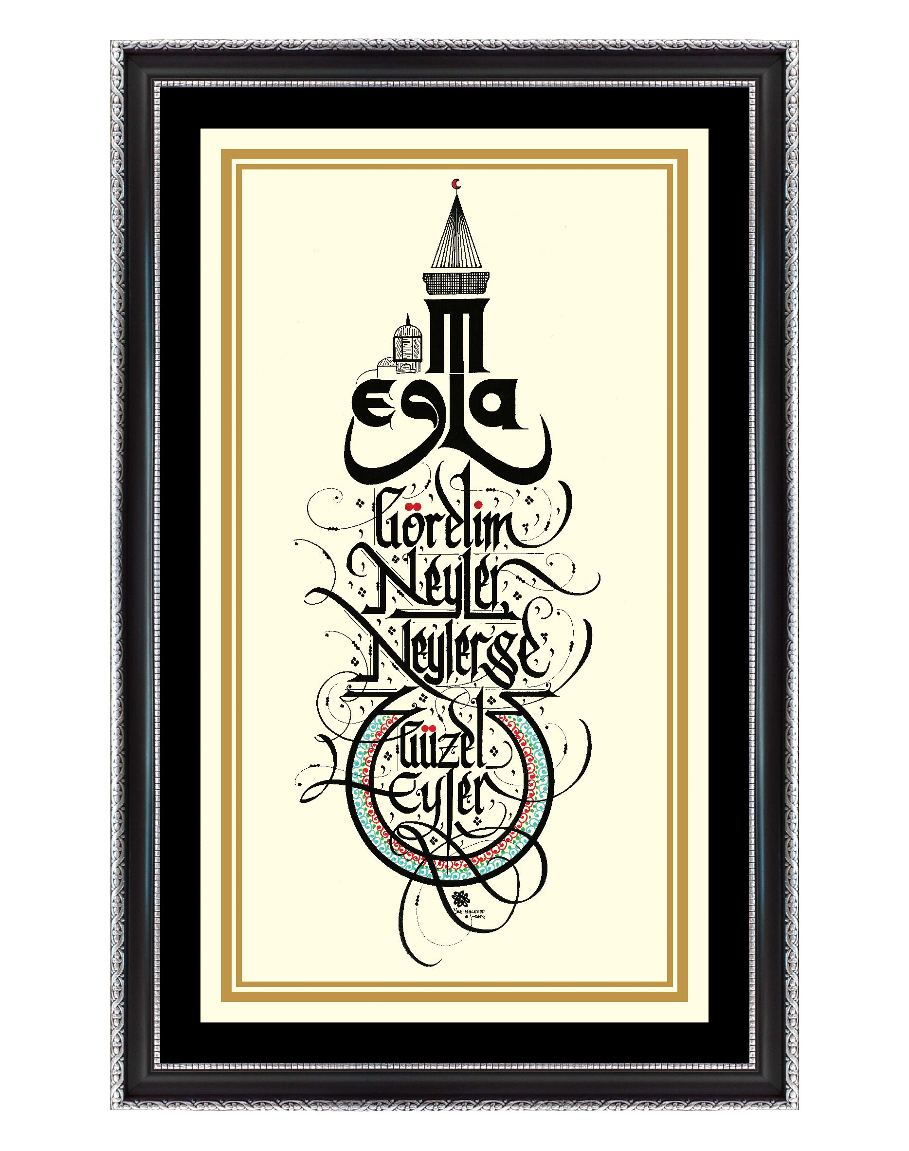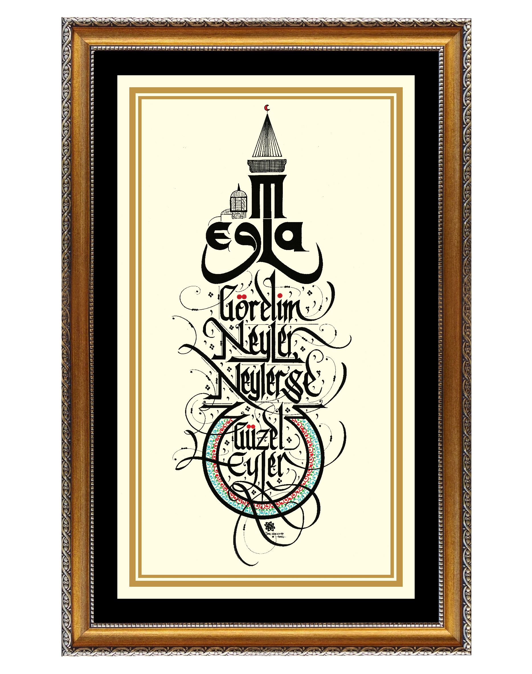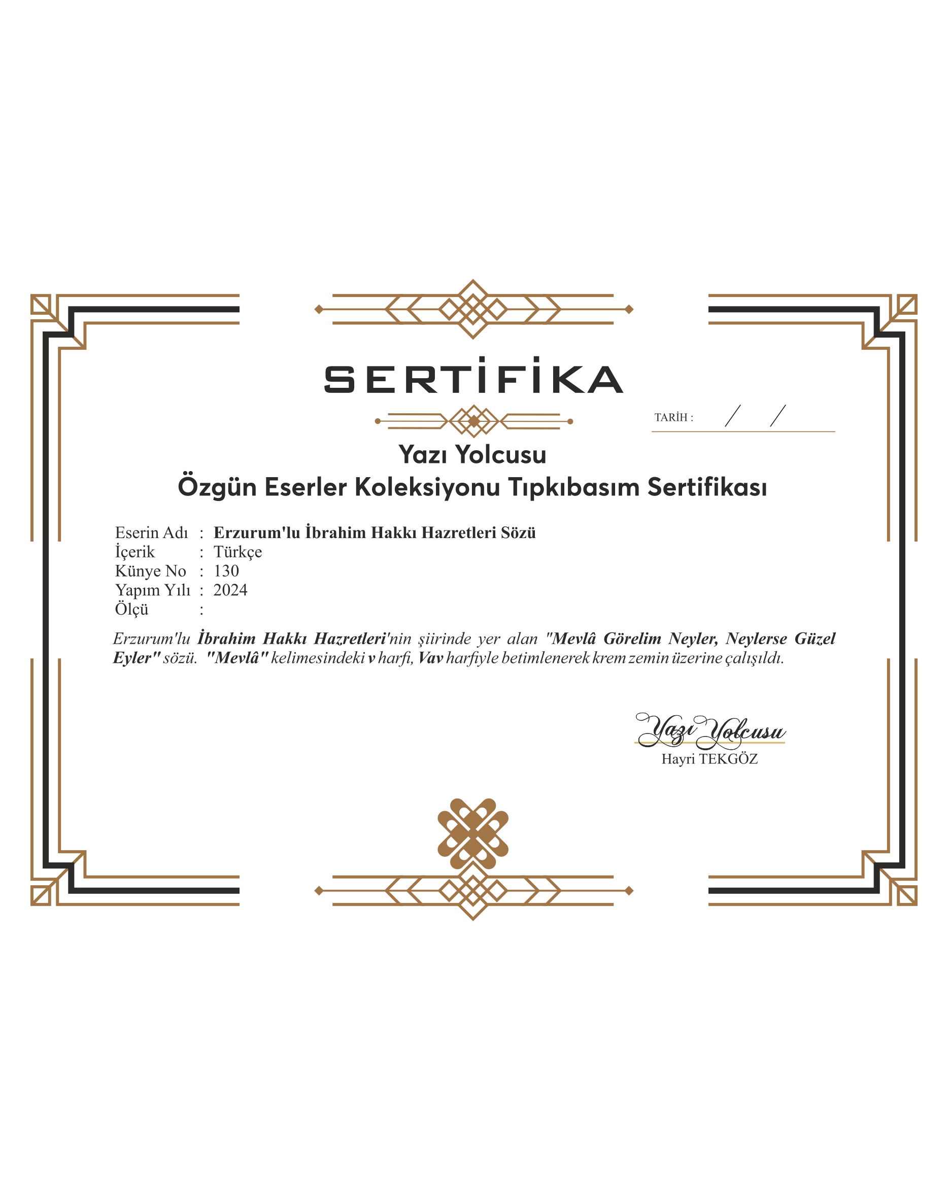Erzurumlu İbrahim Hakkı Hazretlerinin şiirinde yer alan “Mevla Görelim Neyler, Neylerse Güzel Eyler” sözü yazılı. Mevla kelimesindeki v harfi, Vav harfiyle betimlenerek krem zemin üzerine çalışıldı.