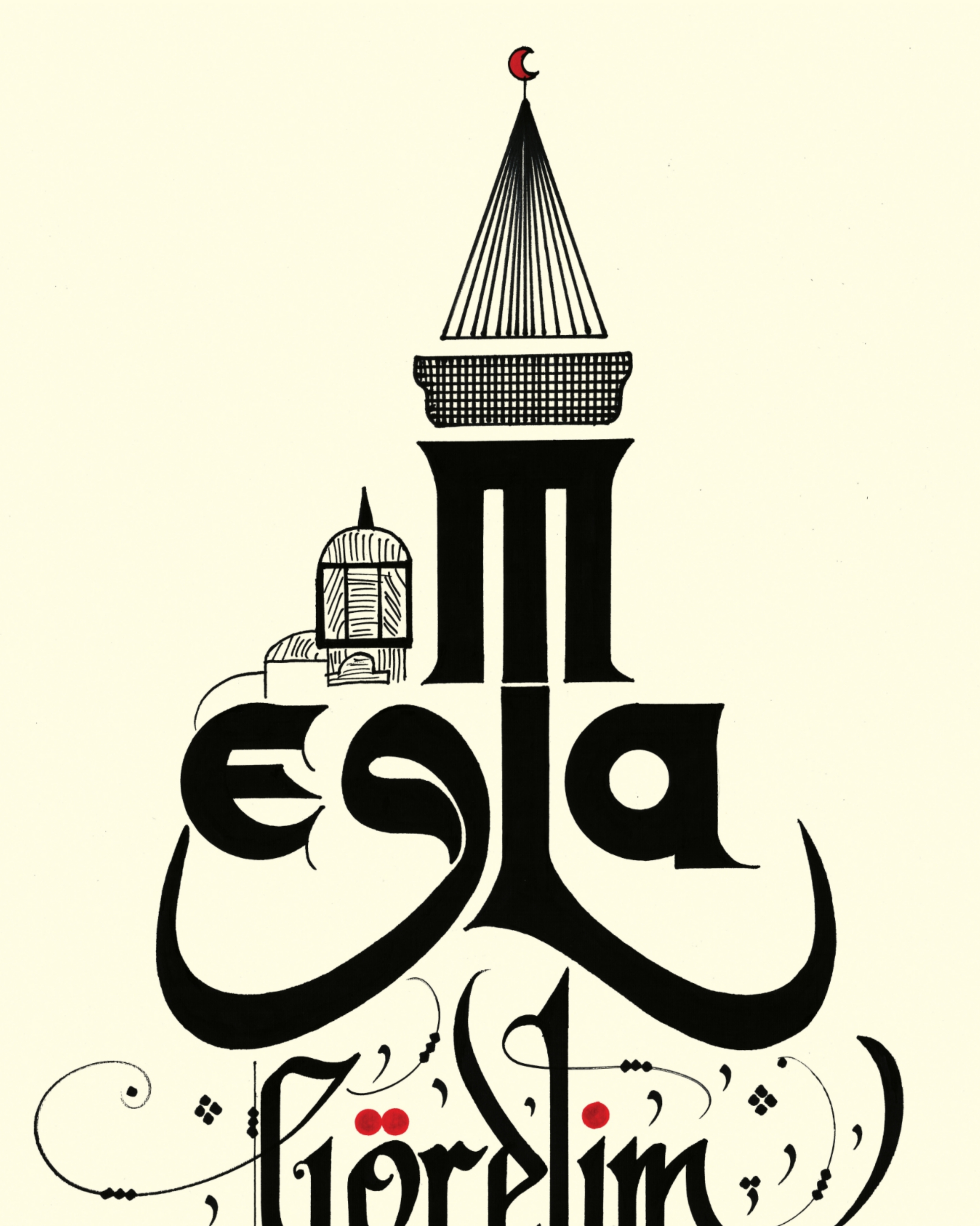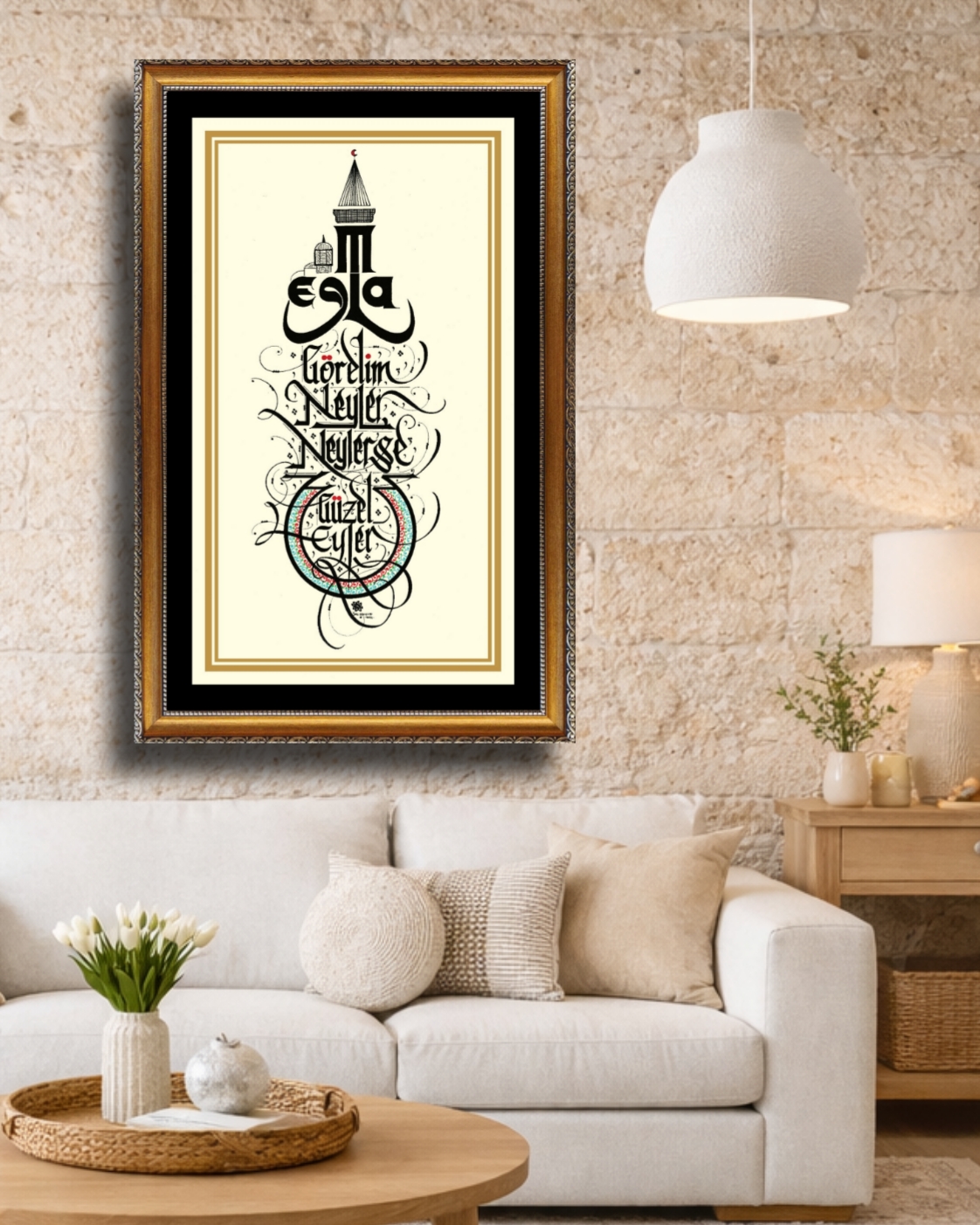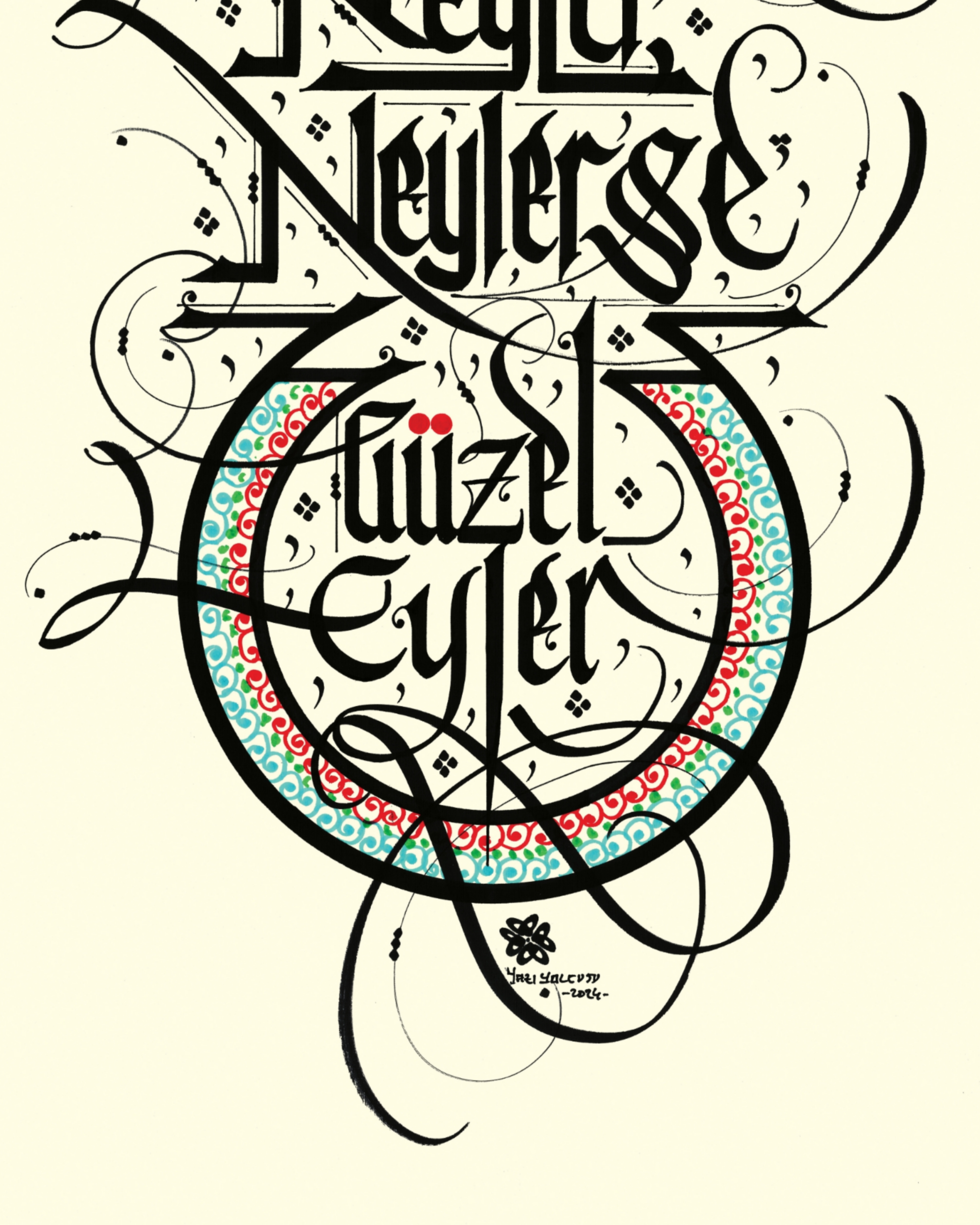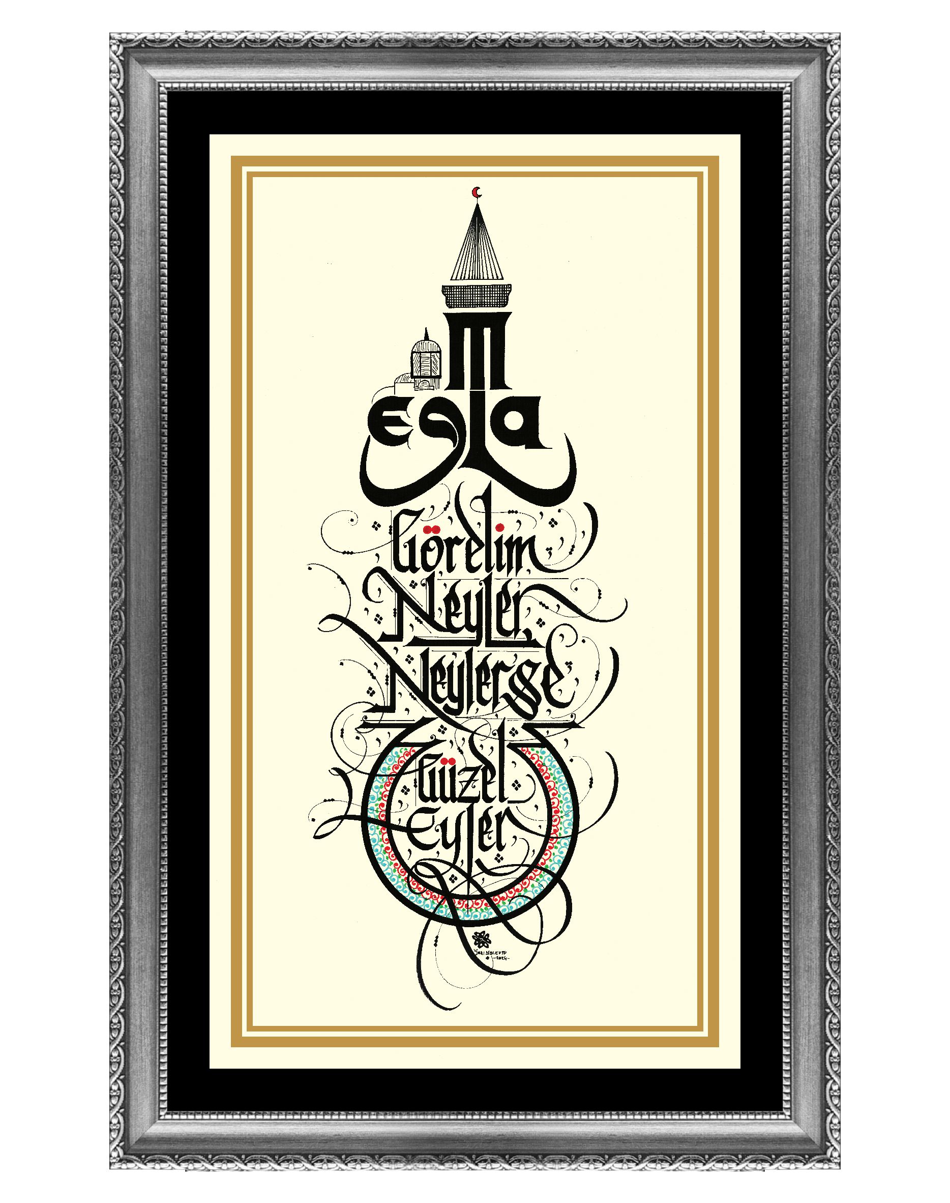 Erzurumlu İbrahim Hakkı Hazretlerinin şiirinde yer alan “Mevla Görelim Neyler, Neylerse Güzel Eyler” sözü yazılı. Mevla kelimesindeki v harfi, Vav harfiyle betimlenerek krem zemin üzerine çalışıldı.