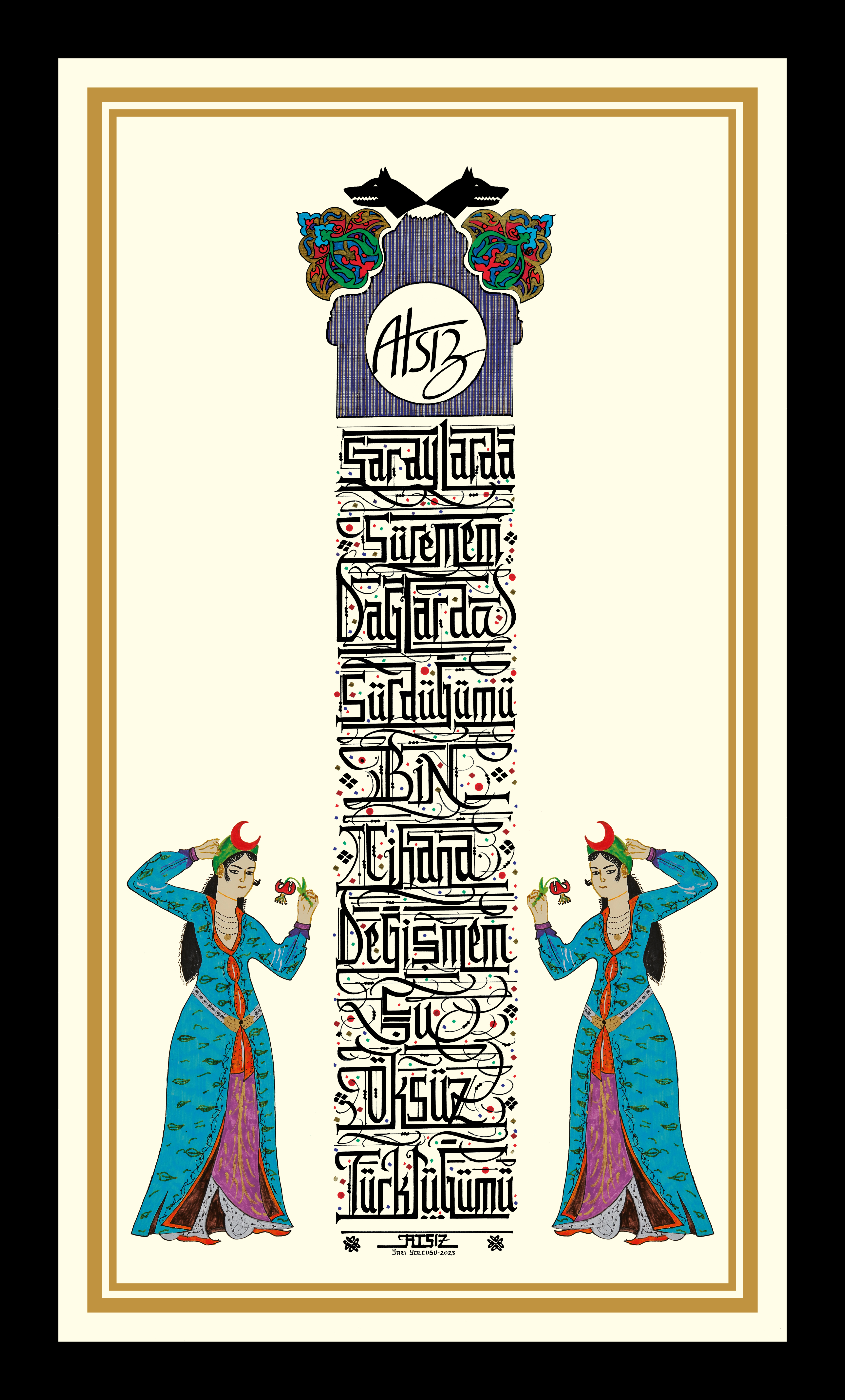 Nihal Atsız’ın “Türk Kızı” adlı şiirinde yer alan söz; anıt görselinde tasarlanarak üst bölüme doğuya ve batıya bakan çift başlı kurt, Atsız’ın imzası ve bezeme motifi ile tasarlandı. Yukarıdan aşağıya yazılan söz “Saraylarda süremem dağlarda sürdüğümü, bin cihana değişmem şu öksüz Türklüğümü”. Sağ ve sola elinde Türk zambağı çiçekli ve Hilal taçlı minyatür kadın belirtkesi nakşedildi.