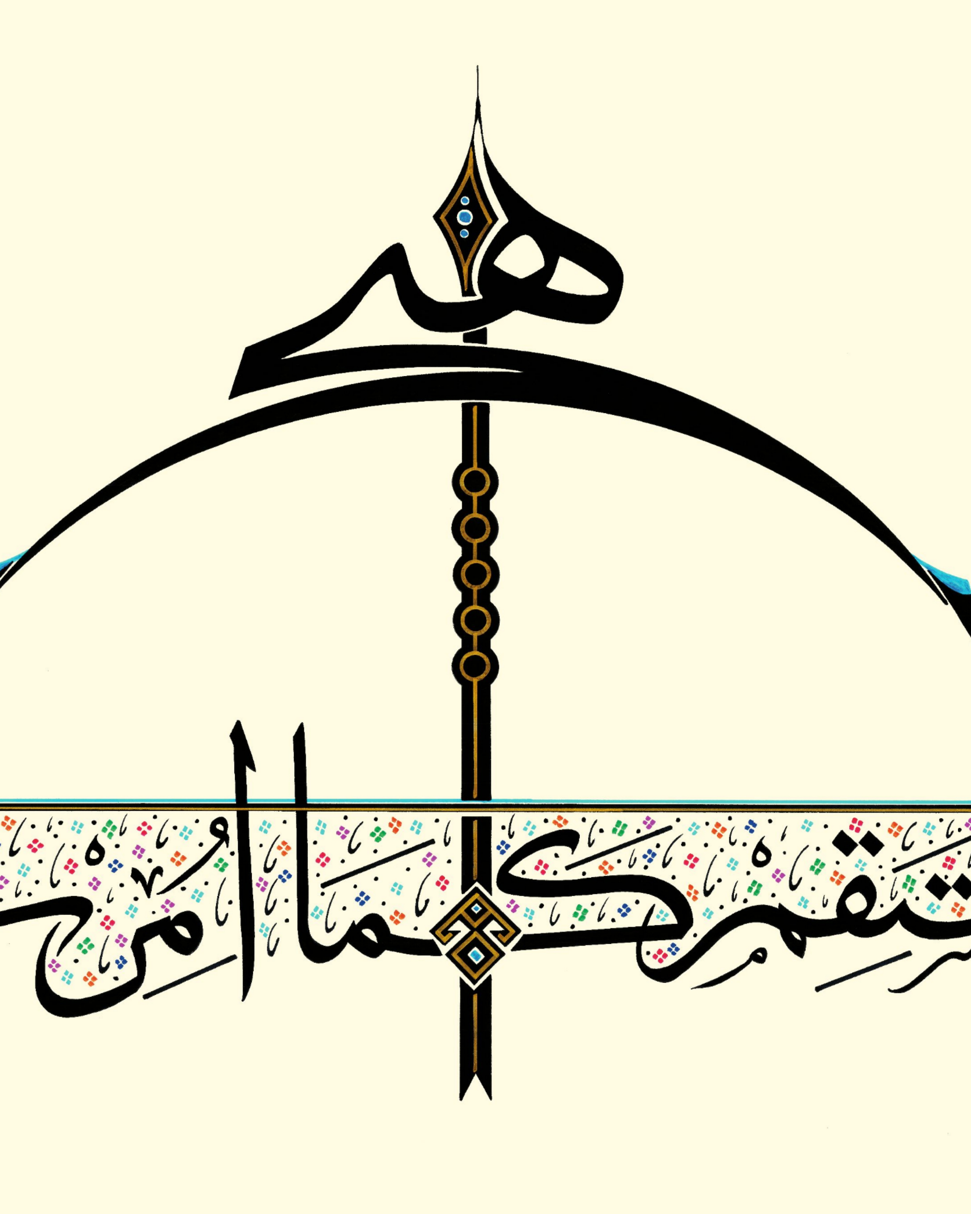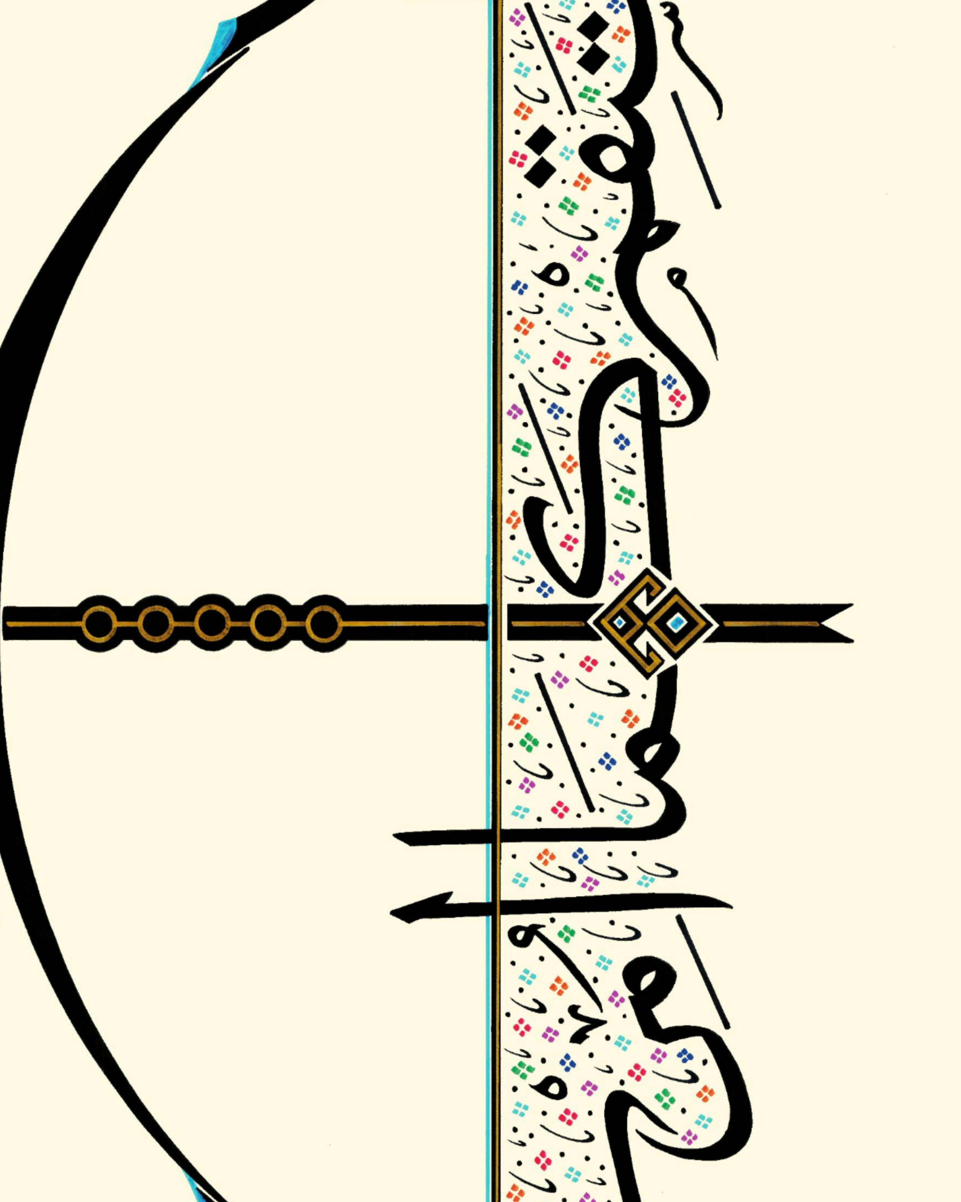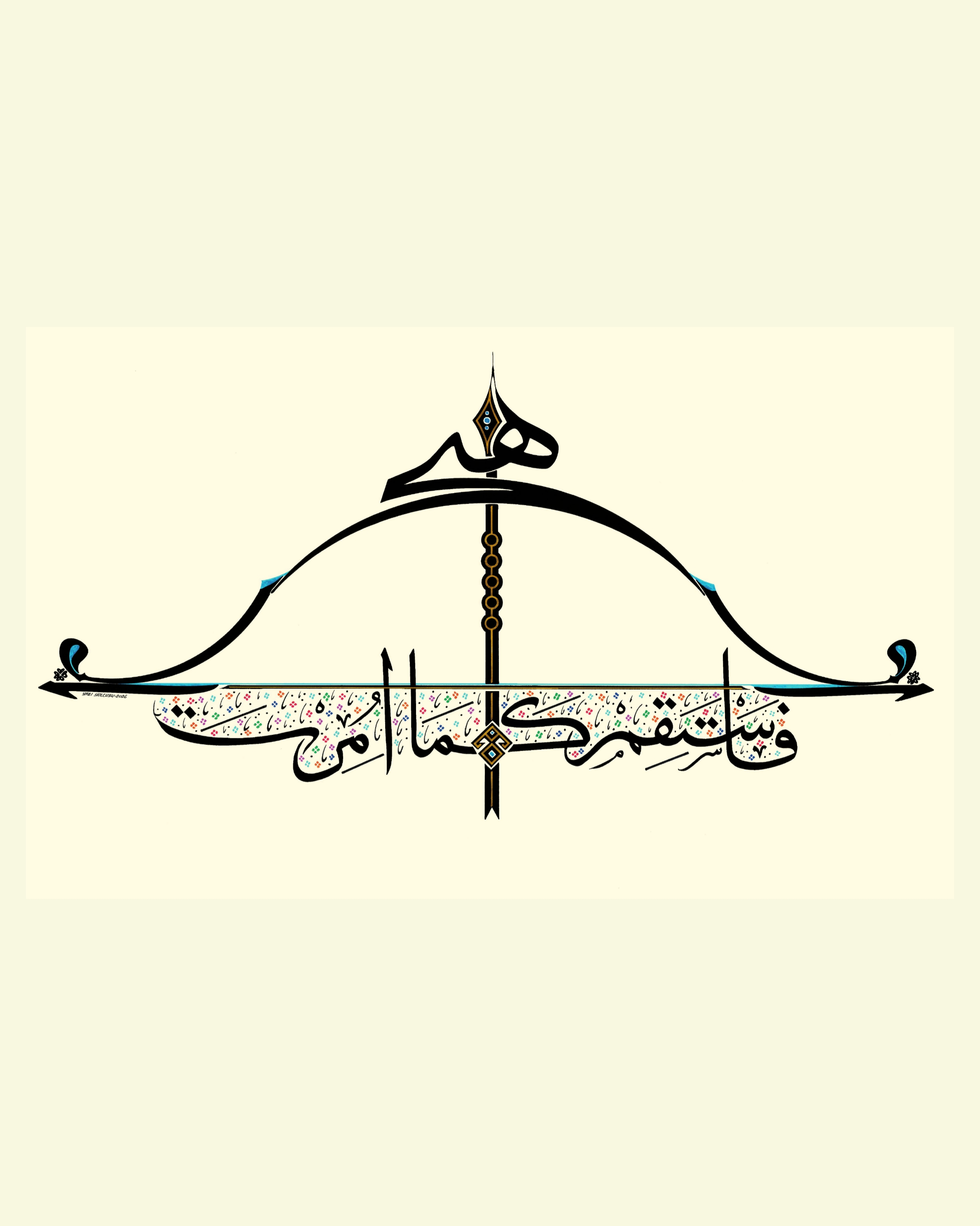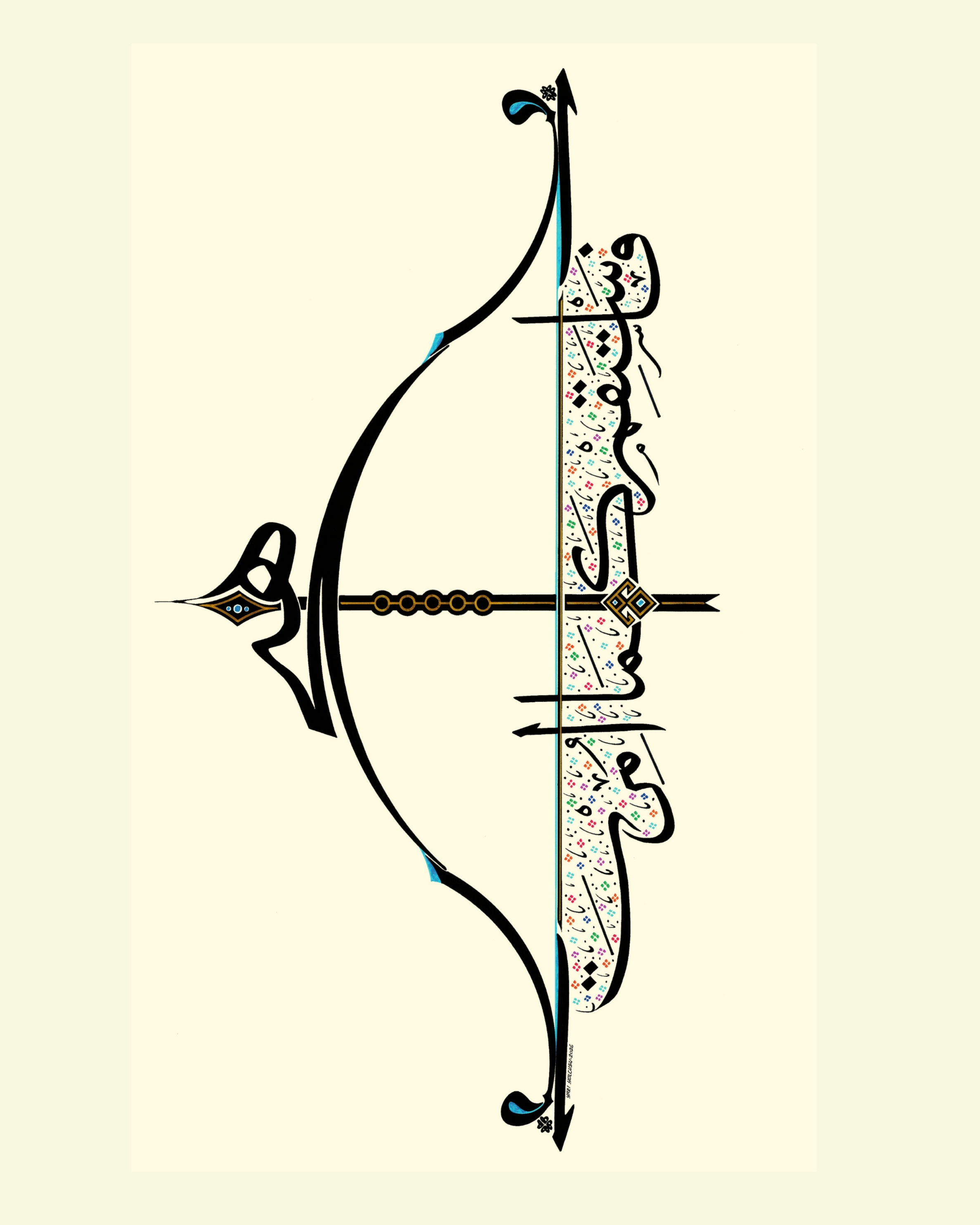 Okun uç kısmında “Hiç” yazılı. Çile veya kiriş adıyla bilinen germe ip üzerinde yukarıdan aşağı “Emrolunduğun gibi dosdoğru ol” Hud Suresi 112’nci ayetin Arapçası yazılıdır. Yayın üst ve alt uçları “Elif” ve “Vav” harfleriyle bütünleştirildi. Okun yelpaze bölümüne “Bereket” damgası nakşedildi. Tasarım; doğu, batı ve göğe doğru üç farklı cepheden okunabilmektedir. Bu anlayışla, okun yere atılamayacağına da işaret edilmiştir.