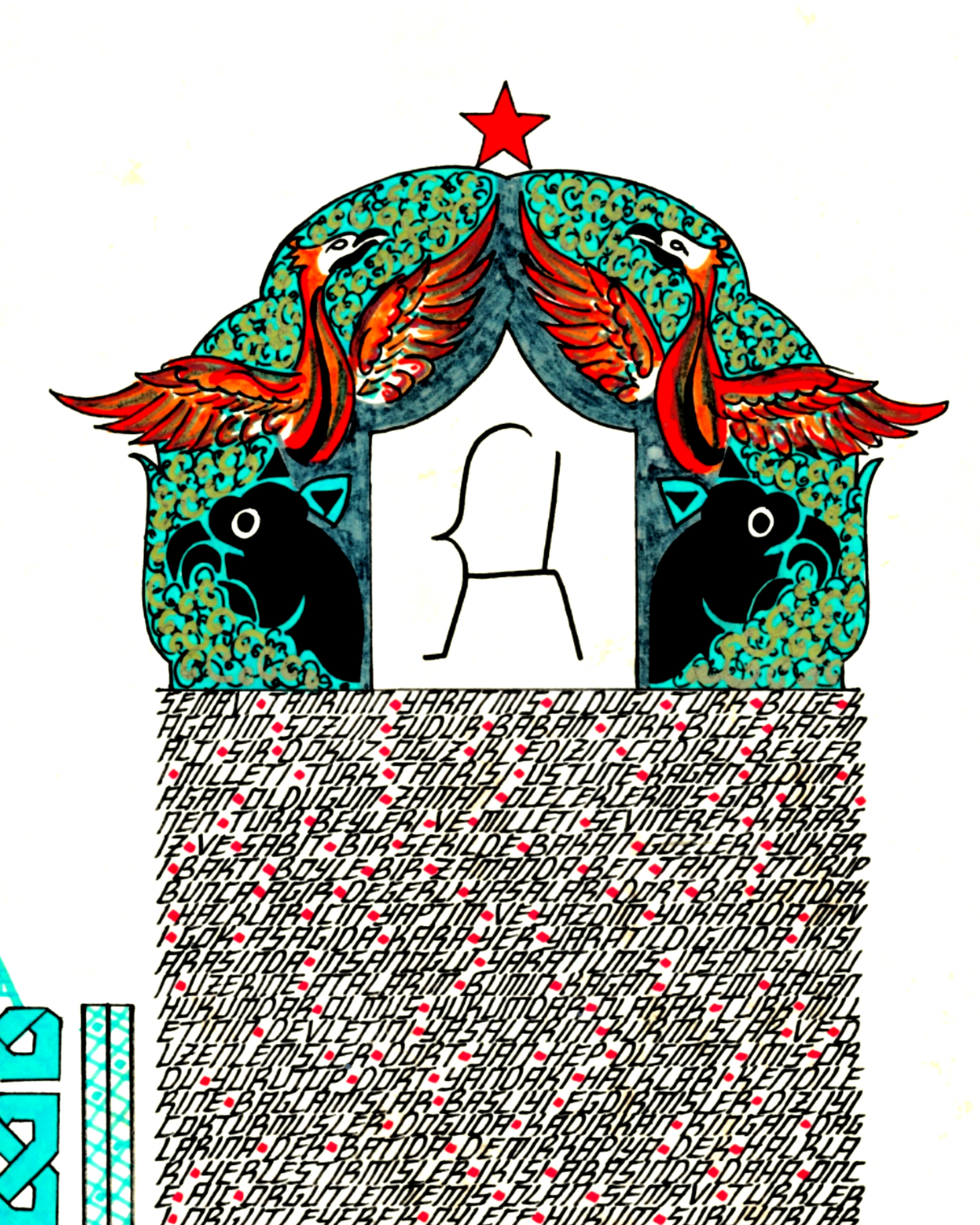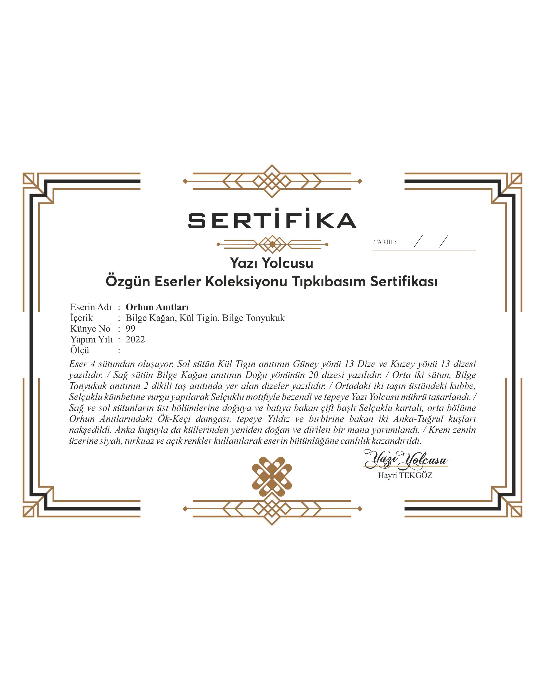 Bilge Kağan, Kül Tigin ve Tonyukuk Anıtları tek tabloda tasarlanmıştır. Eser 4 sütundan oluşuyor. Sol sütün Kül Tigin anıtının Güney yönü 13 Dize ve Kuzey yönü 13 dizesi yazılıdır. / Sağ sütün Bilge Kağan anıtının Doğu yönünün 20 dizesi yazılıdır. / Orta iki sütun, Bilge Tonyukuk anıtının 2 dikili taş anıtında yer alan dizeler yazılıdır. / Ortadaki iki taşın üstündeki kubbe, Selçuklu kümbetine vurgu yapılarak Selçuklu motifiyle bezendi ve tepeye Yazı Yolcusu mührü tasarlandı. / Sağ ve sol sütunların üst bölümlerine doğuya ve batıya bakan çift başlı Selçuklu kartalı, orta bölüme Orhun Anıtlarındaki Ök-Keçi damgası, tepeye Yıldız ve birbirine bakan iki Anka-Tuğrul kuşları nakşedildi. Anka kuşuyla, küllerinden yeniden doğan ve dirilen bir manaya vurgu yapıldı. / Krem zemin üzerine siyah, turkuaz ve açık renkler kullanılarak eserin bütünlüğüne canlılık kazandırıldı.