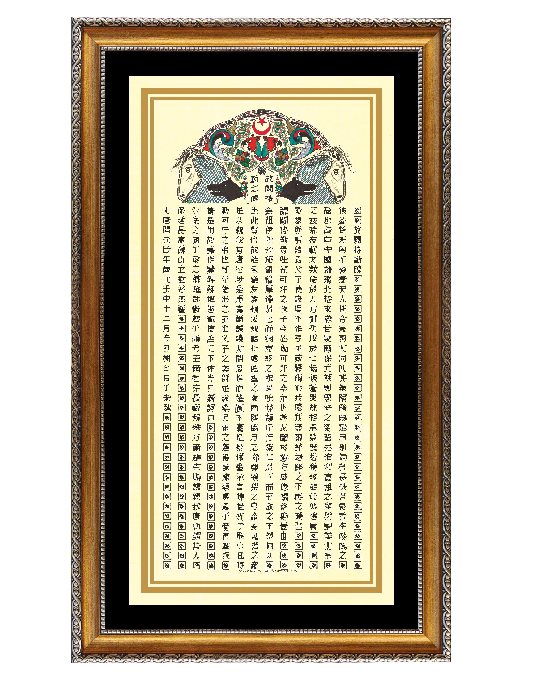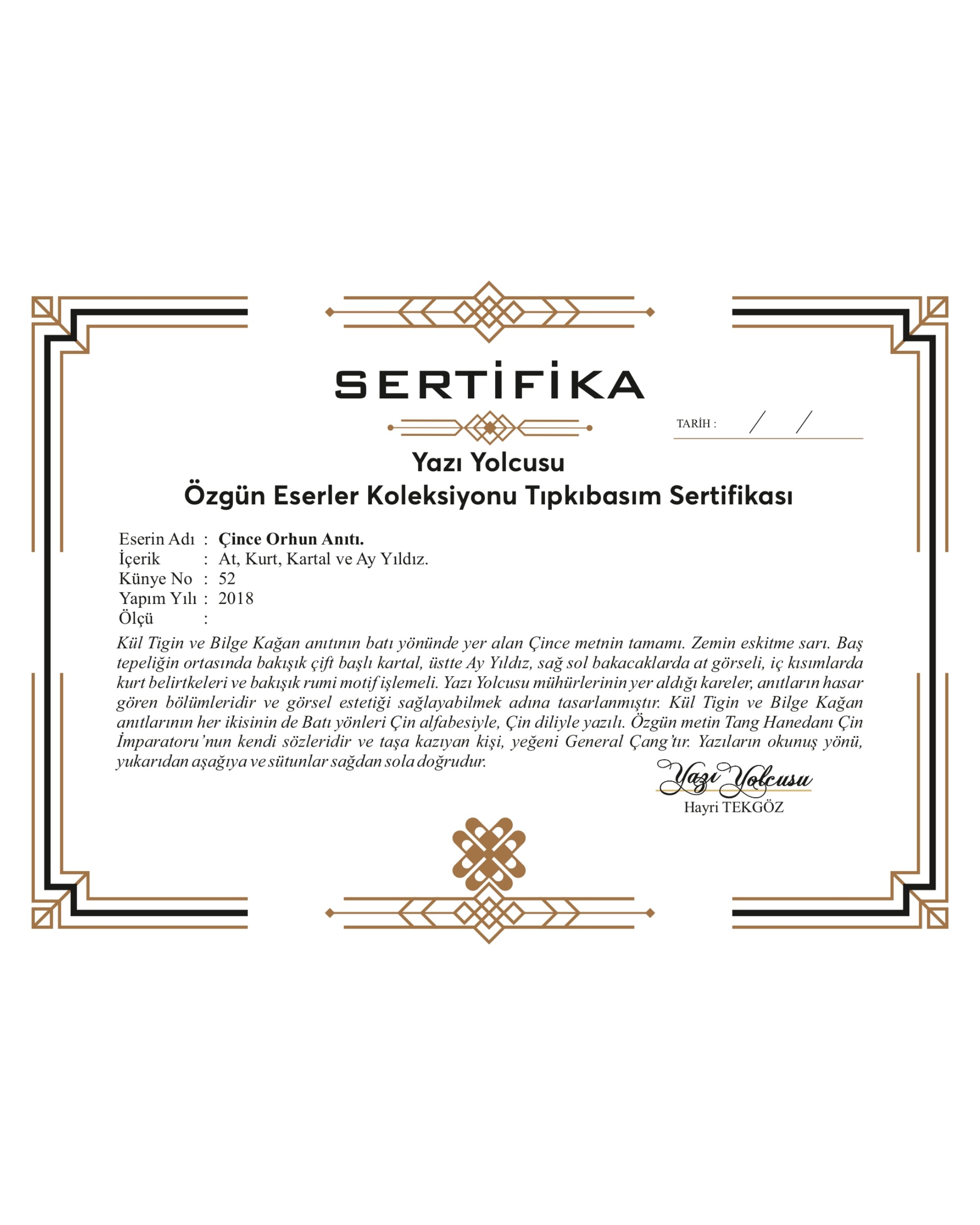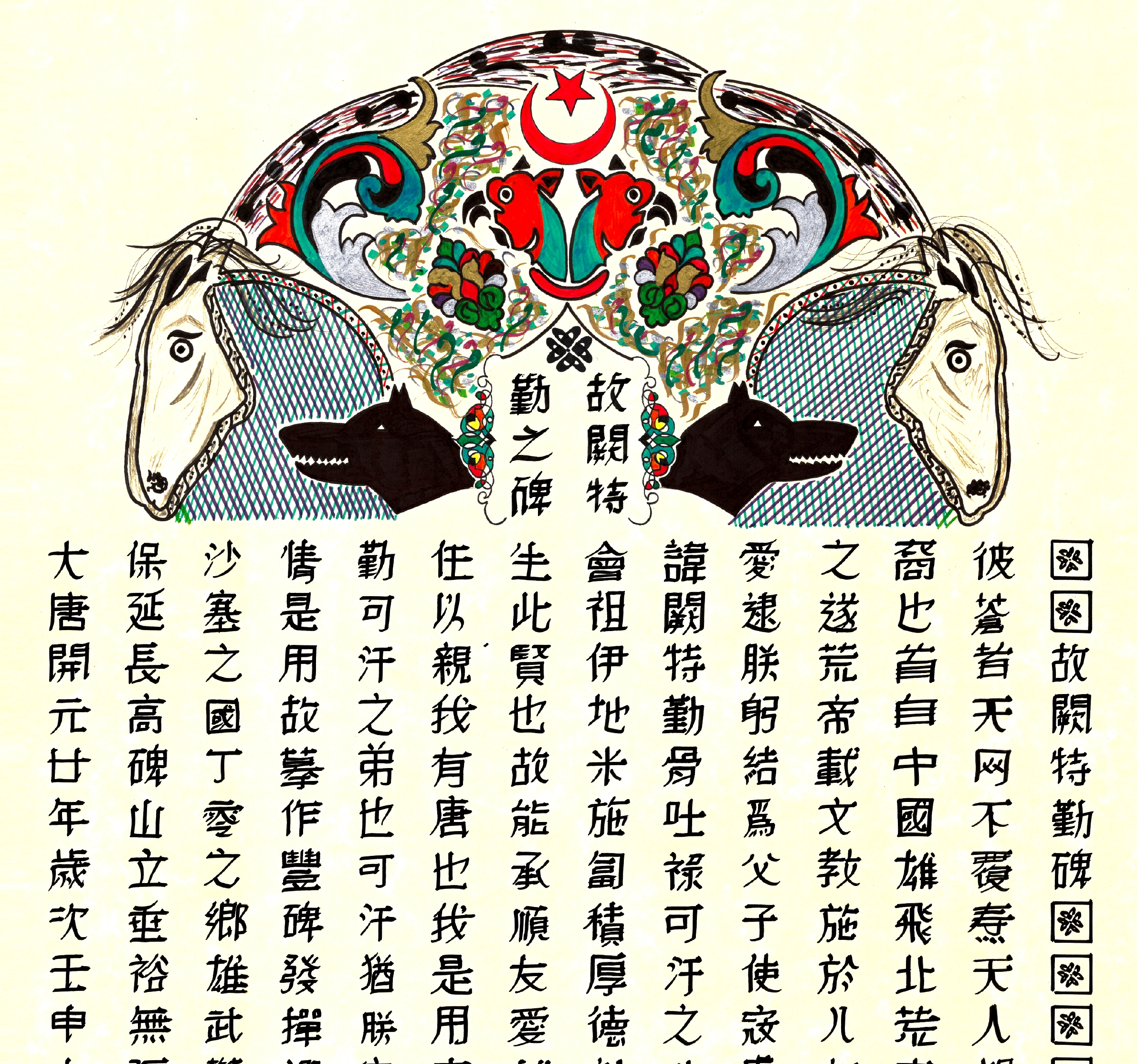 Kül Tigin ve Bilge Kağan anıtının batı yönünde yer alan Çince metnin tamamı. Zemin eskitme sarı. Baş tepeliğin ortasında bakışık çift başlı kartal, üstte Ay Yıldız, sağ sol bakacaklarda at görseli, iç kısımlarda kurt belirtkeleri ve bakışık olarak rumi motifleri işlemeli. Yazı Yolcusu mühürlerinin yer aldığı kareler; anıtların hasar gören bölümleridir ve görsel estetiği sağlayabilmek adına tasarlanmıştır. Kül Tigin ve Bilge Kağan anıtlarının her ikisinin de batı yönleri Çin alfabesiyle, Çince yazılı. Özgün metin Tang Hanedanı Çin İmparatoru’nun kendi sözleridir ve taşa kazıyan kişi, yeğeni General Çang’tır. Yazıların okunuş yönü, yukarıdan aşağıya ve sütunlar sağdan sola doğrudur.