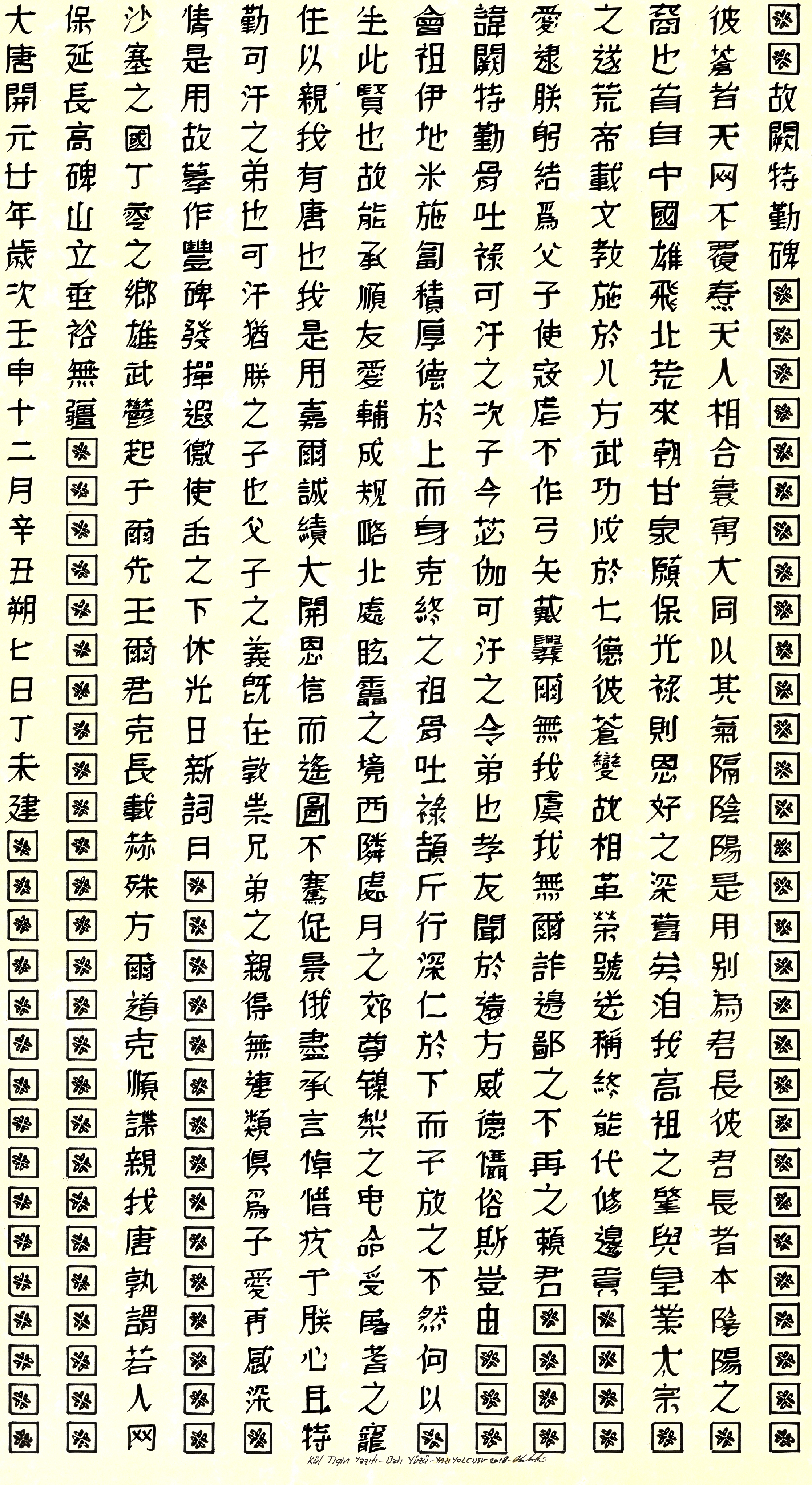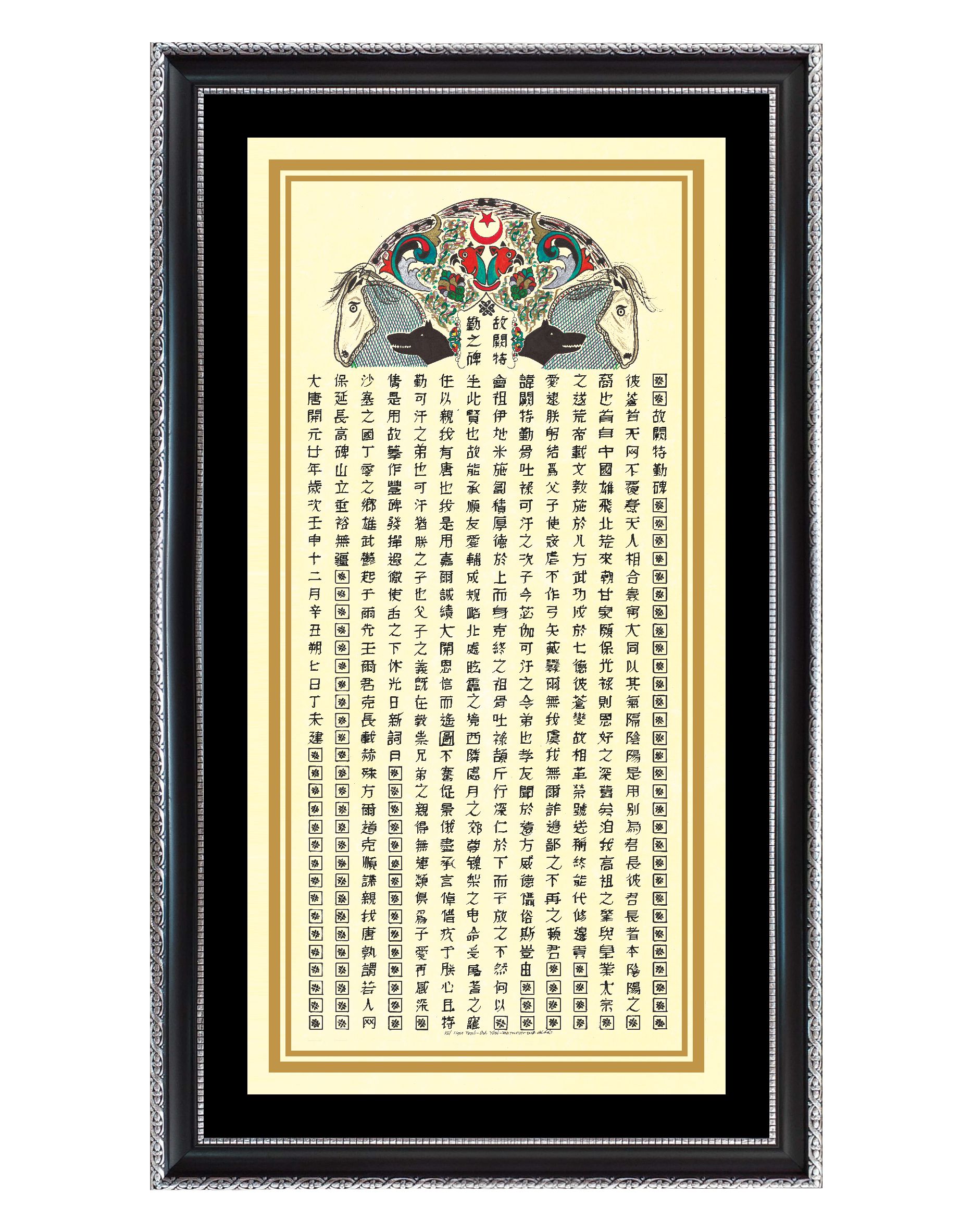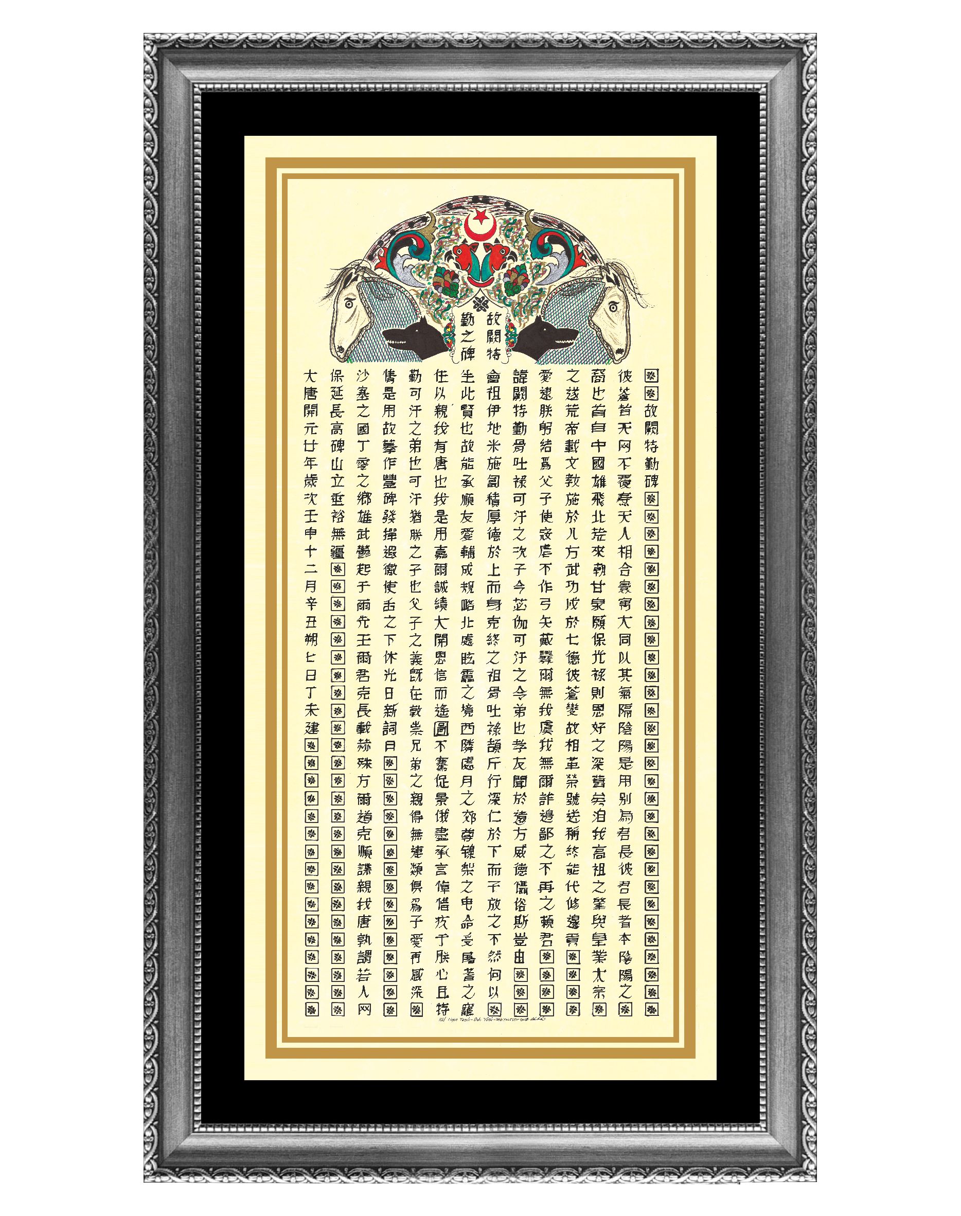 Kül Tigin ve Bilge Kağan anıtının batı yönünde yer alan Çince metnin tamamı. Zemin eskitme sarı. Baş tepeliğin ortasında bakışık çift başlı kartal, üstte Ay Yıldız, sağ sol bakacaklarda at görseli, iç kısımlarda kurt belirtkeleri ve bakışık olarak rumi motifleri işlemeli. Yazı Yolcusu mühürlerinin yer aldığı kareler; anıtların hasar gören bölümleridir ve görsel estetiği sağlayabilmek adına tasarlanmıştır. Kül Tigin ve Bilge Kağan anıtlarının her ikisinin de batı yönleri Çin alfabesiyle, Çince yazılı. Özgün metin Tang Hanedanı Çin İmparatoru’nun kendi sözleridir ve taşa kazıyan kişi, yeğeni General Çang’tır. Yazıların okunuş yönü, yukarıdan aşağıya ve sütunlar sağdan sola doğrudur.