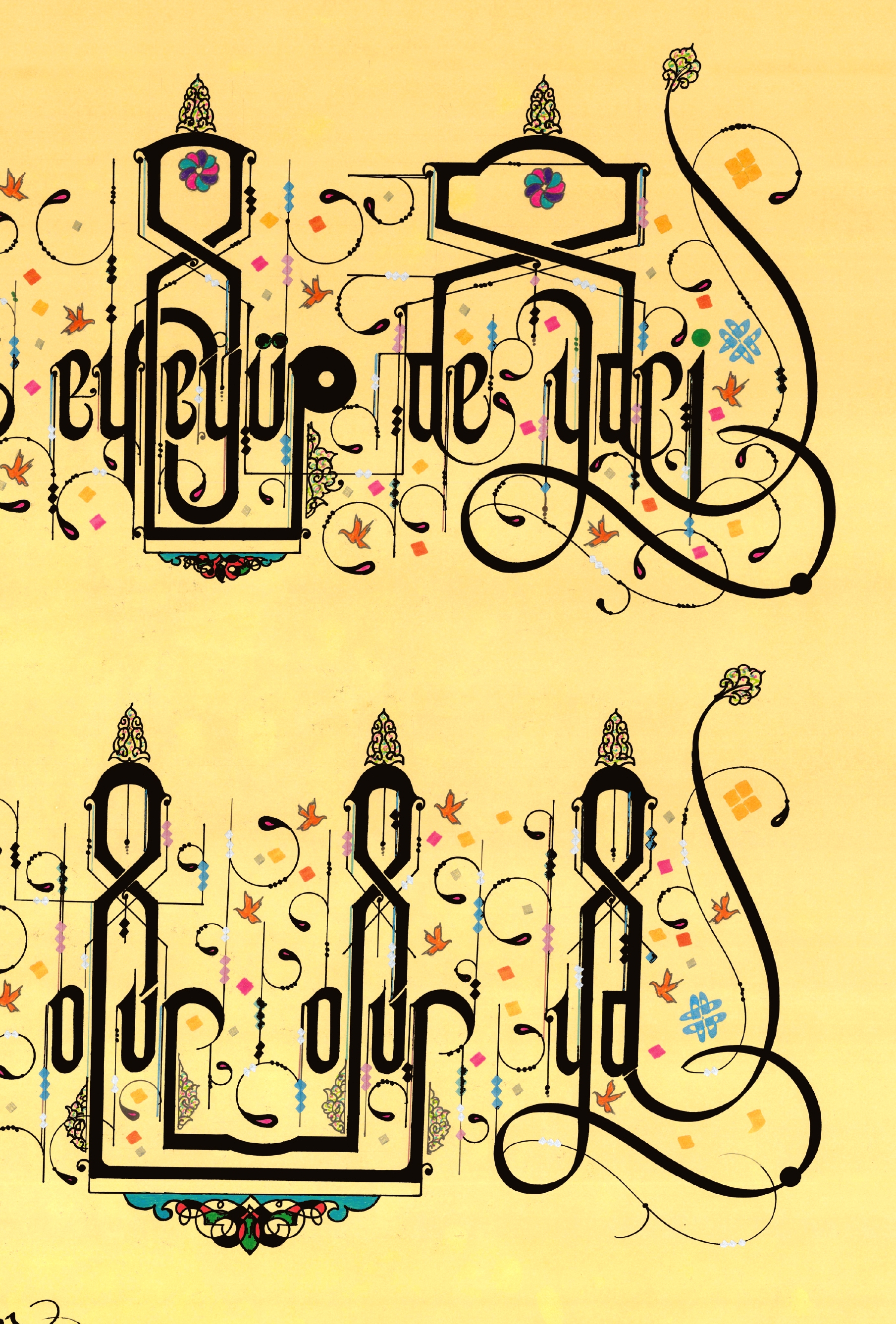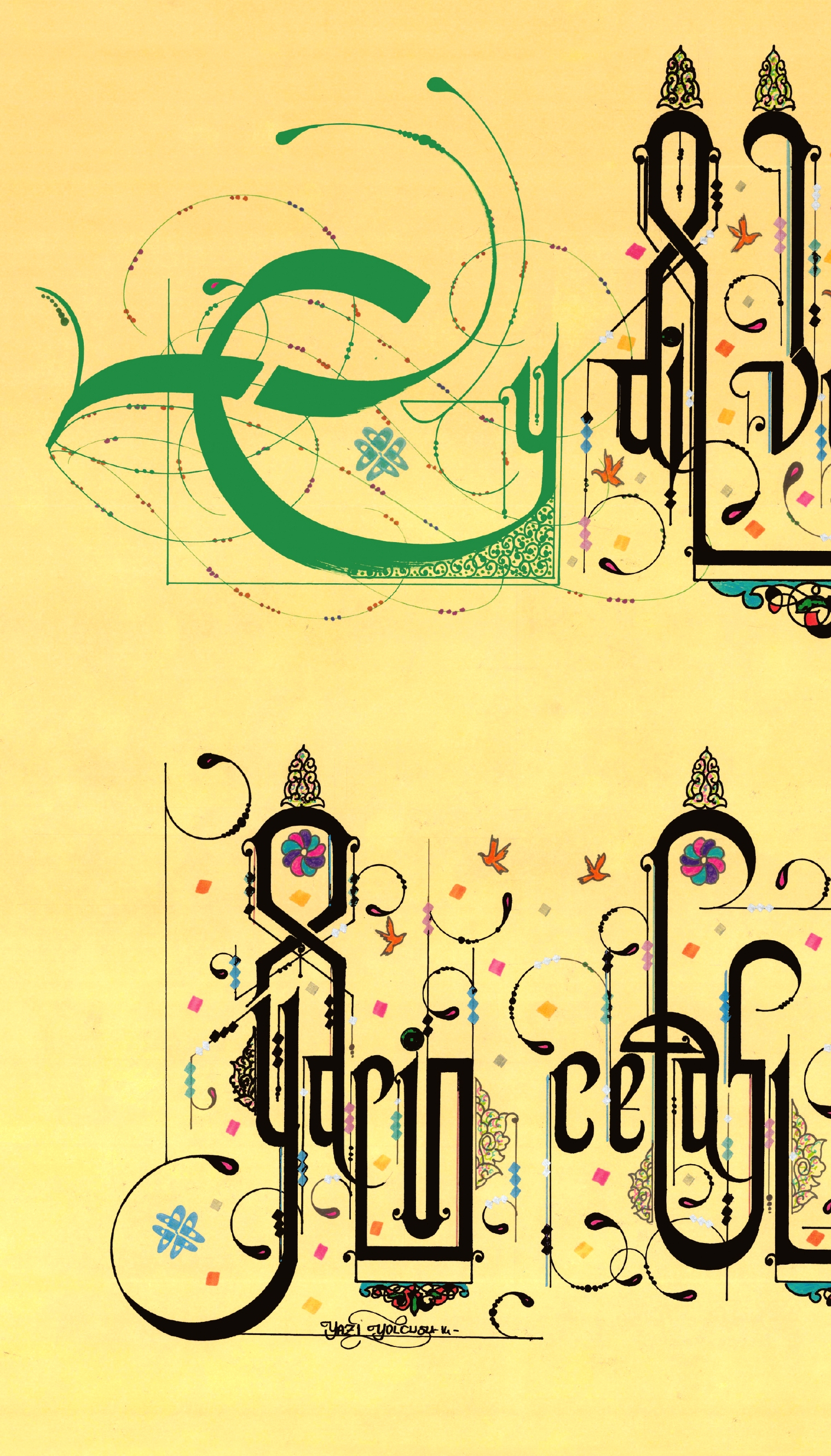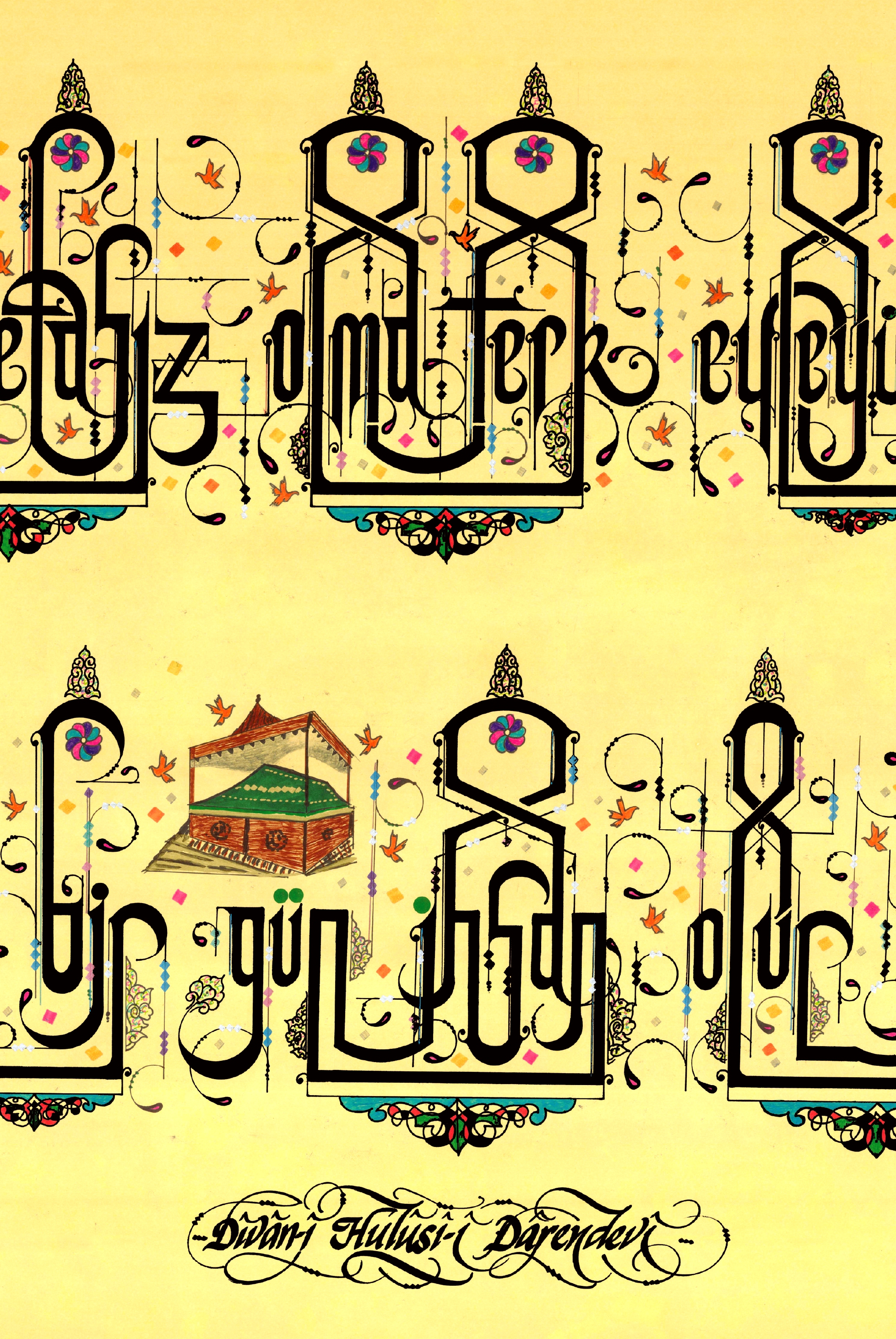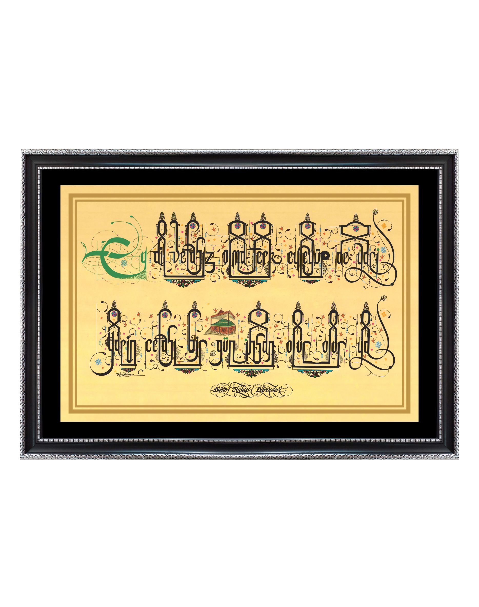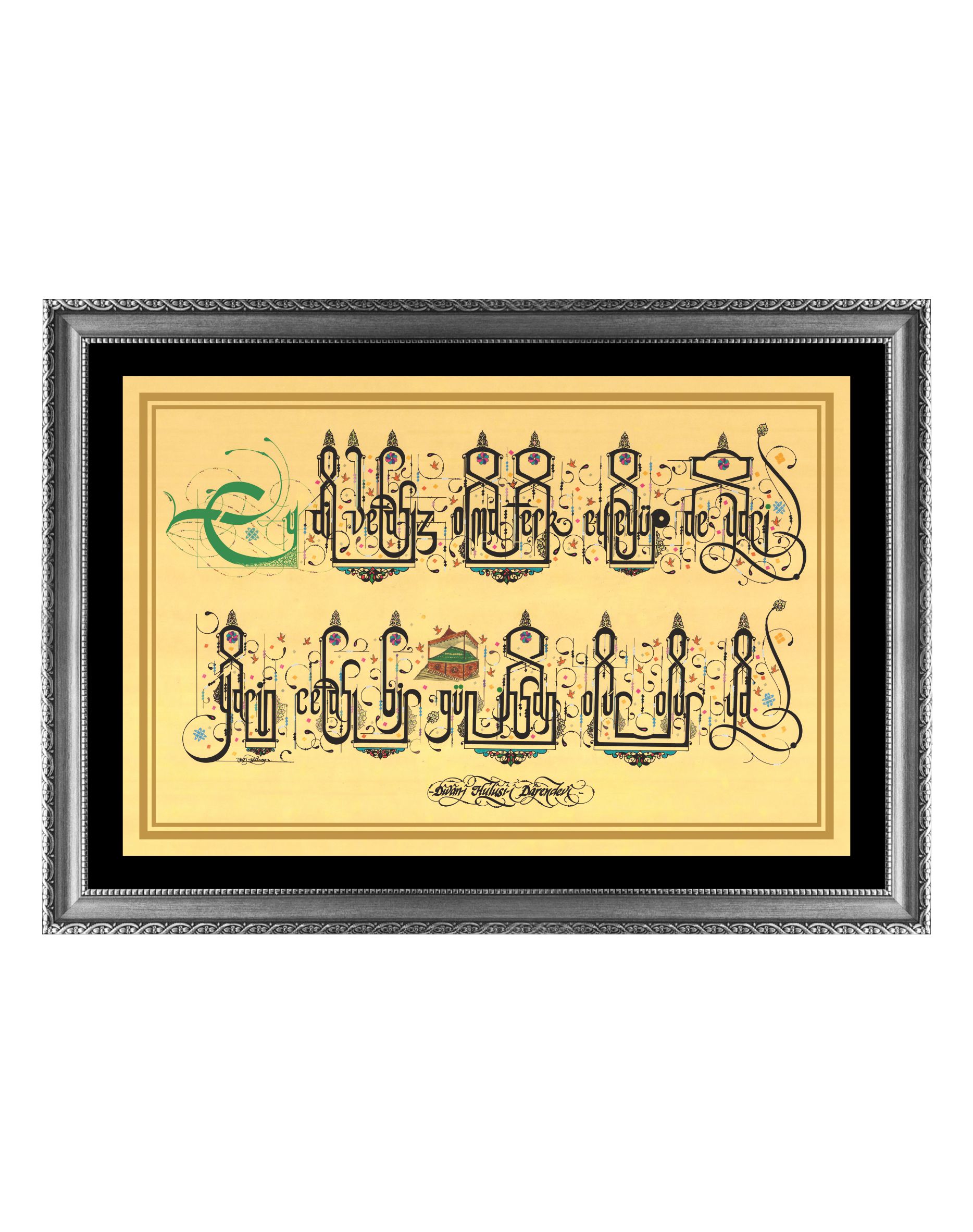 Divan-ı Hulusi-i Darendevi’ye ait özlü söz. “Ey dil vefasız olma terk eyleyüp de yari, yarin cefası bir gün ihsan olur olur ya.” Sarı eskitme zemin üzerine çalışıldı ve yoğun motiflerle süslendi.