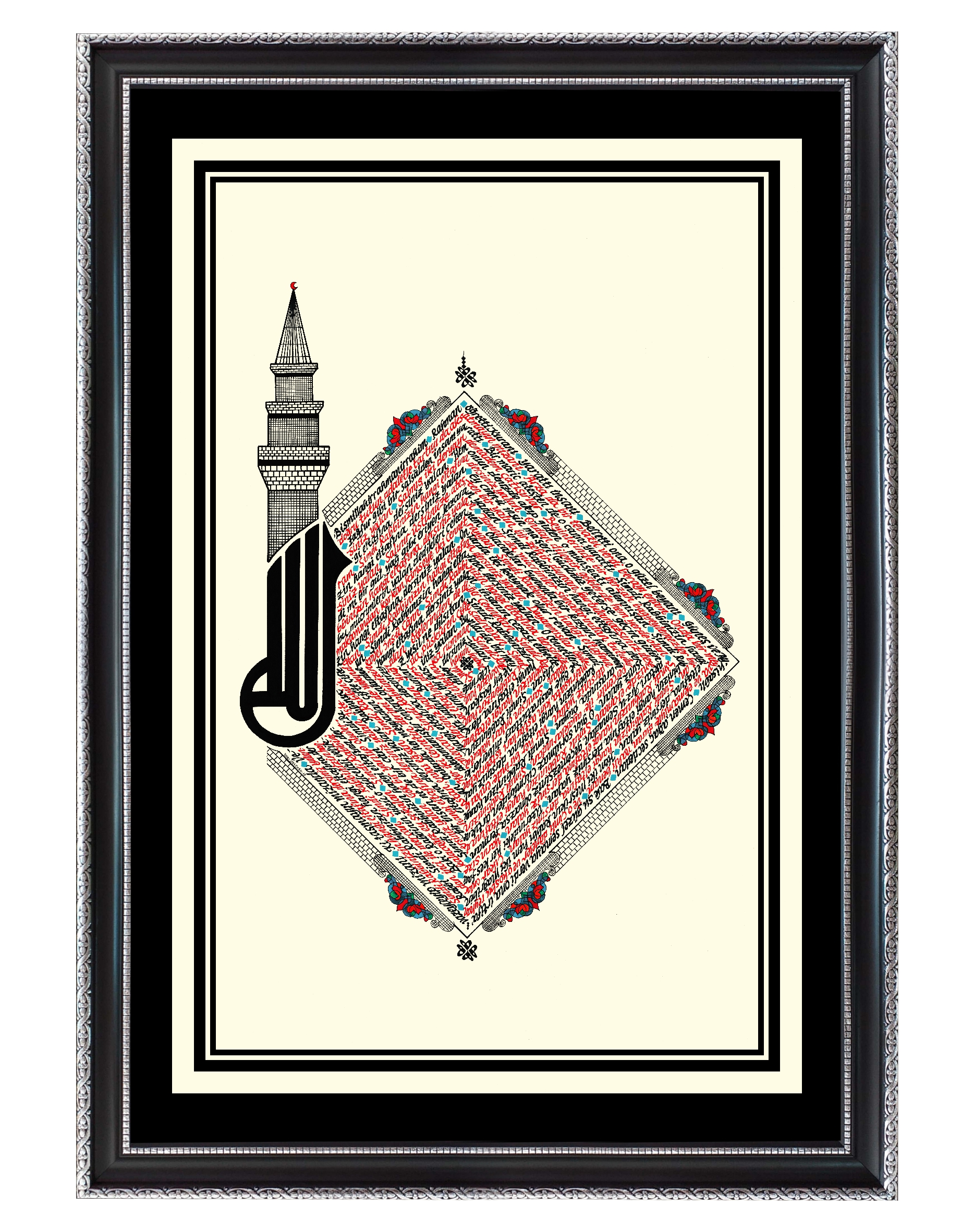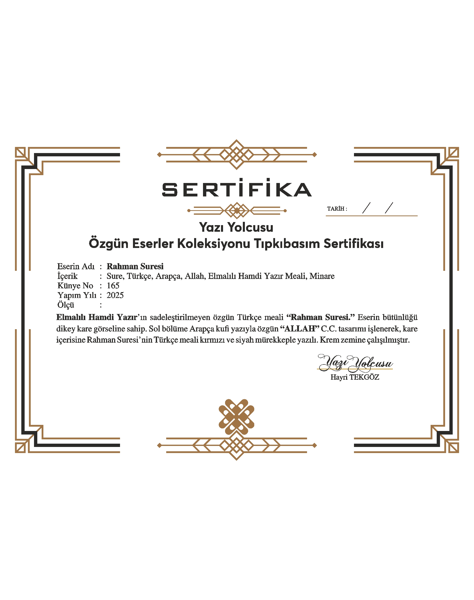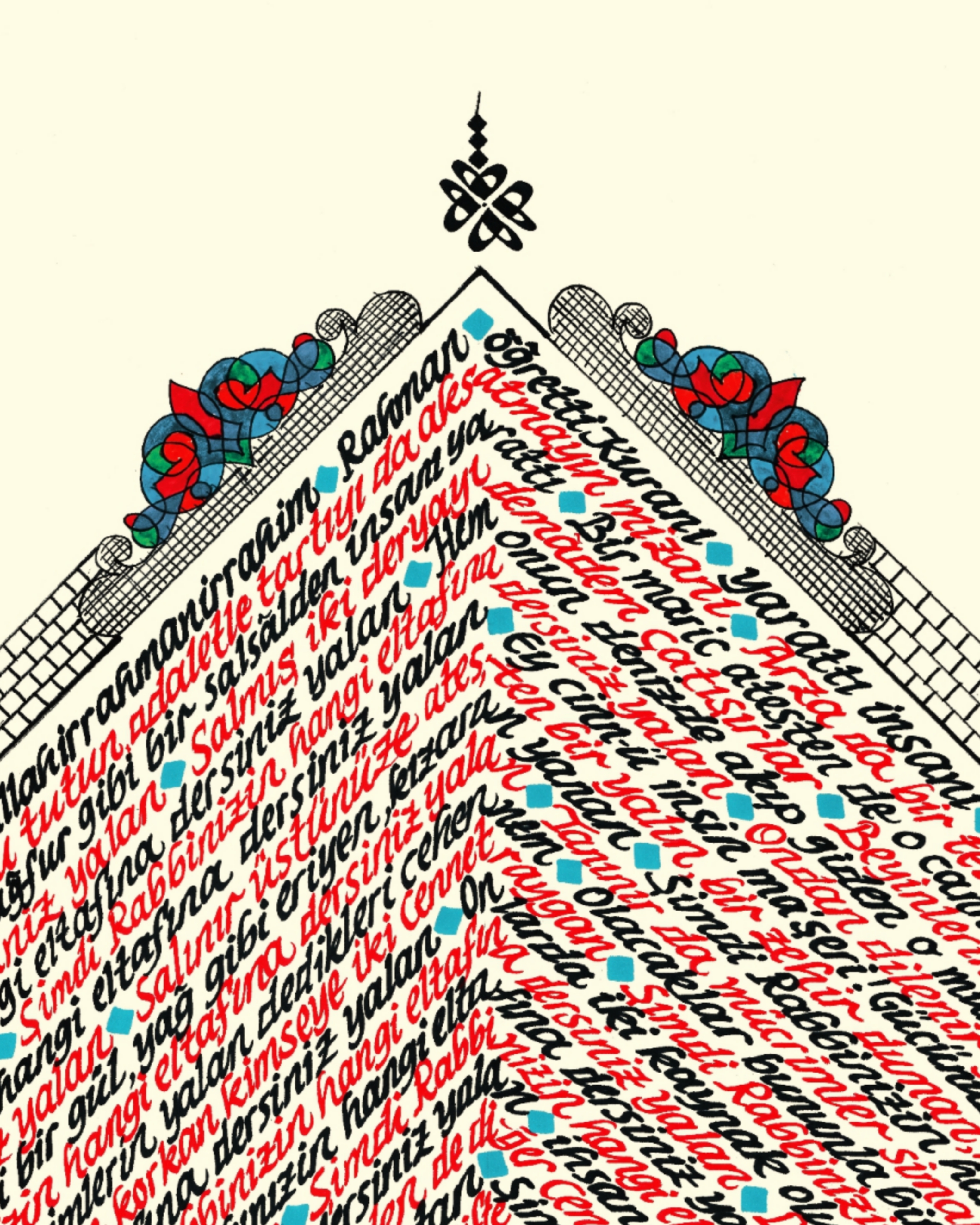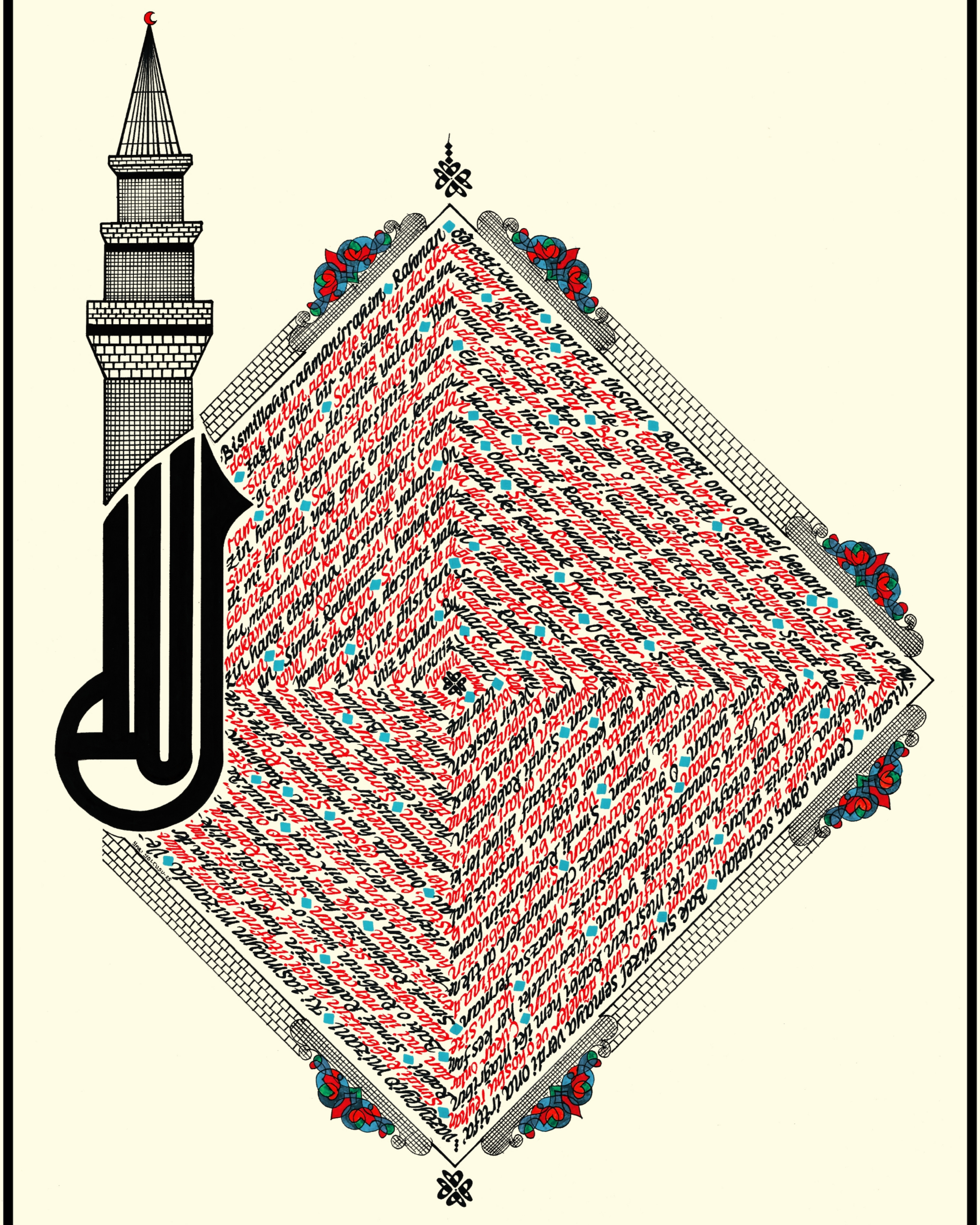 Elmalılı Hamdi Yazır’ın sadeleştirilmeyen özgün Türkçe meali “Rahman Suresi.” Eserin bütünlüğü dikey kare görseline sahip. Sol bölüme Arapça kufi yazıyla özgün “ALLAH” C.C. ve minare tasarımı işlenerek, kare içerisine Rahman Suresi’nin Türkçe meali kırmızı ve siyah mürekkeple yazılı. Krem zemine çalışılmıştır.