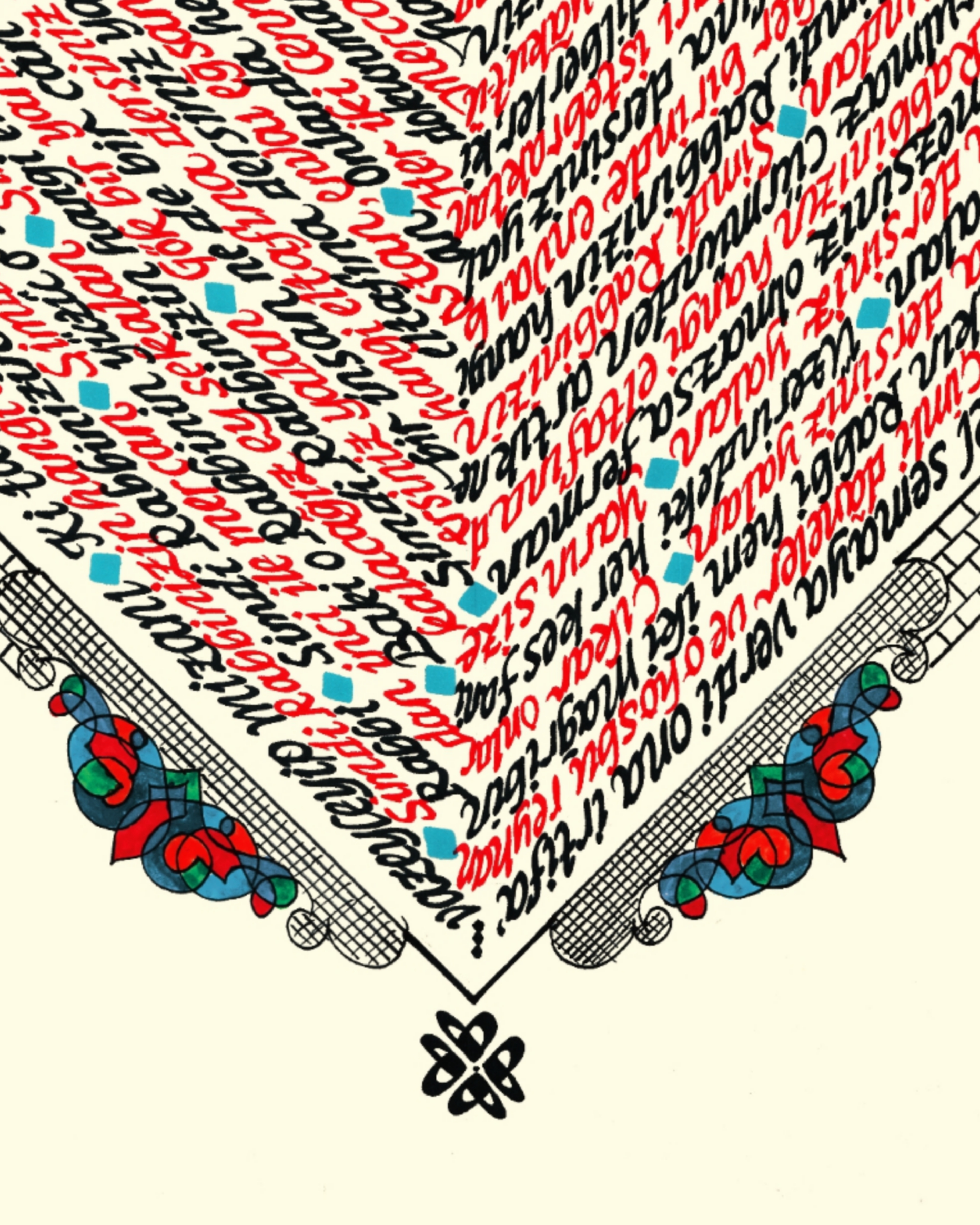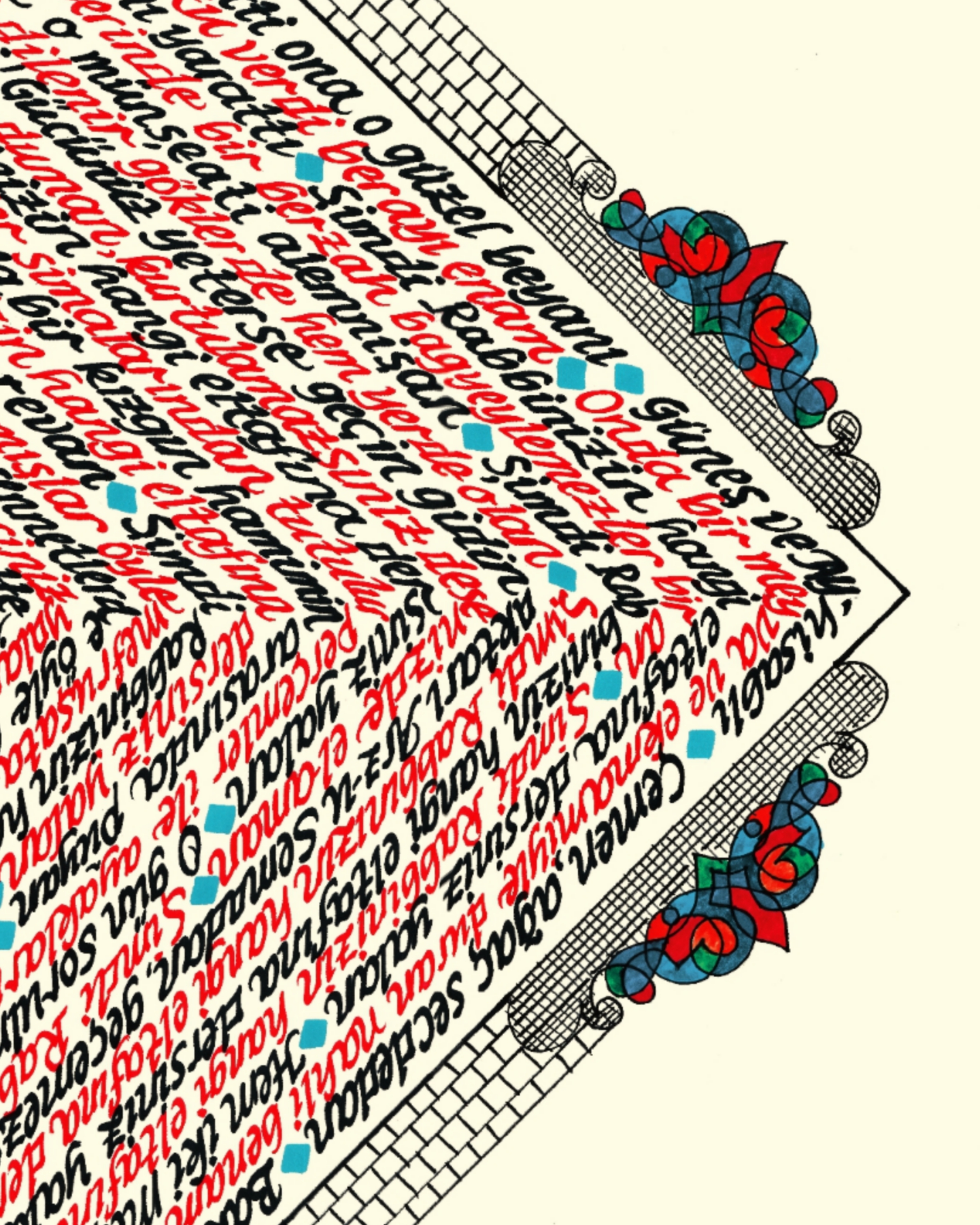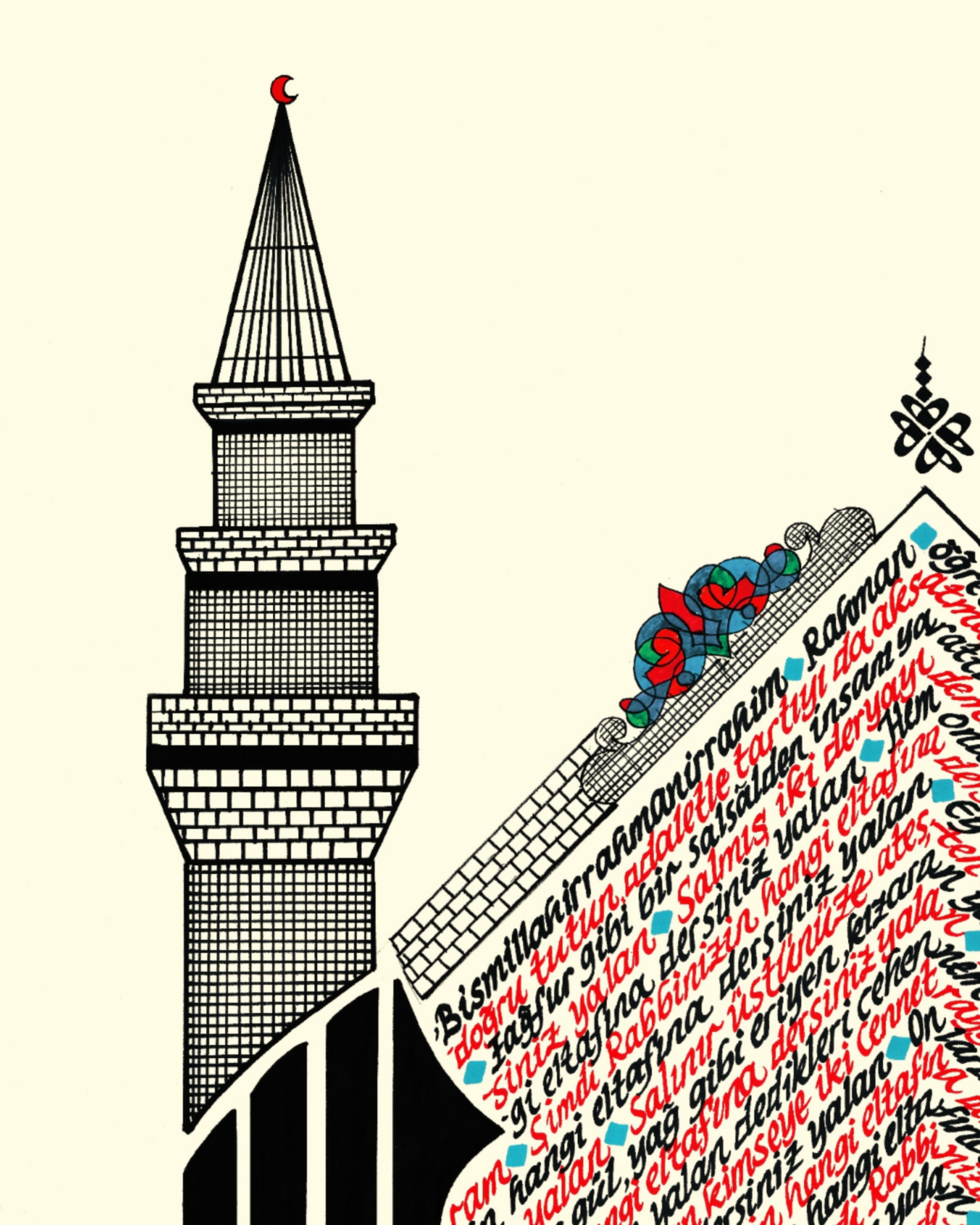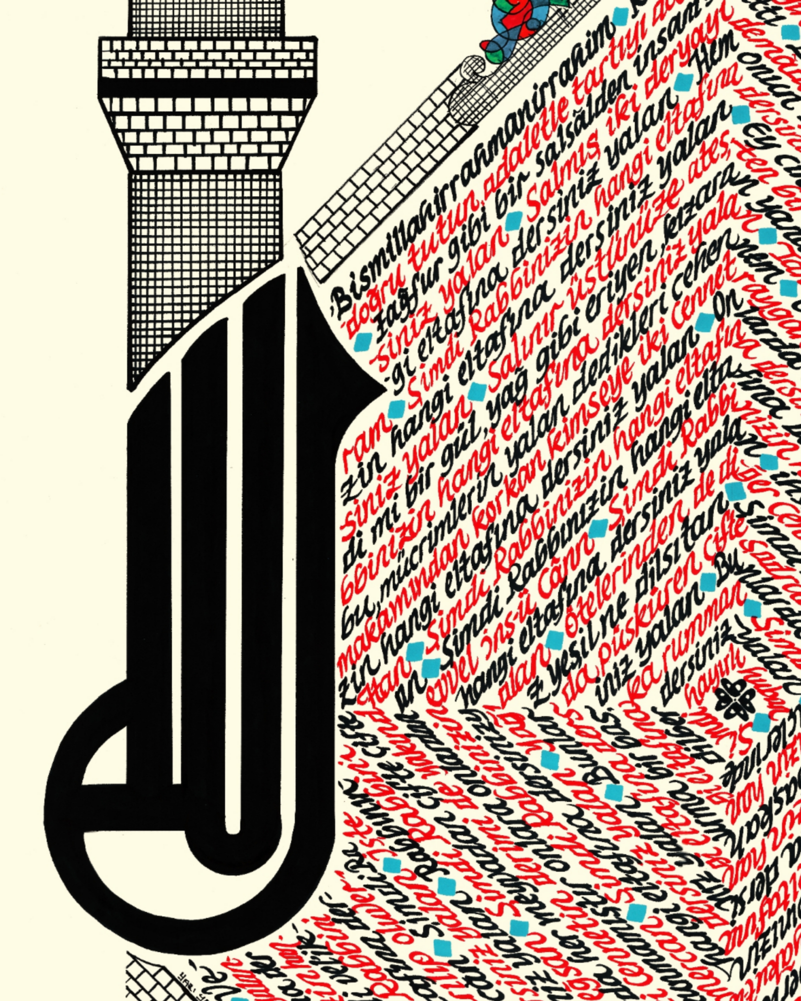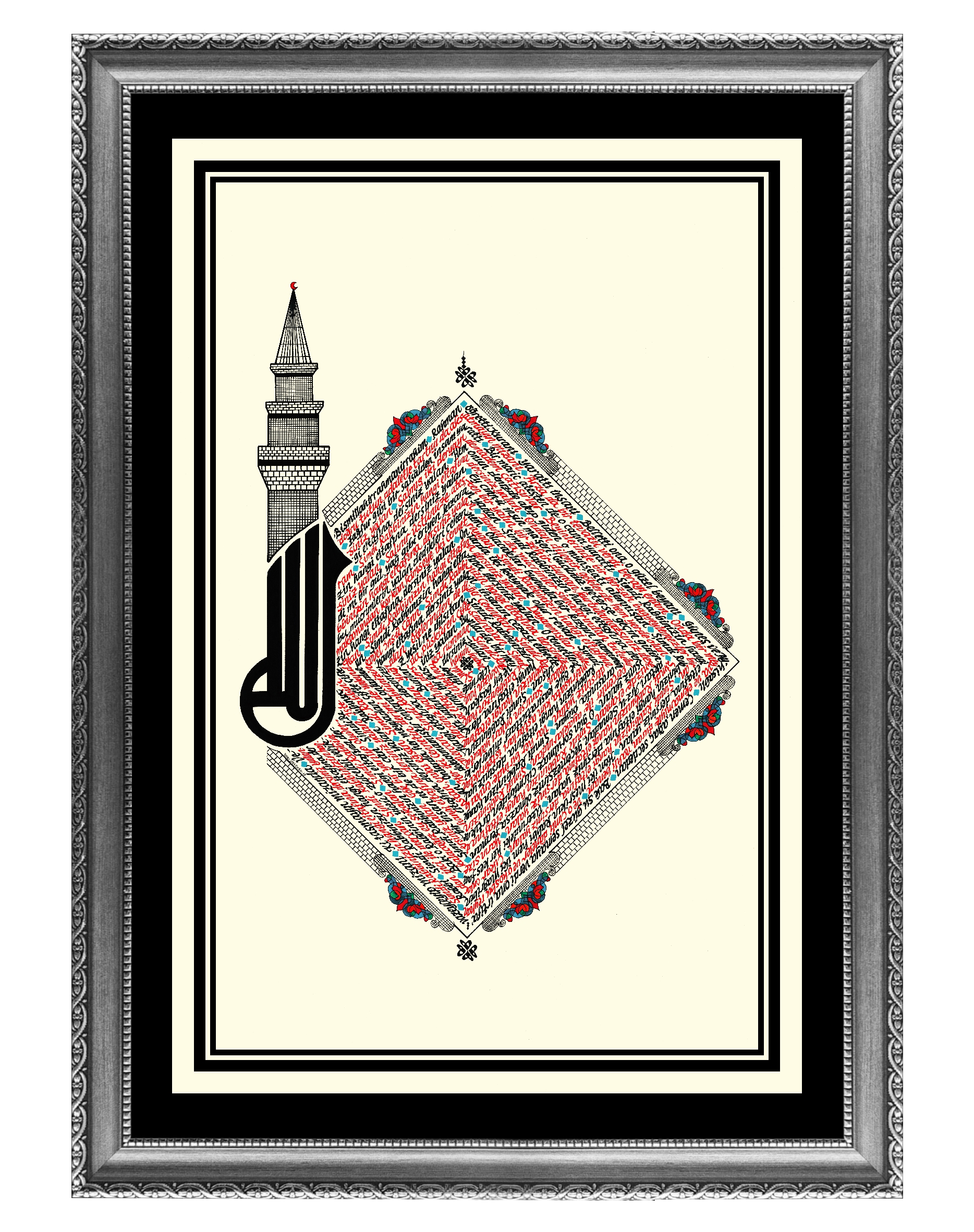 Elmalılı Hamdi Yazır’ın sadeleştirilmeyen özgün Türkçe meali “Rahman Suresi.” Eserin bütünlüğü dikey kare görseline sahip. Sol bölüme Arapça kufi yazıyla özgün “ALLAH” C.C. ve minare tasarımı işlenerek, kare içerisine Rahman Suresi’nin Türkçe meali kırmızı ve siyah mürekkeple yazılı. Krem zemine çalışılmıştır.