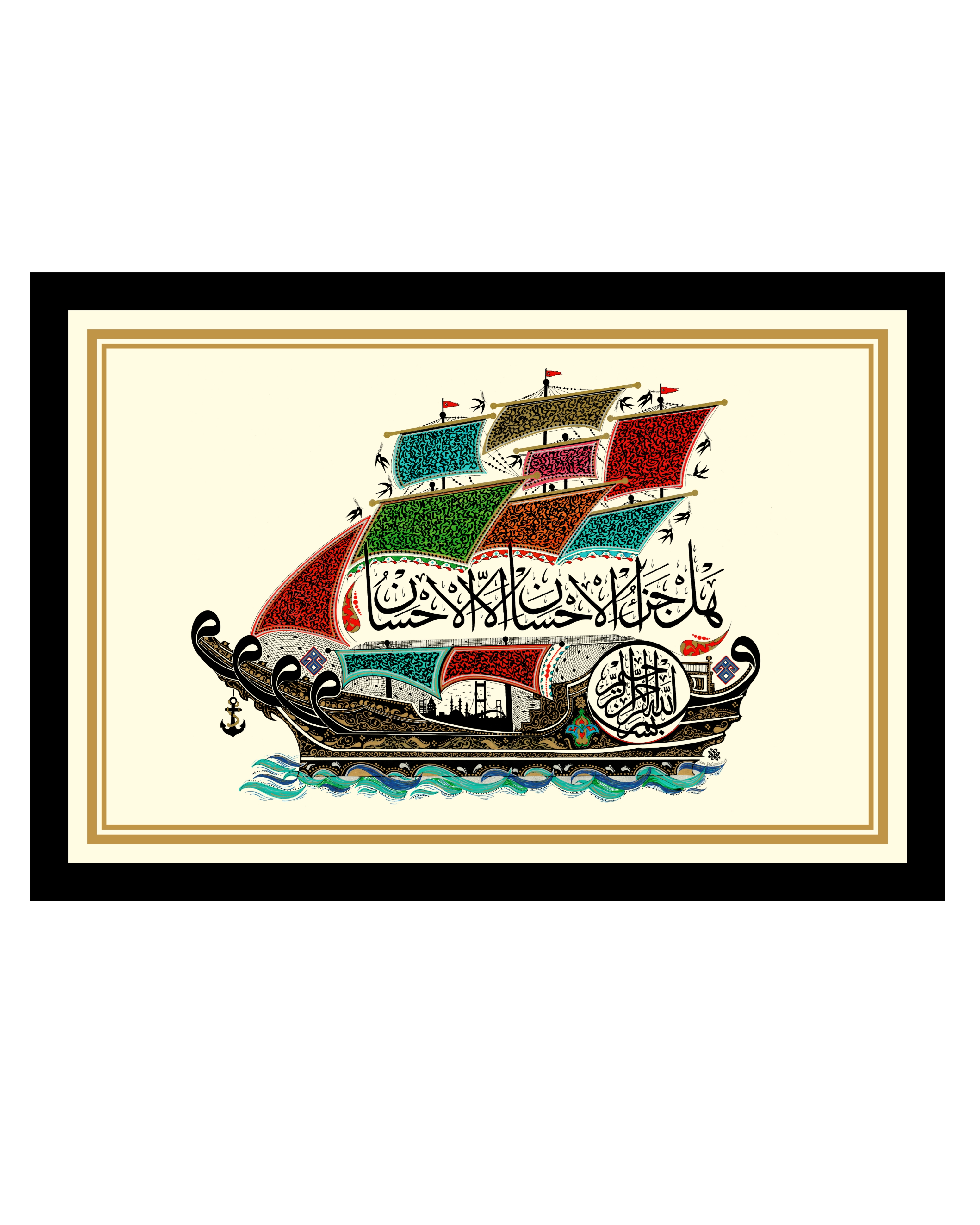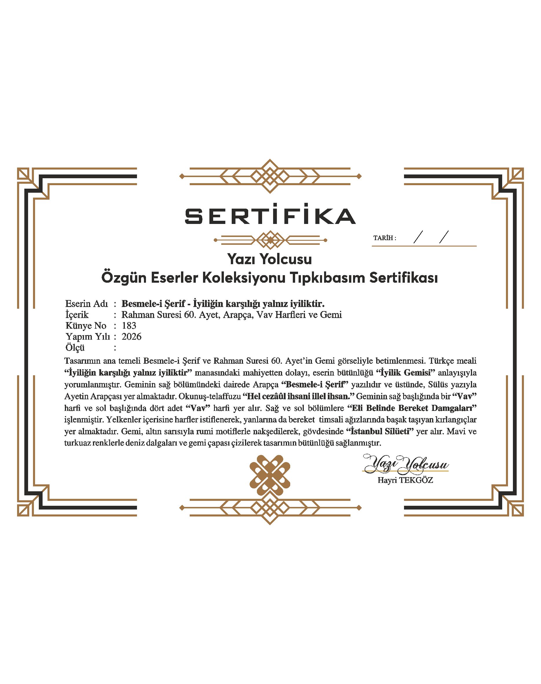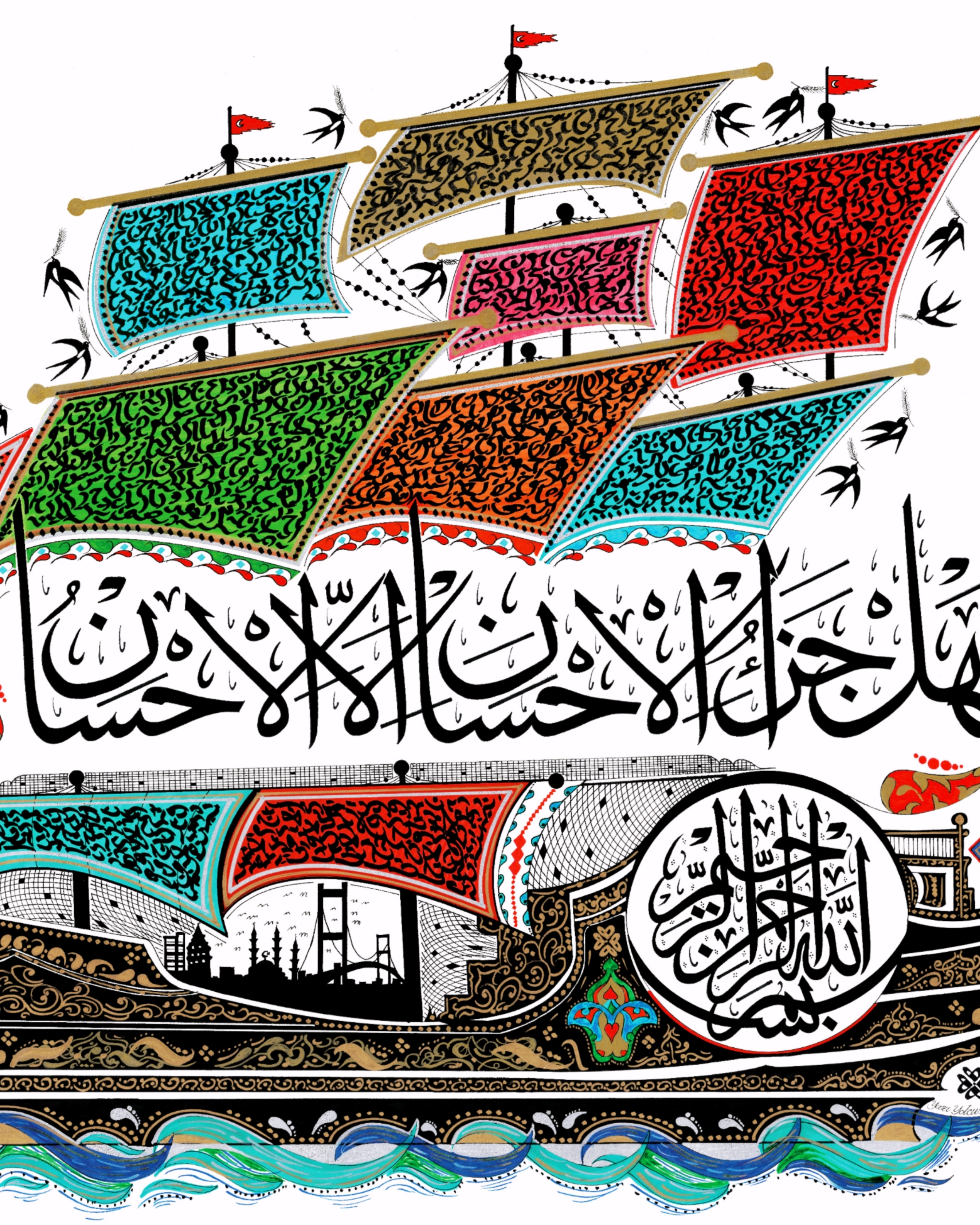 Tasarımın ana temeli Besmele-i Şerif ve Rahman Suresi 60. Ayet’in Gemi görseliyle betimlenmesi. Türkçe meali “İyiliğin karşılığı yalnız iyiliktir” manasındaki mahiyetten dolayı, eserin bütünlüğü “İyilik Gemisi” anlayışıyla yorumlanmıştır. Geminin sağ bölümündeki dairede Arapça “Besmele-i Şerif” yazılıdır ve üstünde, Sülüs yazıyla Ayetin Arapçası yer almaktadır. Okunuş-telaffuzu “Hel cezâûl ihsani illel ihsan.” Geminin sağ başlığında bir “Vav” harfi ve sol başlığında dört adet “Vav” harfi yer alır. Sağ ve sol bölümlere “Eli Belinde Bereket Damgaları” işlenmiştir. Yelkenler içerisine harfler tasarlanarak, yanlarına da ağızlarında başak taşıyan kırlangıçlar yer almaktadır. Gemi, altın sarısı rumi motiflerle nakşedilerek, gövdesinde “İstanbul Silüeti” yer alır. Mavi ve turkuaz renklerle deniz dalgaları ve gemi çapası çizilerek tasarım bütünlüğü sağlanmıştır.