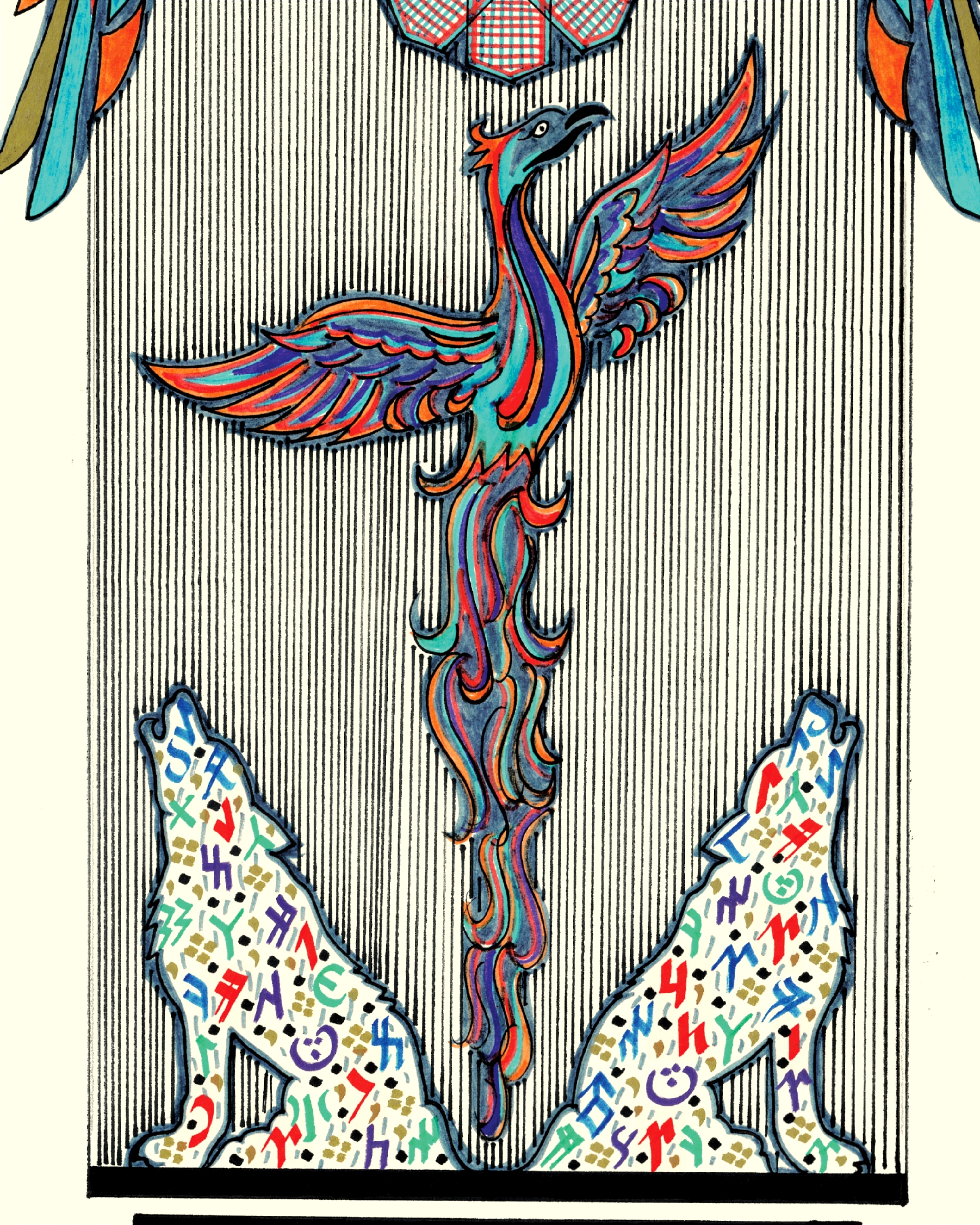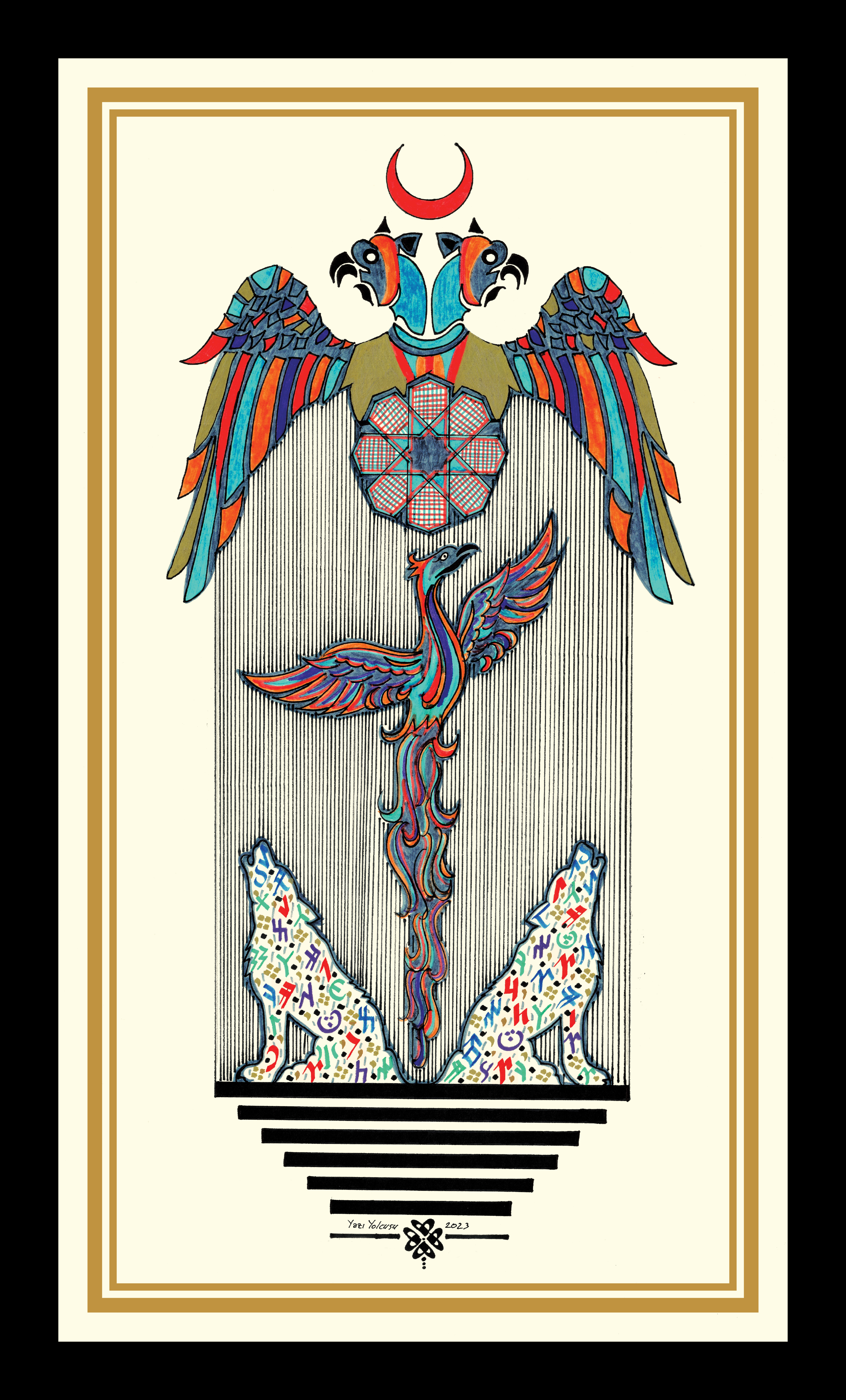 Mimari Orhun Anıtı formunda, Hilal taçlı, çift başlı Selçuklu kartalı, Selçuklu yıldızı, Anka Tuğrul kuşu ve Kurt tasarımı. Kurtlardan yukarıya doğru Anka kuşuyla küllerinden yeniden dirilen ve Türeyiş Destanı Ergenekon’dan çıkışa ve doğuşa vurgu yapılmıştır. Hilal göğe bakarken, kartal ve kurtlar doğuya ve batıya bakıyor, merkez gövde ise Selçuklu yıldızıyla bütünleştirilerek betimlenmiştir. Krem zemin üzerine çalışıldı.