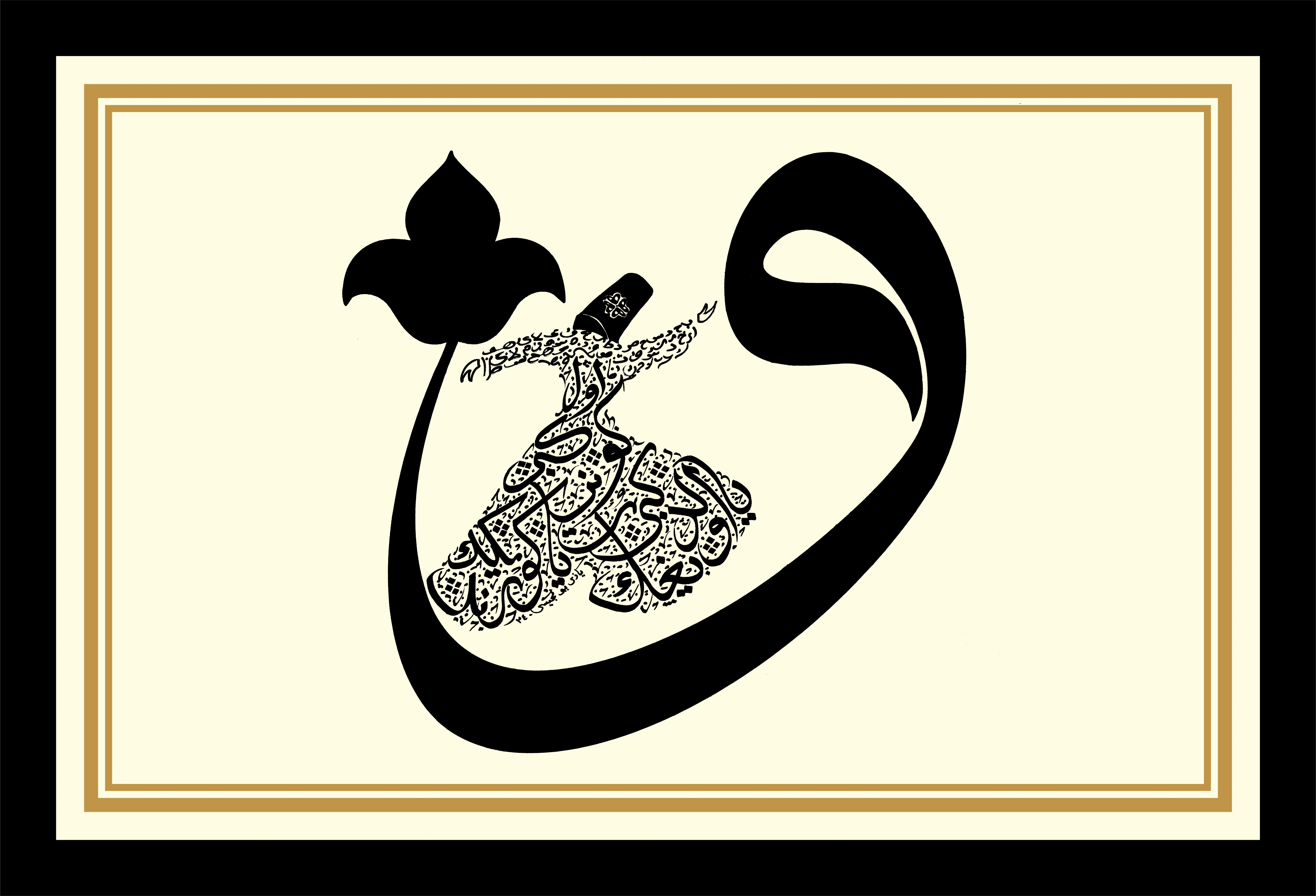 Vav harfi. Semazen içerisine Osmanlı Türkçesiyle Mevlana Celaleddin Rumi’nin sözü “Ya olduğun gibi görün, ya göründüğün gibi ol” yazmaktadır.