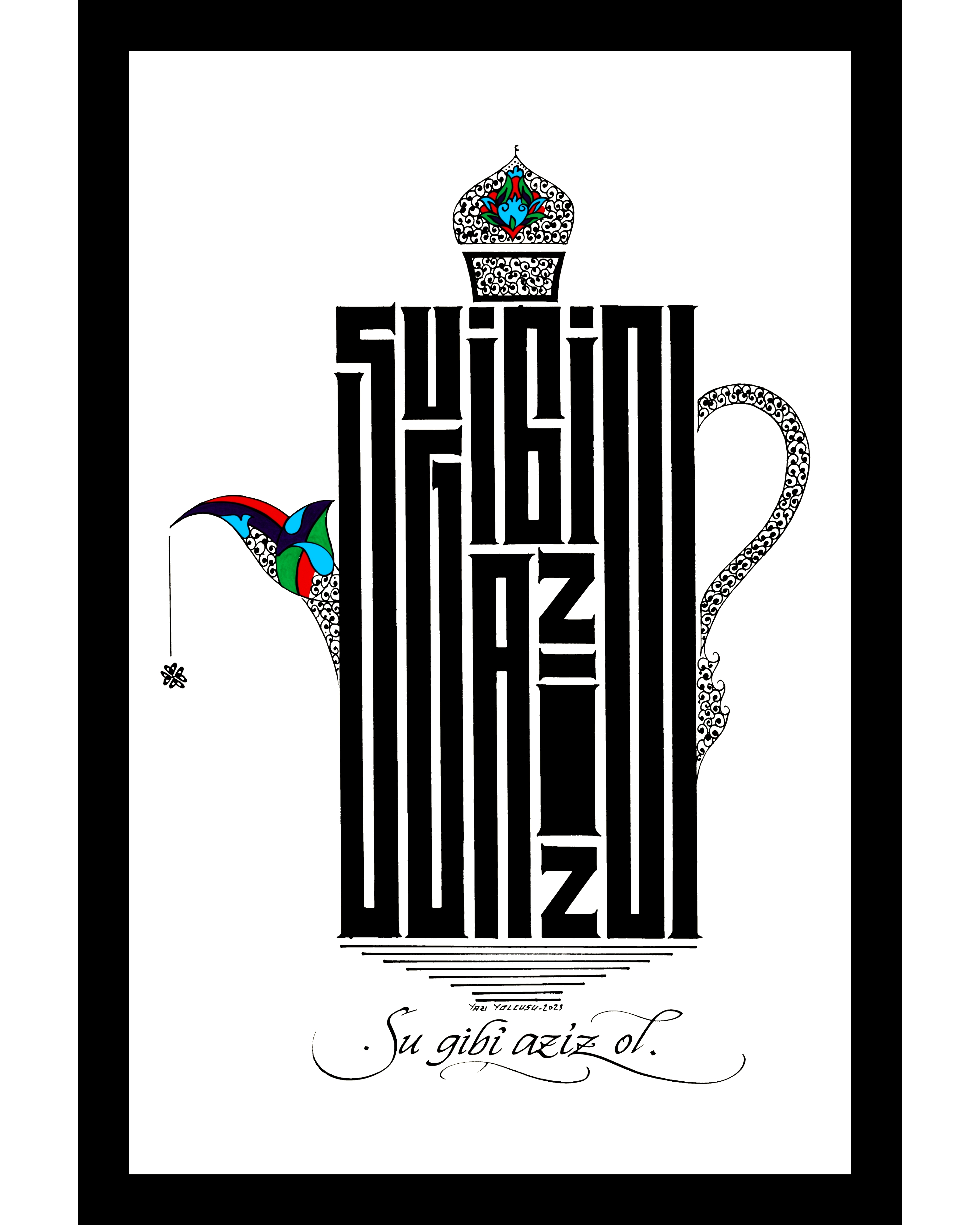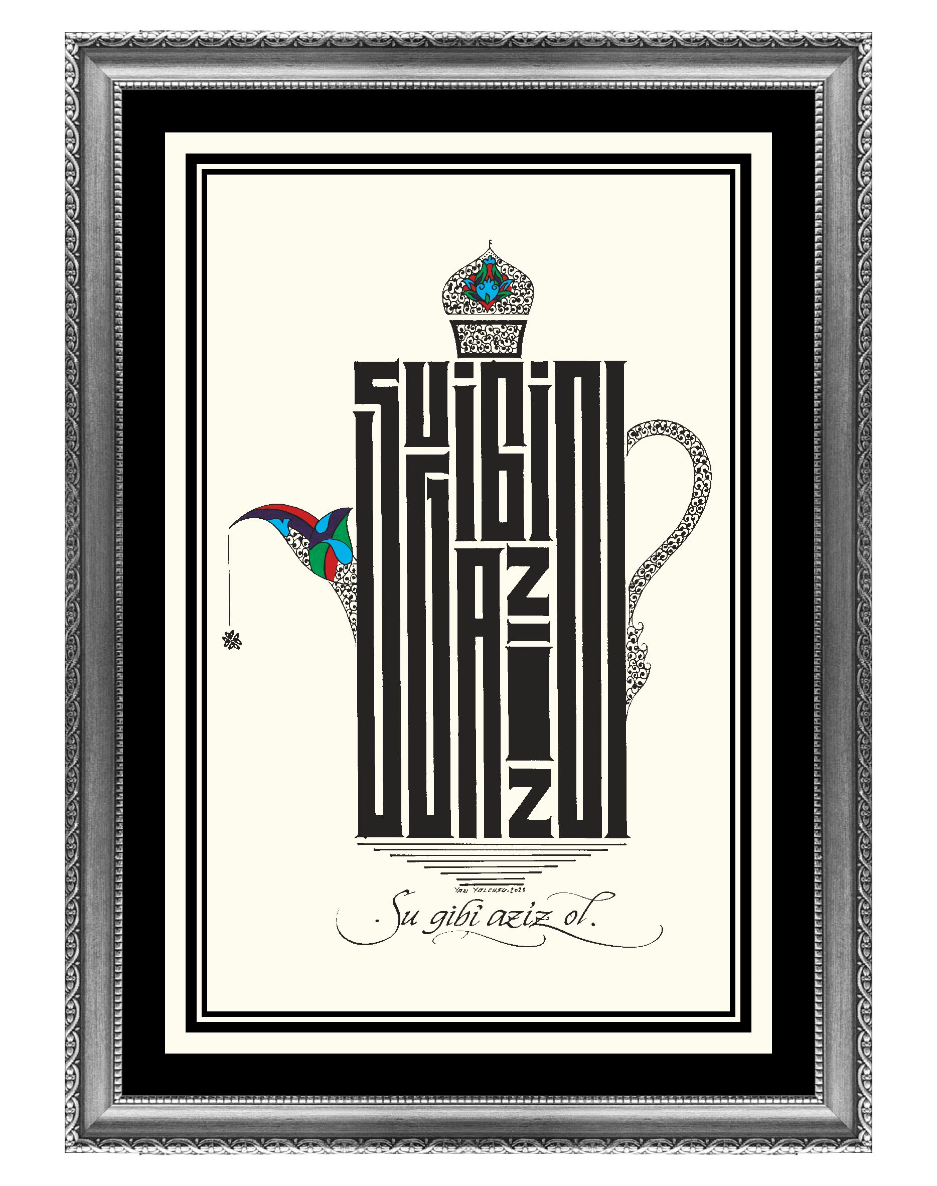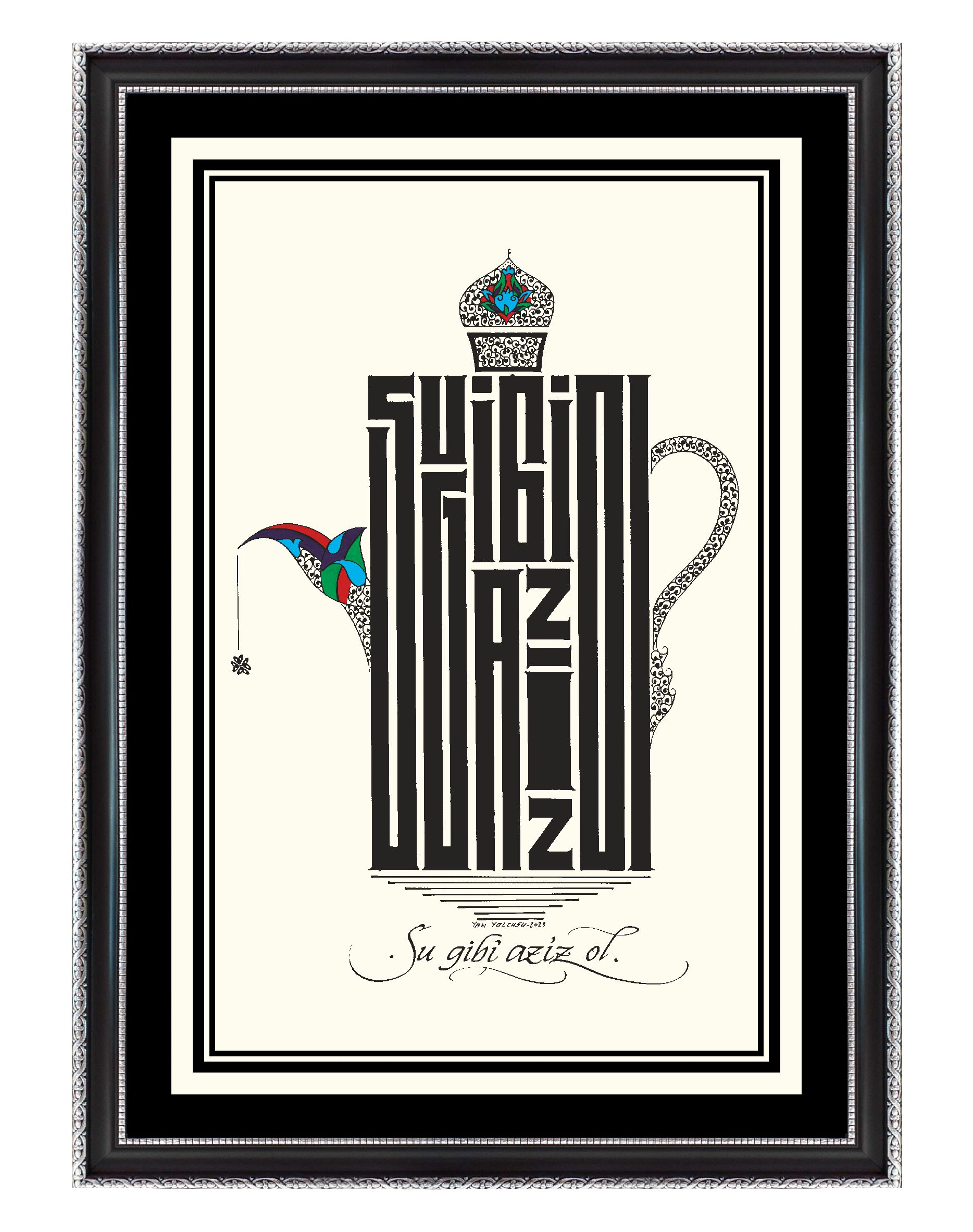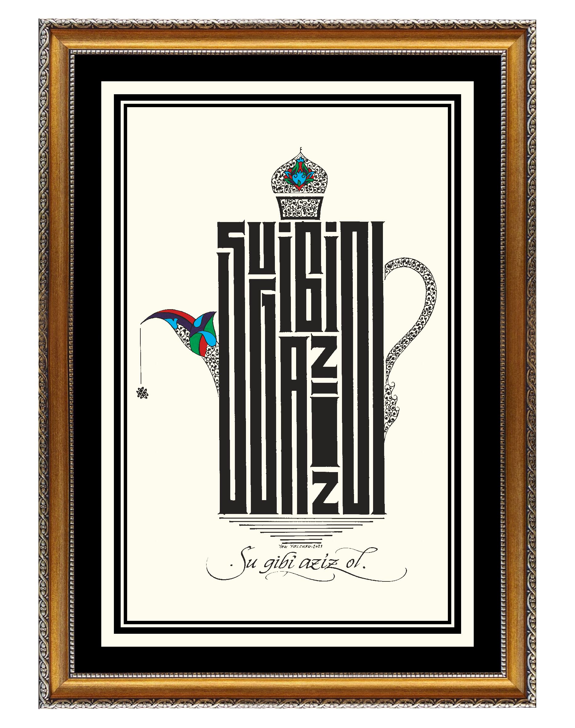 “Su gibi aziz ol.” Dua ve teşekkür niyetiyle söylenilen mecazi bir ifade. Su candır, temizdir, aziz ve kutsaldır. Ana gövde sert köşeli kufi ve mâkıli yazı çeşidiyle özgün biçimde yorumlanarak aynı söz yazılıdır. Rûmi motiflerle bezenerek sürâhi görselinde tasarlanmıştır.