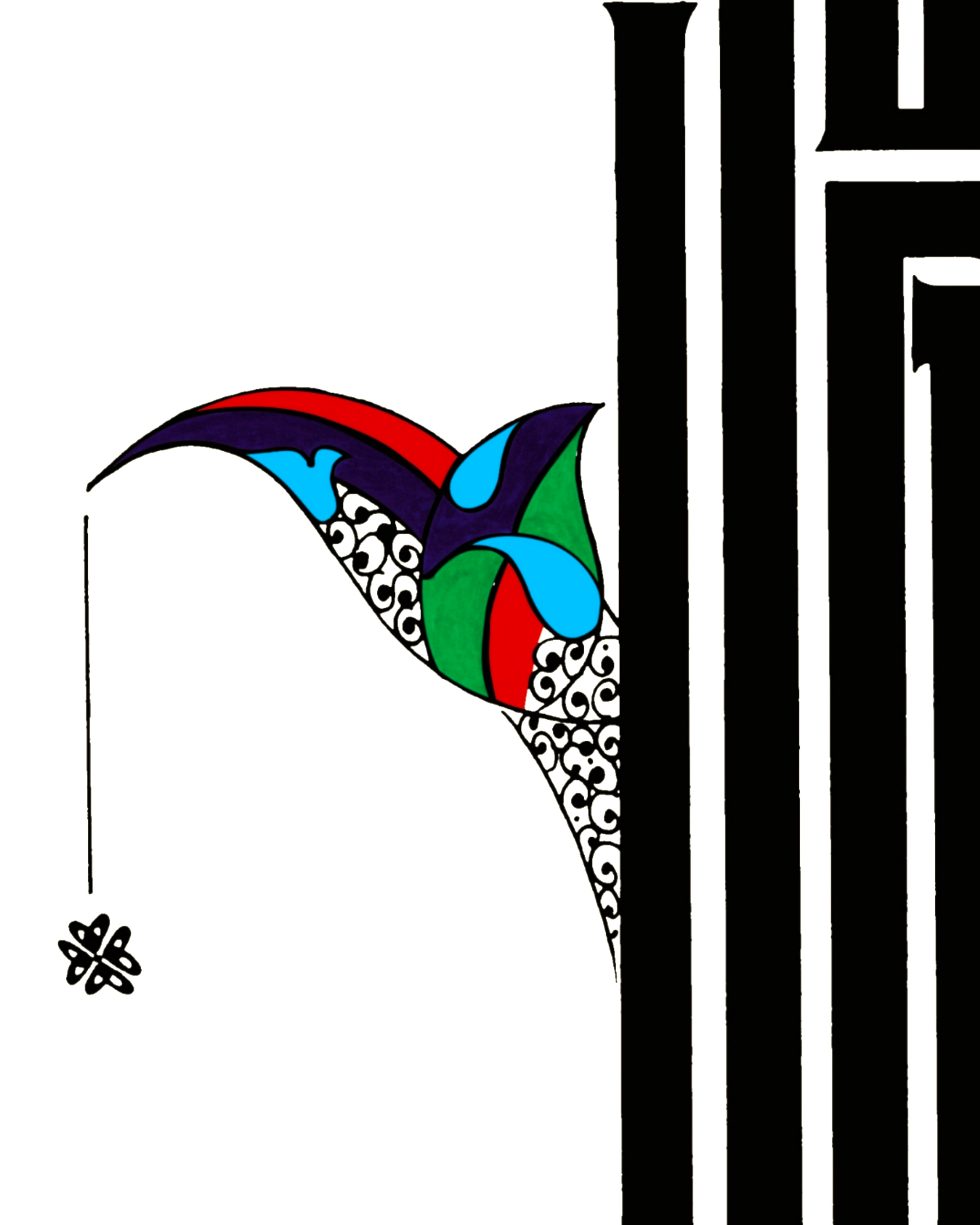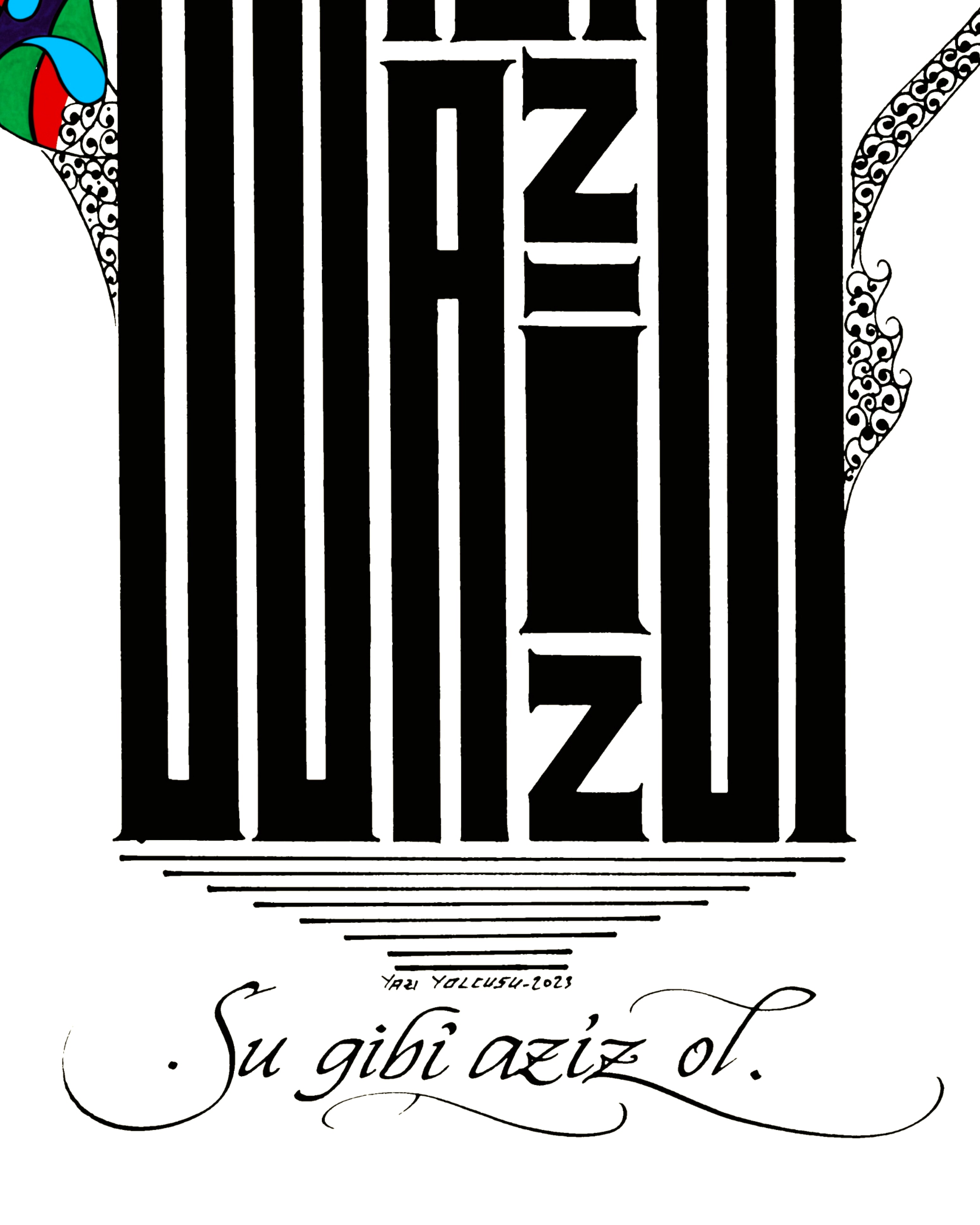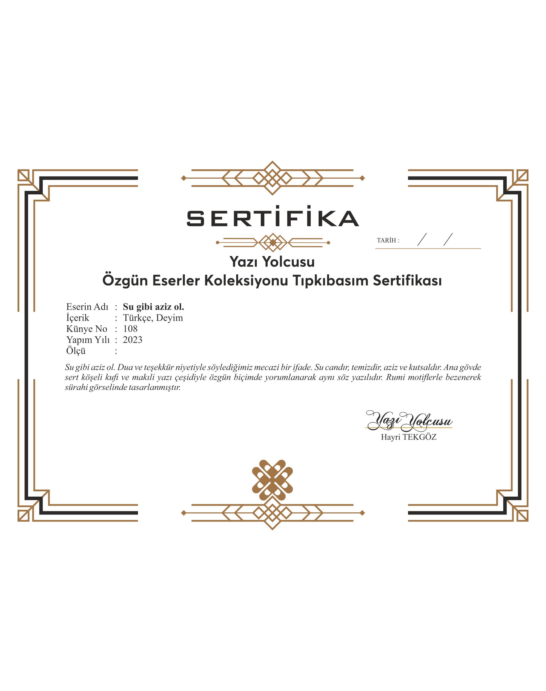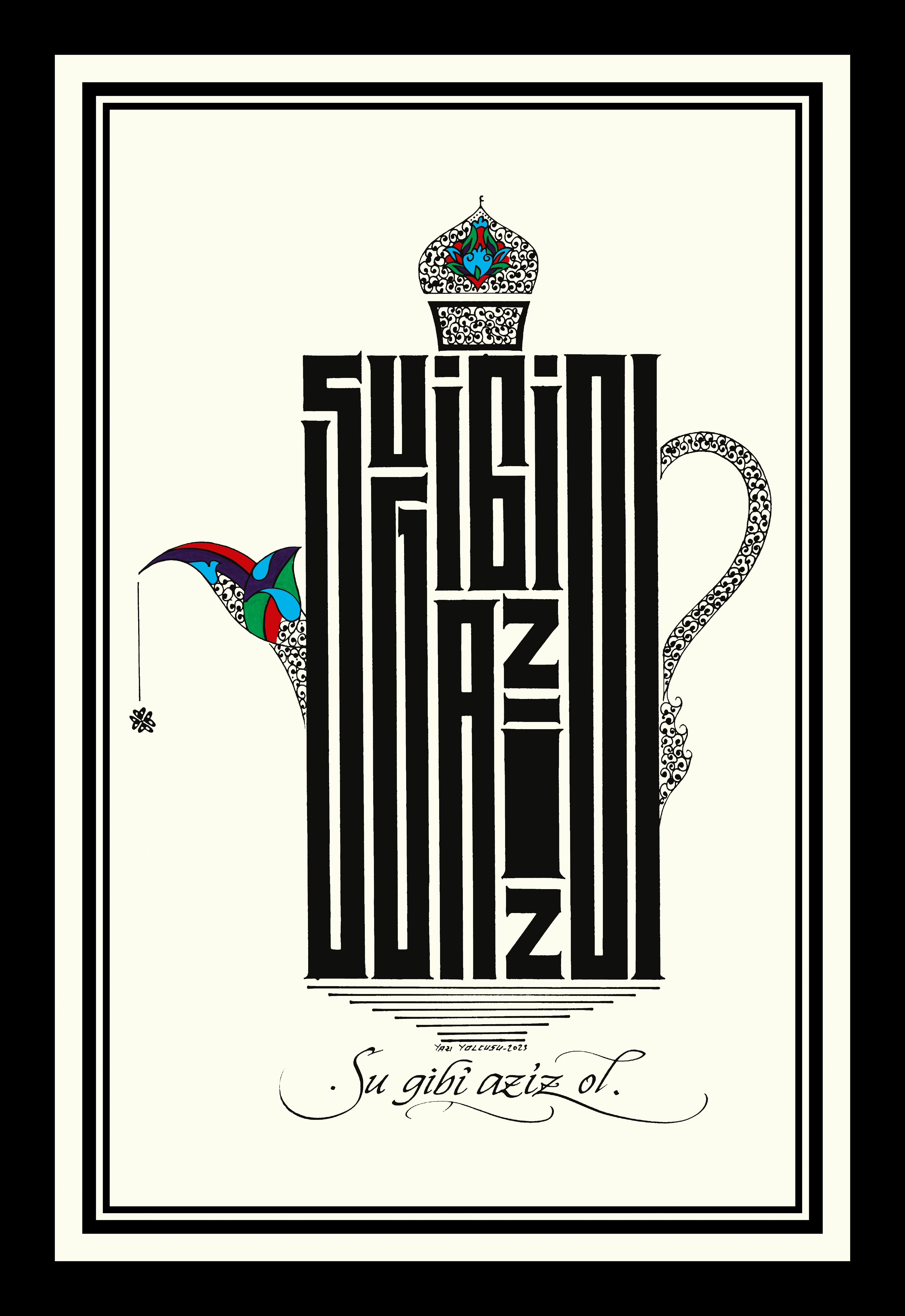 “Su gibi aziz ol.” Dua ve teşekkür niyetiyle söylenilen mecazi bir ifade. Su candır, temizdir, aziz ve kutsaldır. Ana gövde sert köşeli kufi ve mâkıli yazı çeşidiyle özgün biçimde yorumlanarak aynı söz yazılıdır. Rûmi motiflerle bezenerek sürâhi görselinde tasarlanmıştır.