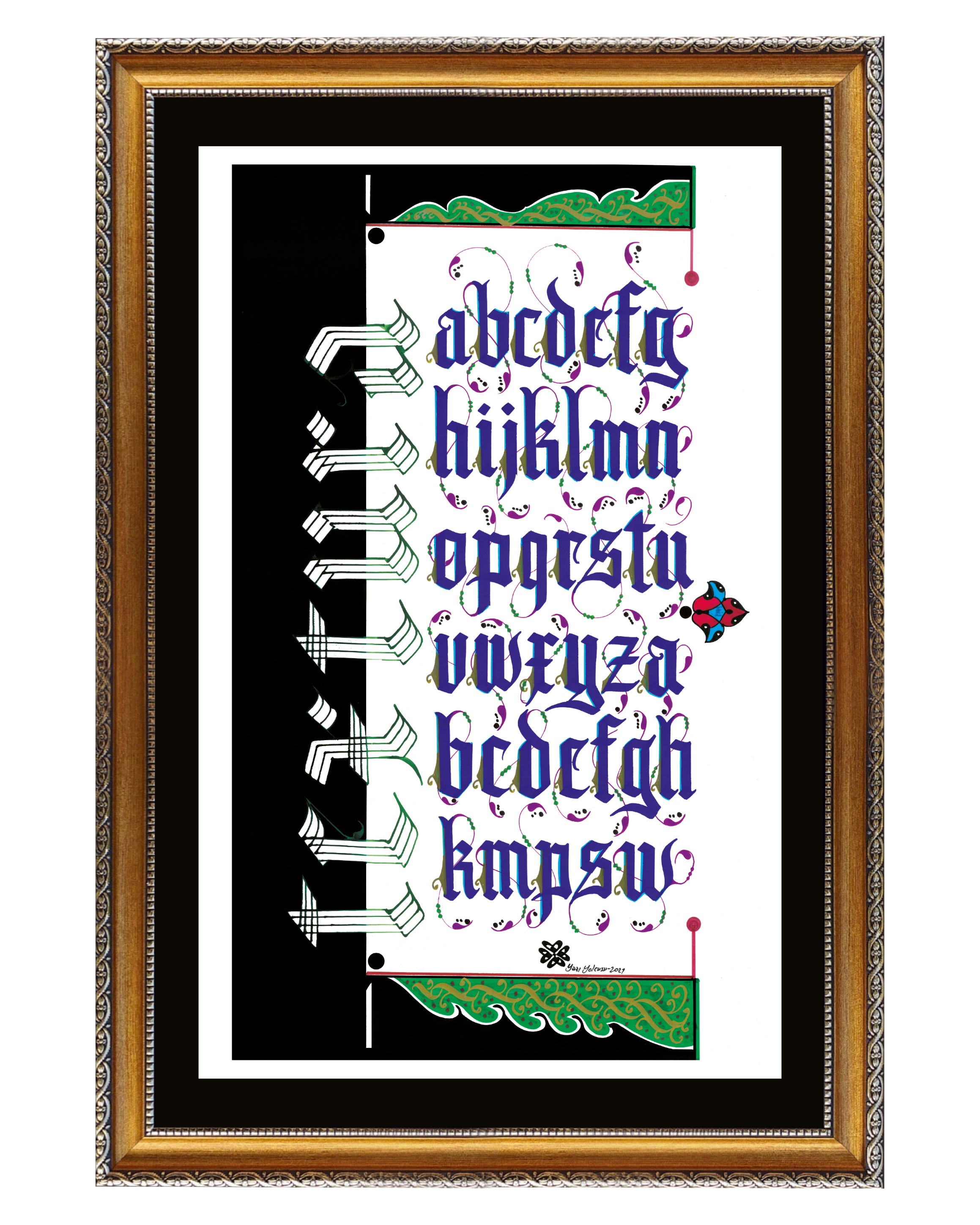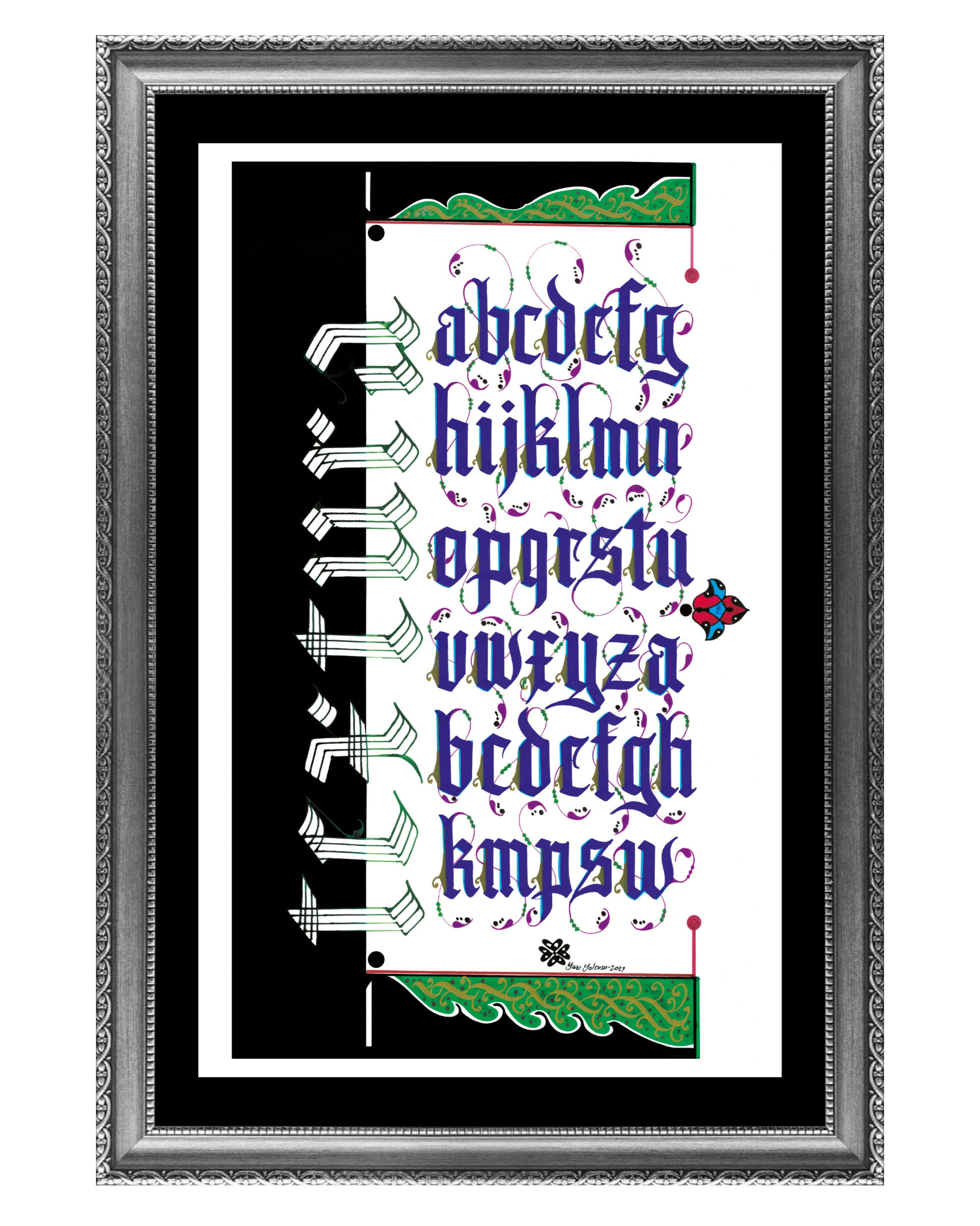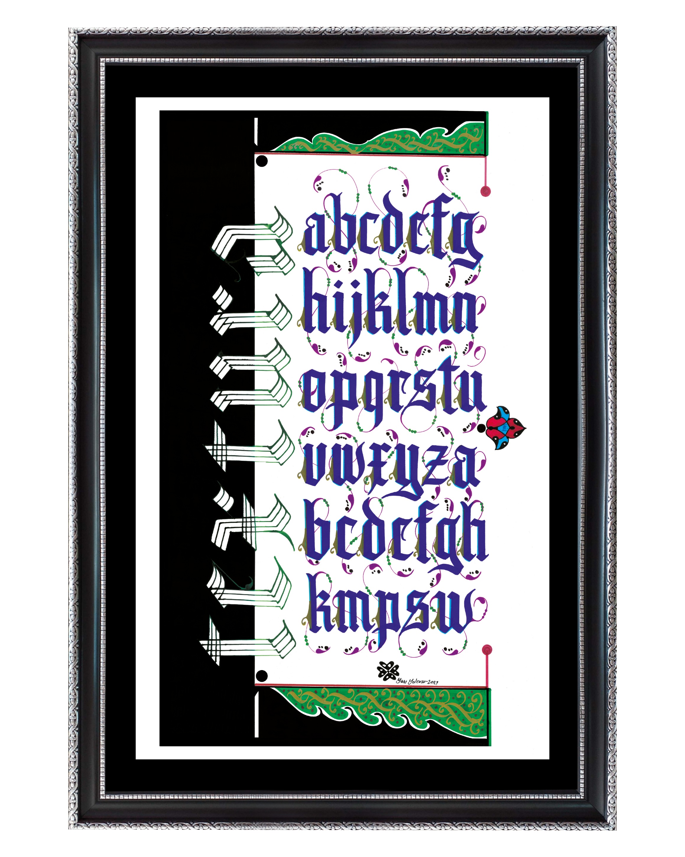 Kaligrafi yazı çeşitlerinden “Textura” adlı harflerin tablosu. Beyaz zemine siyah ve yeşil boyamalar kullanılarak harfler mavi renkle yazıldı ve harflerin uçlarına rumi motifler işlendi. Solda, yatay biçimde aşağıdan yukarıya doğru tasarlanan Textura kelimesi, çatalla yazıldı.