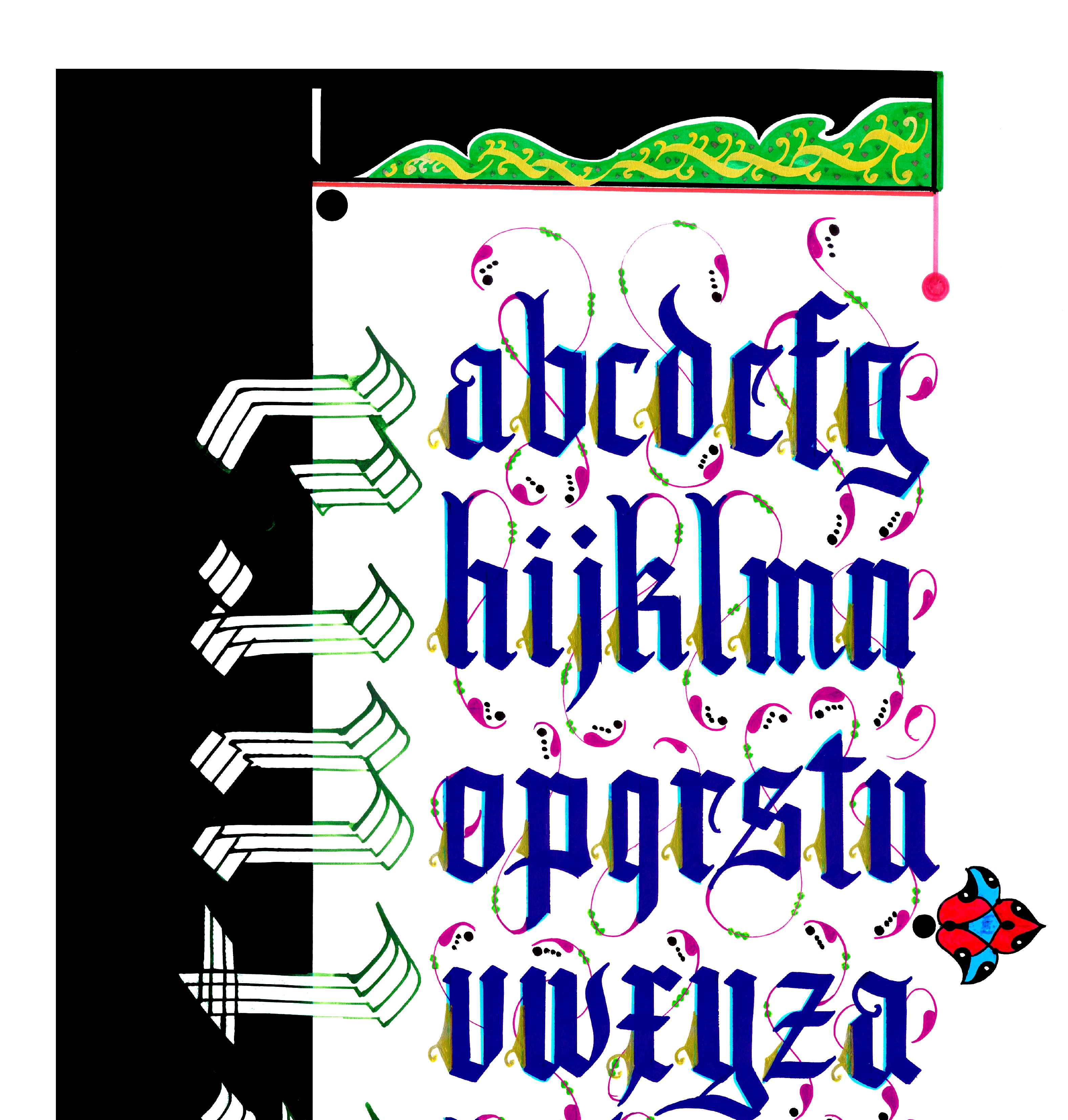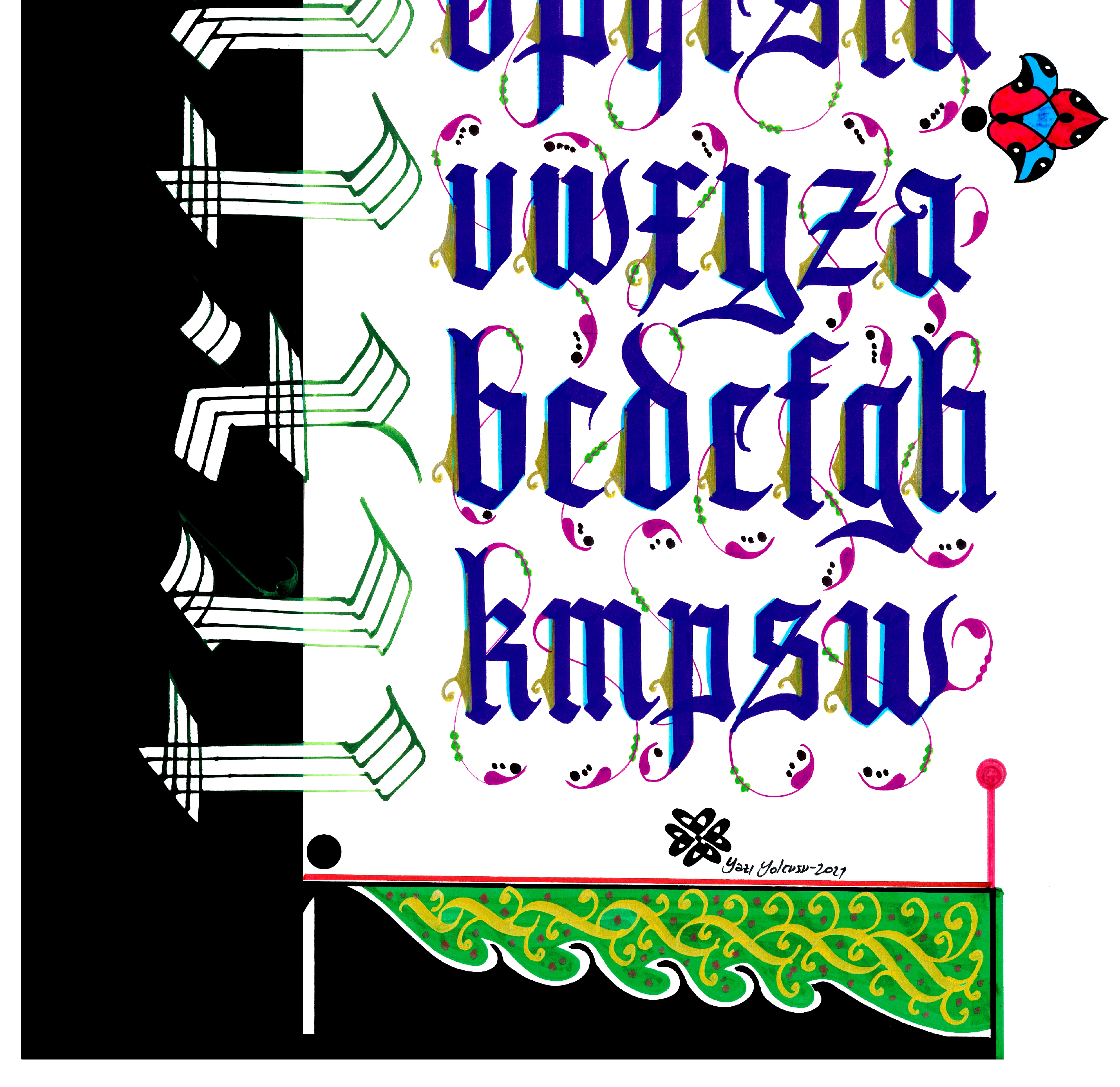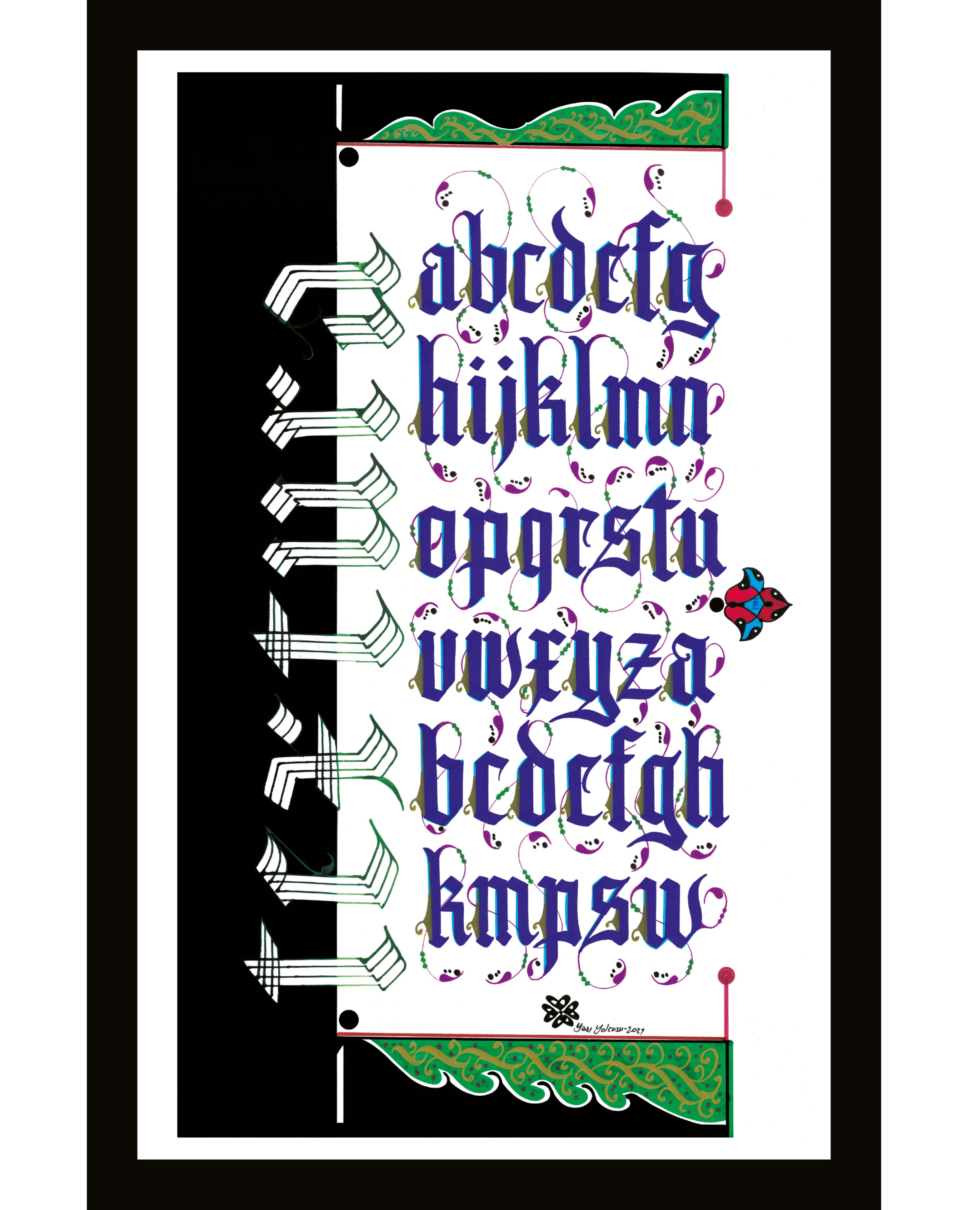 Kaligrafi yazı çeşitlerinden “Textura” adlı harflerin tablosu. Beyaz zemine siyah ve yeşil boyamalar kullanılarak harfler mavi renkle yazıldı ve harflerin uçlarına rumi motifler işlendi. Solda, yatay biçimde aşağıdan yukarıya doğru tasarlanan Textura kelimesi, çatalla yazıldı.