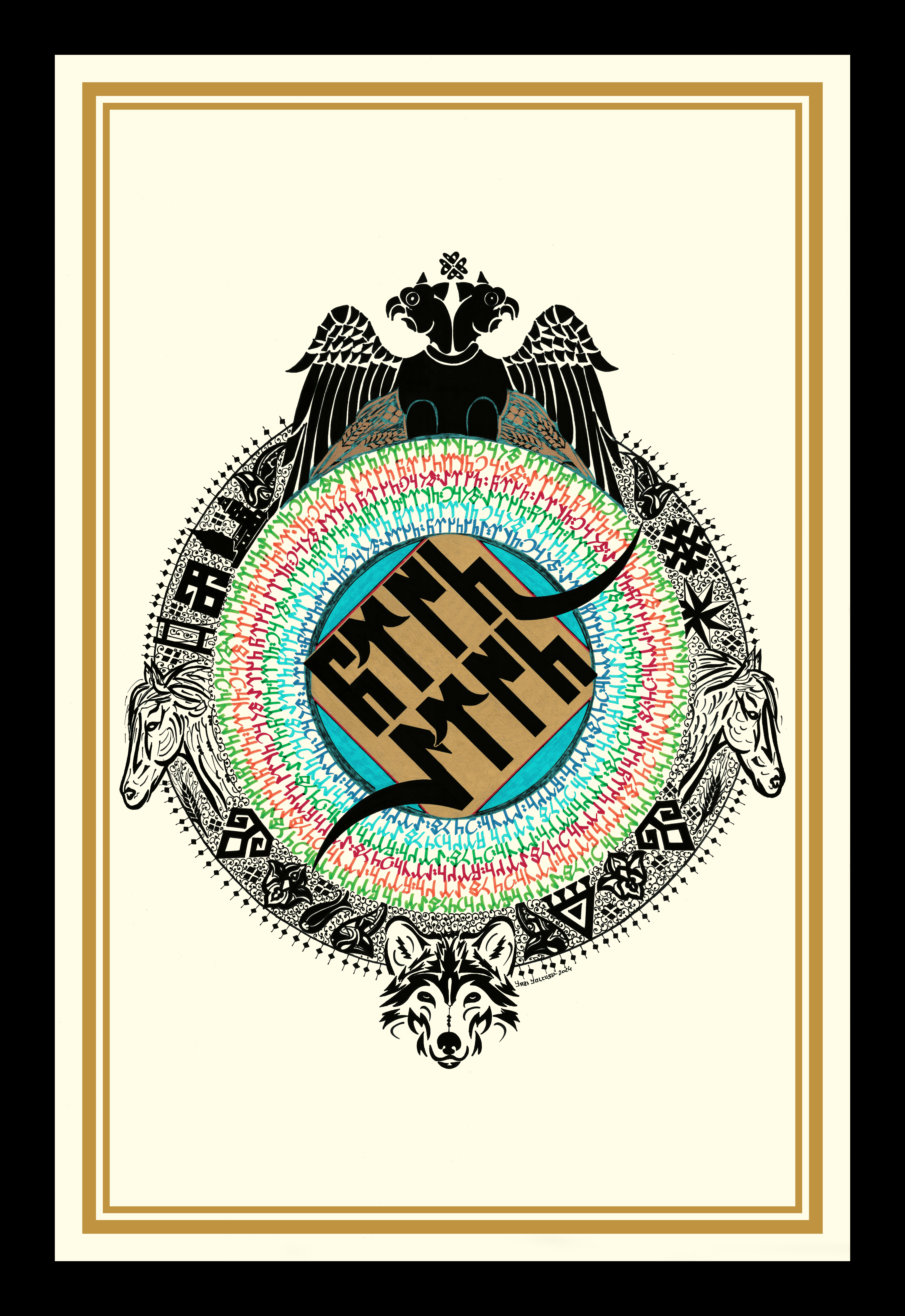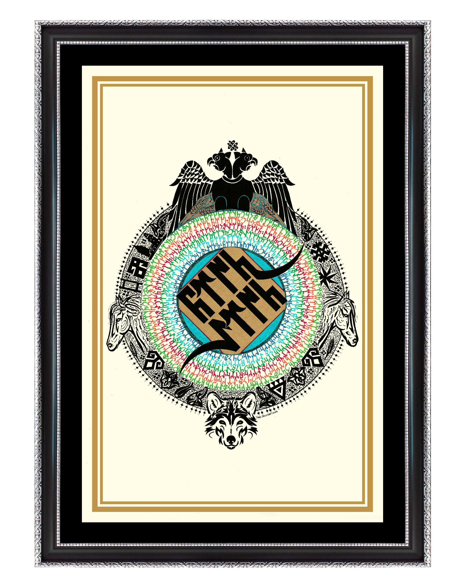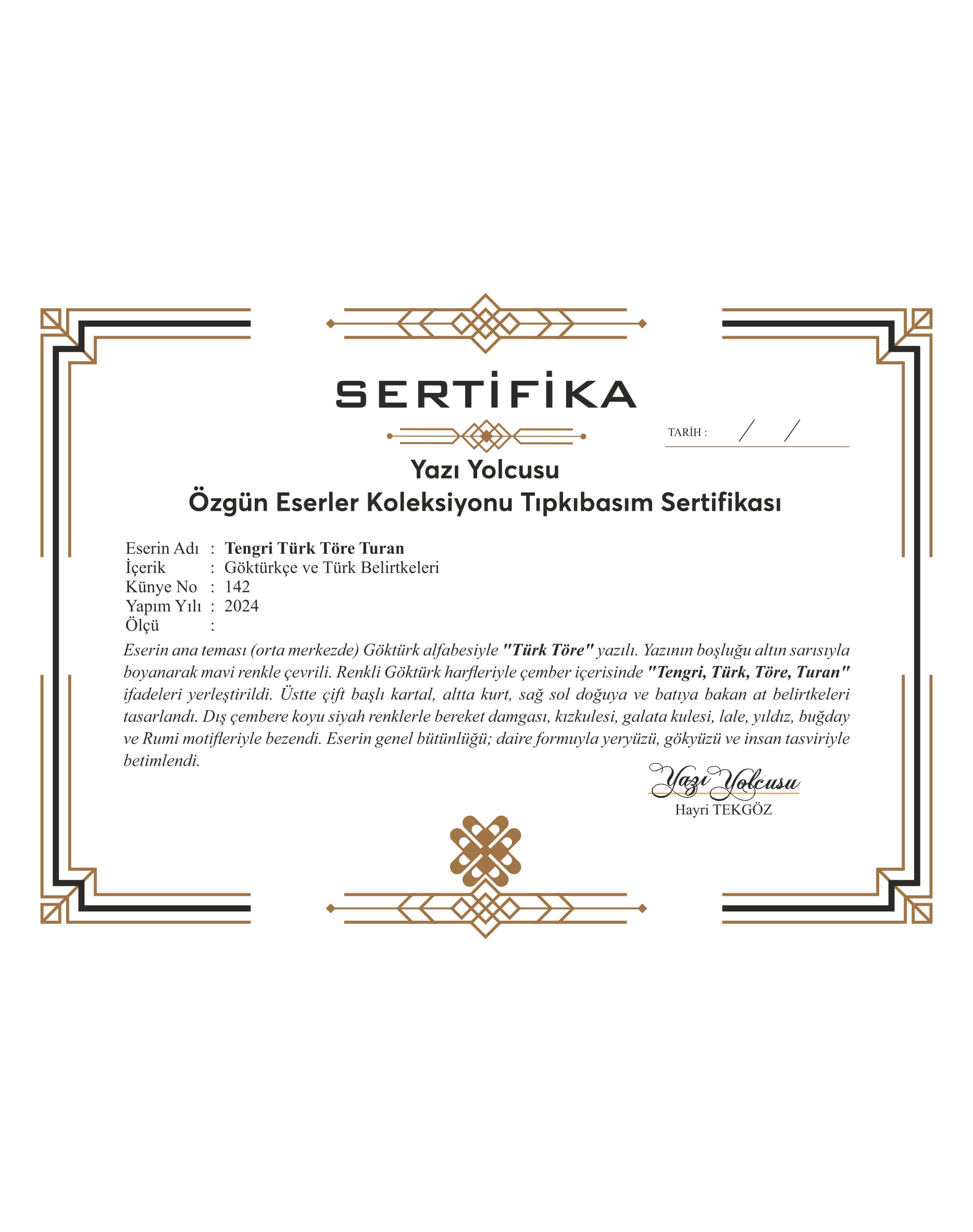 Eserin ana teması orta merkezde Göktürk alfabesiyle "Türk Töre" yazılı. Yazının boşluğu altın sarısıyla boyanarak mavi renkle çevrili. Renkli Göktürk harfleriyle çember içerisinde "Tengri, Türk, Töre, Turan" ifadeleri yerleştirildi. Üstte çift başlı kartal, altta kurt, sağ sol doğuya ve batıya bakan at belirtkeleri tasarlandı. Dış çemberde koyu siyah renklerle bereket damgası, kızkulesi, galata kulesi, lale, yıldız, buğday ve Rumi motifleriyle bezendi. Eserin genel bütünlüğü; daire formuyla yeryüzü, gökyüzü ve insan tasviriyle betimlendi.