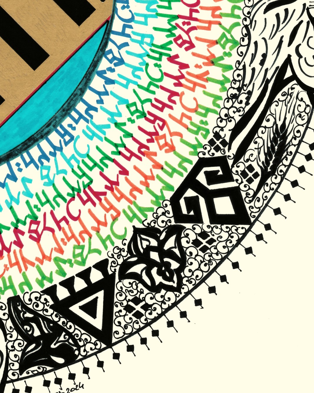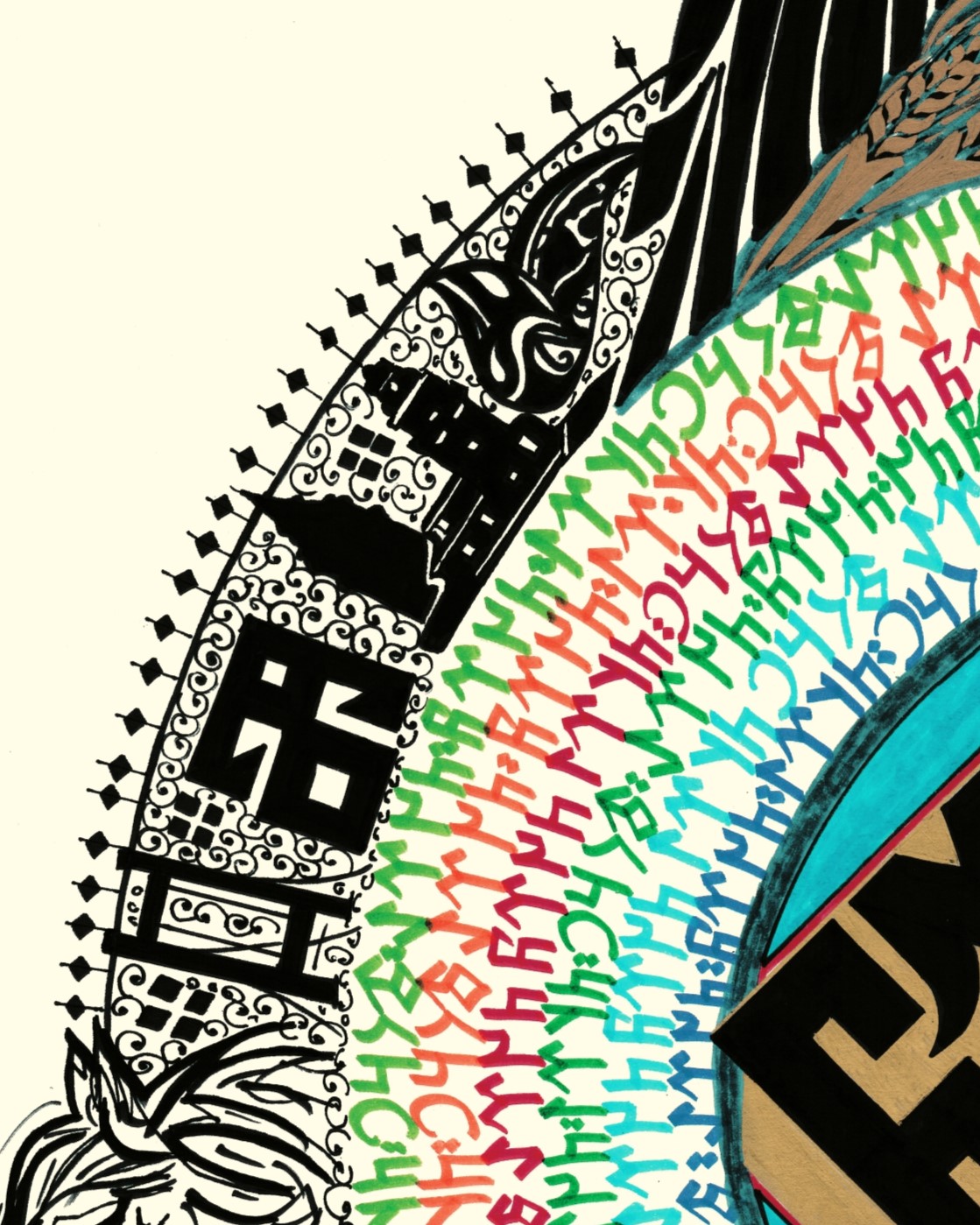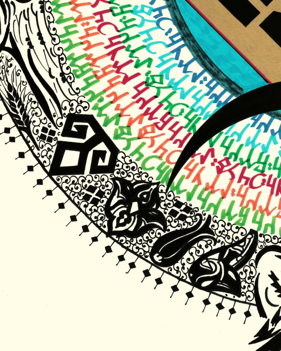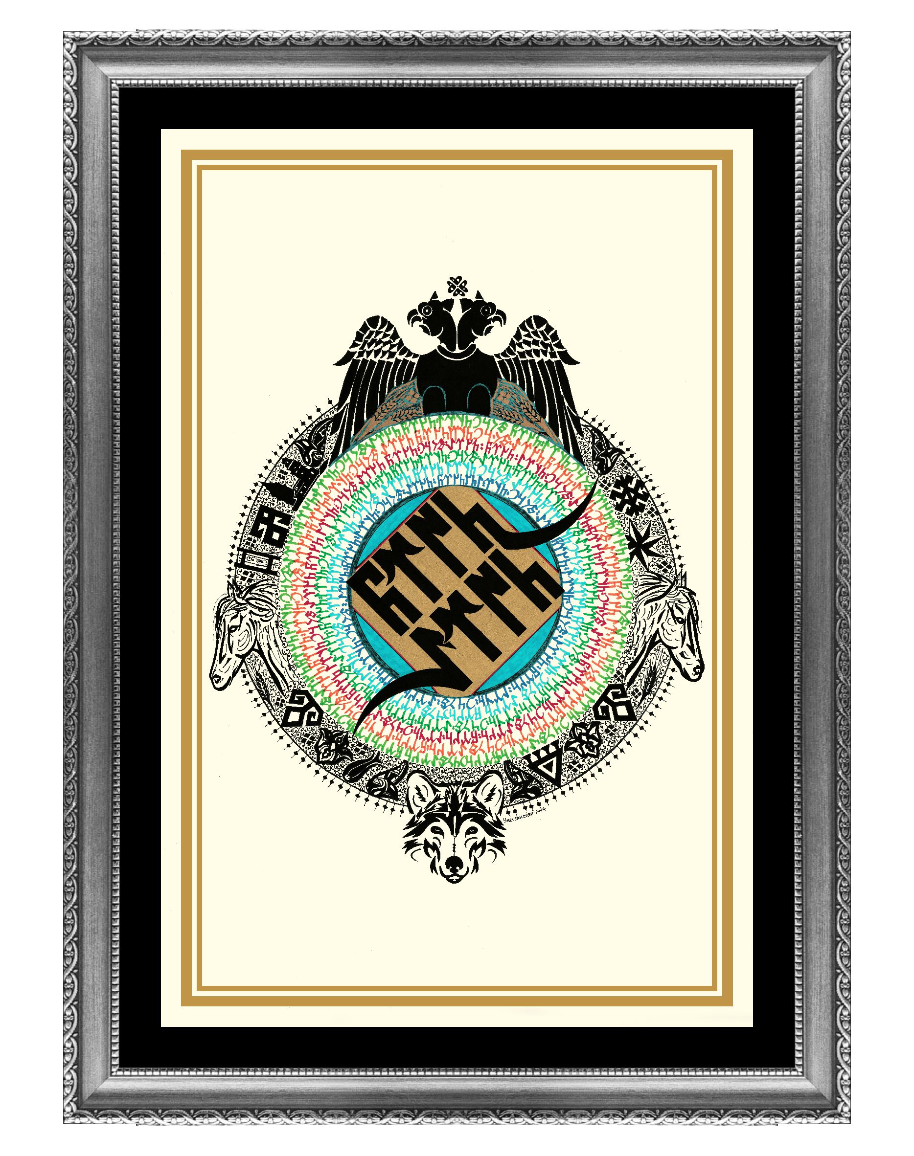 Eserin ana teması orta merkezde Göktürk alfabesiyle "Türk Töre" yazılı. Yazının boşluğu altın sarısıyla boyanarak mavi renkle çevrili. Renkli Göktürk harfleriyle çember içerisinde "Tengri, Türk, Töre, Turan" ifadeleri yerleştirildi. Üstte çift başlı kartal, altta kurt, sağ sol doğuya ve batıya bakan at belirtkeleri tasarlandı. Dış çemberde koyu siyah renklerle bereket damgası, kızkulesi, galata kulesi, lale, yıldız, buğday ve Rumi motifleriyle bezendi. Eserin genel bütünlüğü; daire formuyla yeryüzü, gökyüzü ve insan tasviriyle betimlendi.