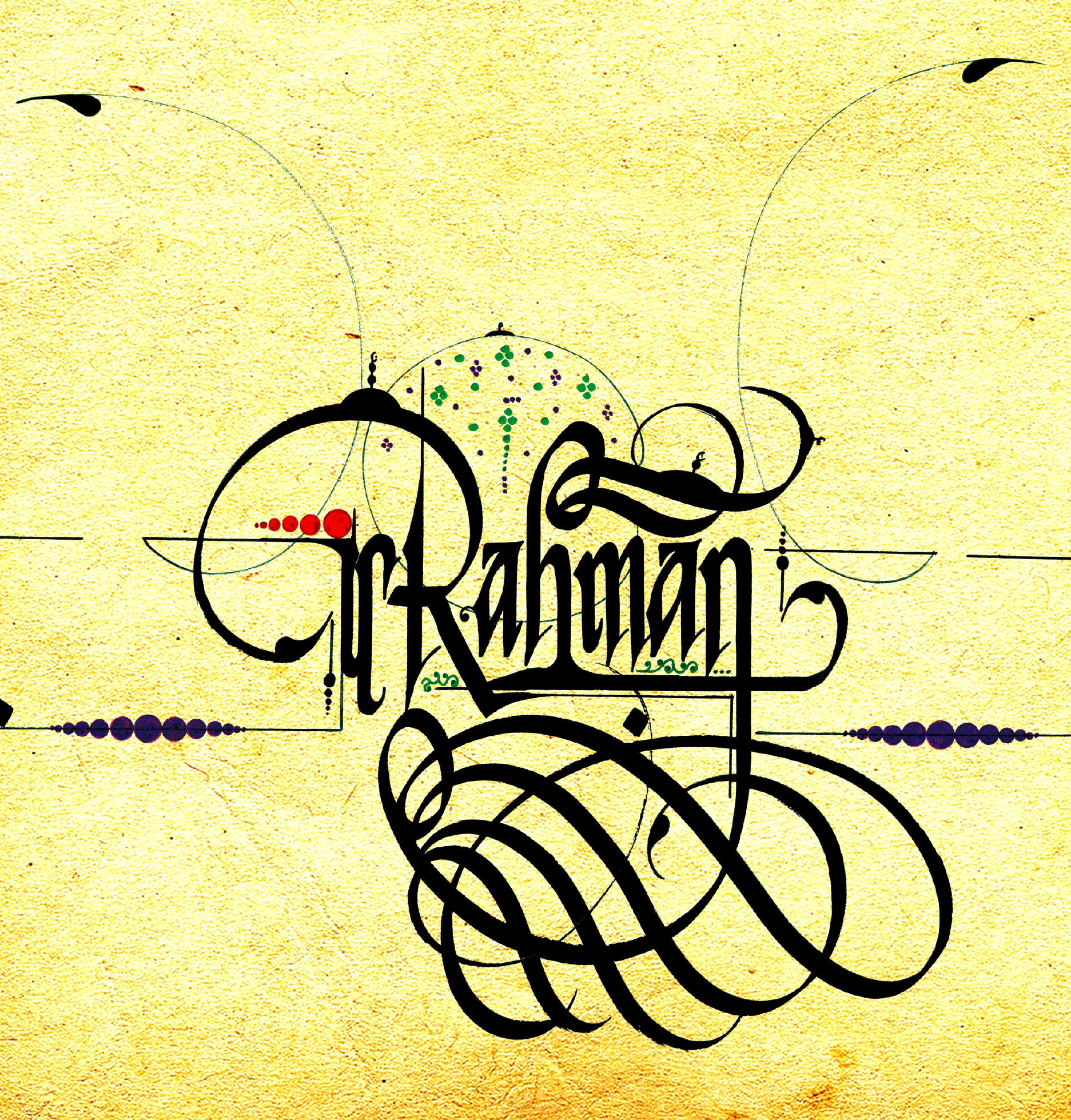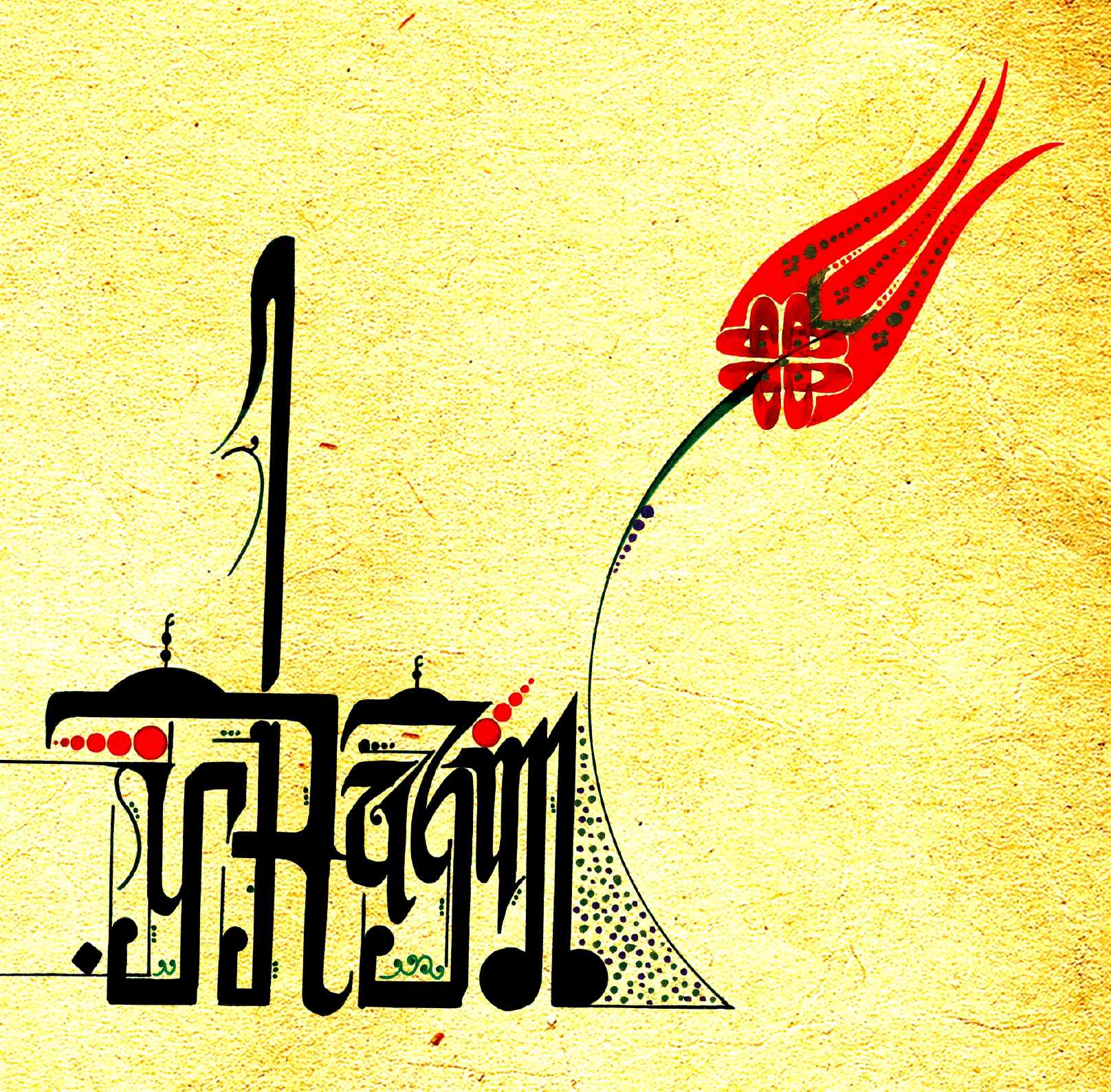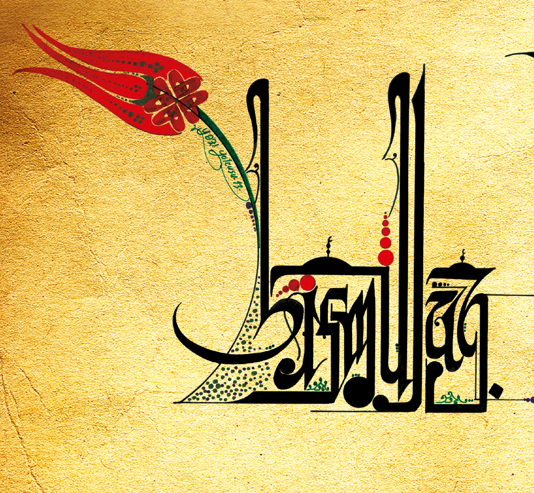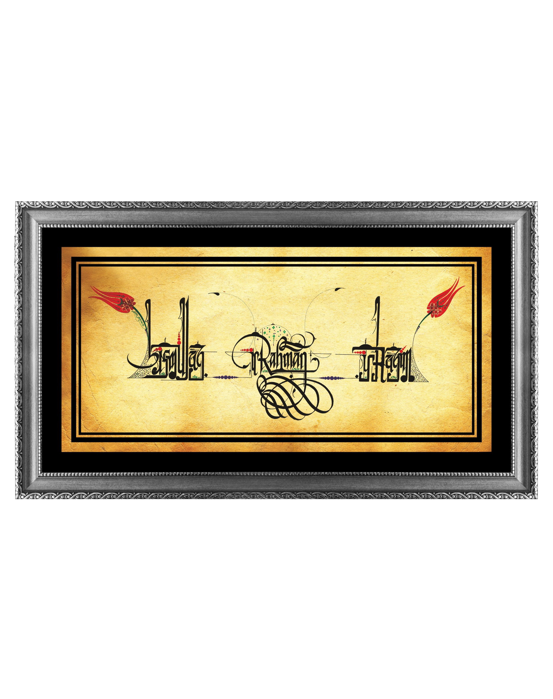 Eskitme zemin üzerine Latin harfleriyle Besmele’nin telaffuz biçimi “BismillahirRahmanirRahim”. Solda “Bismillah” ortada “irRahman” sağda “irRahim” biçiminde ve sağ sol uçlara lale motifleri bezenerek tasarlandı.