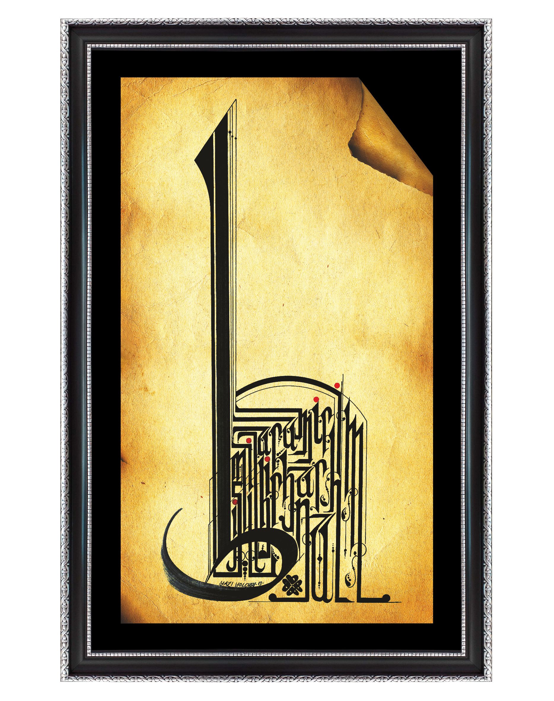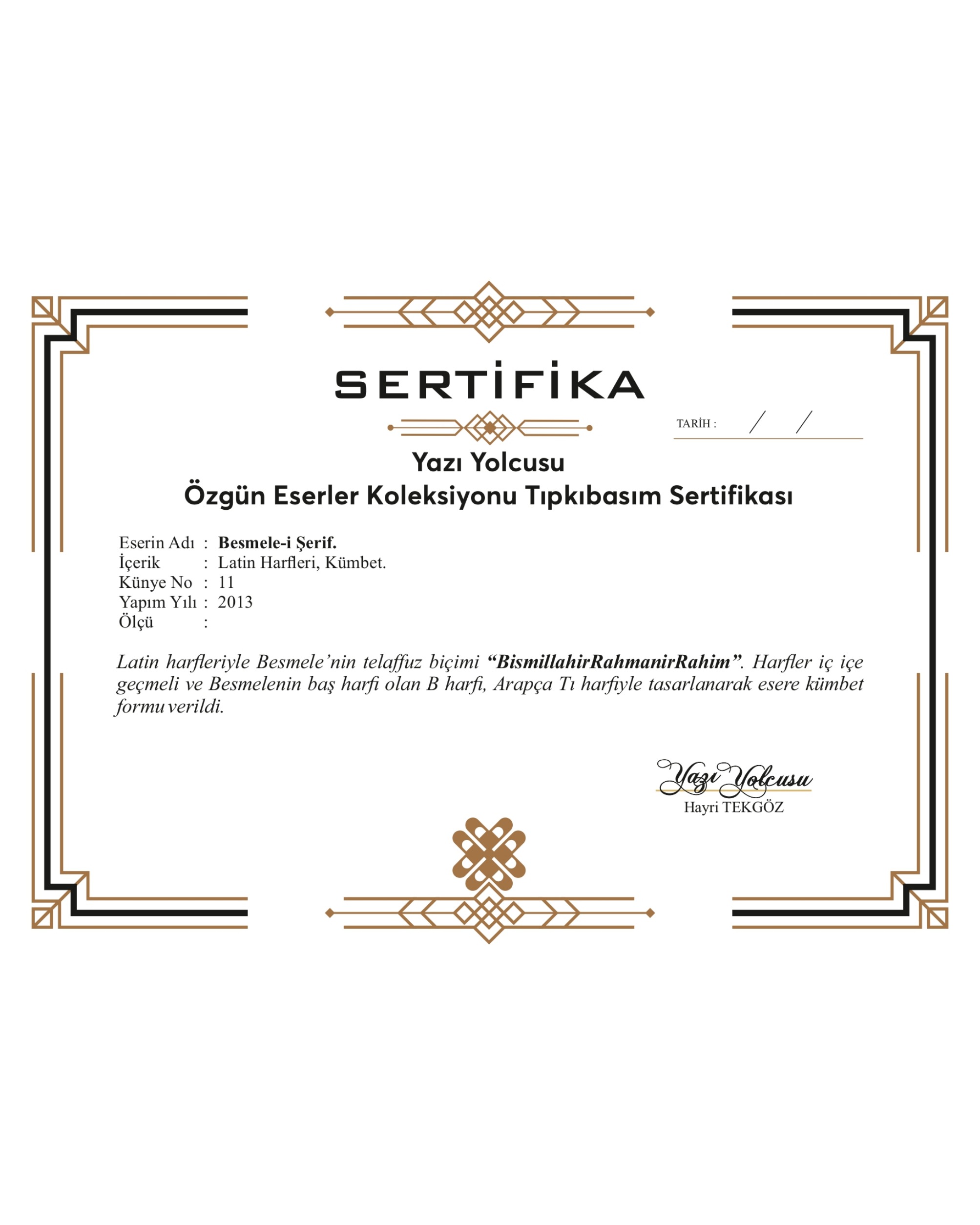 Eskitme zemine Latin harfleriyle Besmele’nin telaffuz biçimi “BismillahirRahmanirRahim”. Harfler iç içe geçmeli ve Besmelenin baş harfi olan B harfi, Arapçadaki Tı harfiyle tasarlanarak esere kümbet formu verildi.