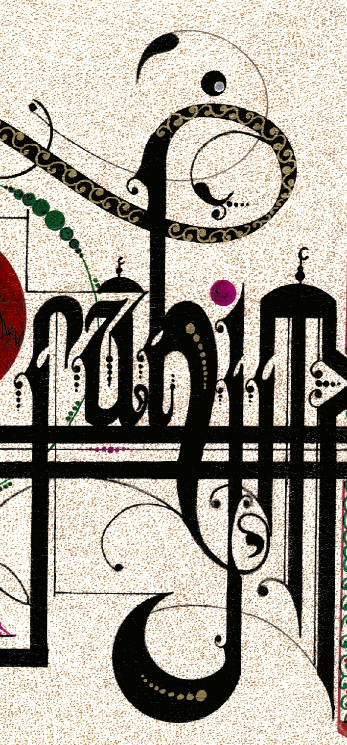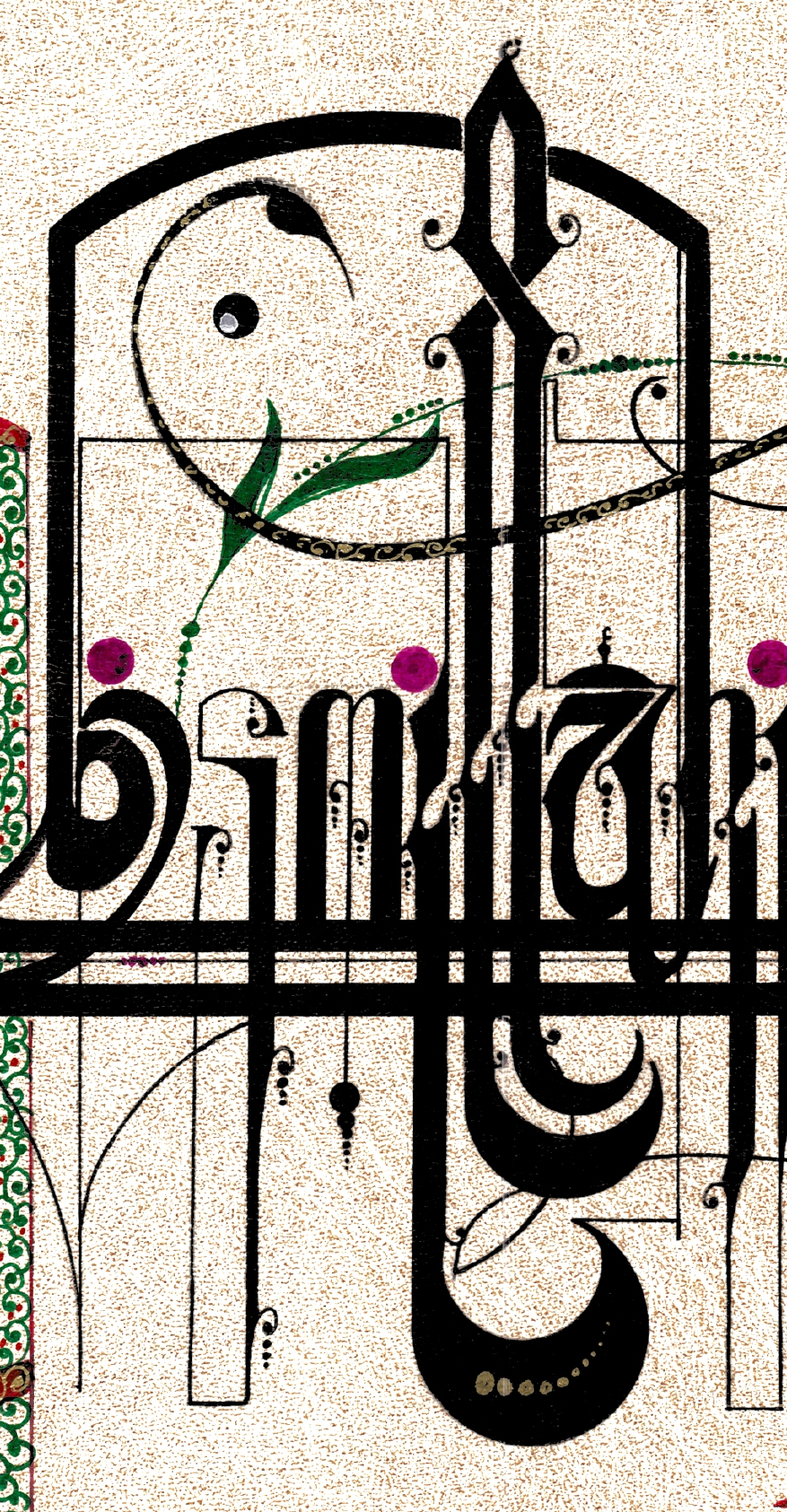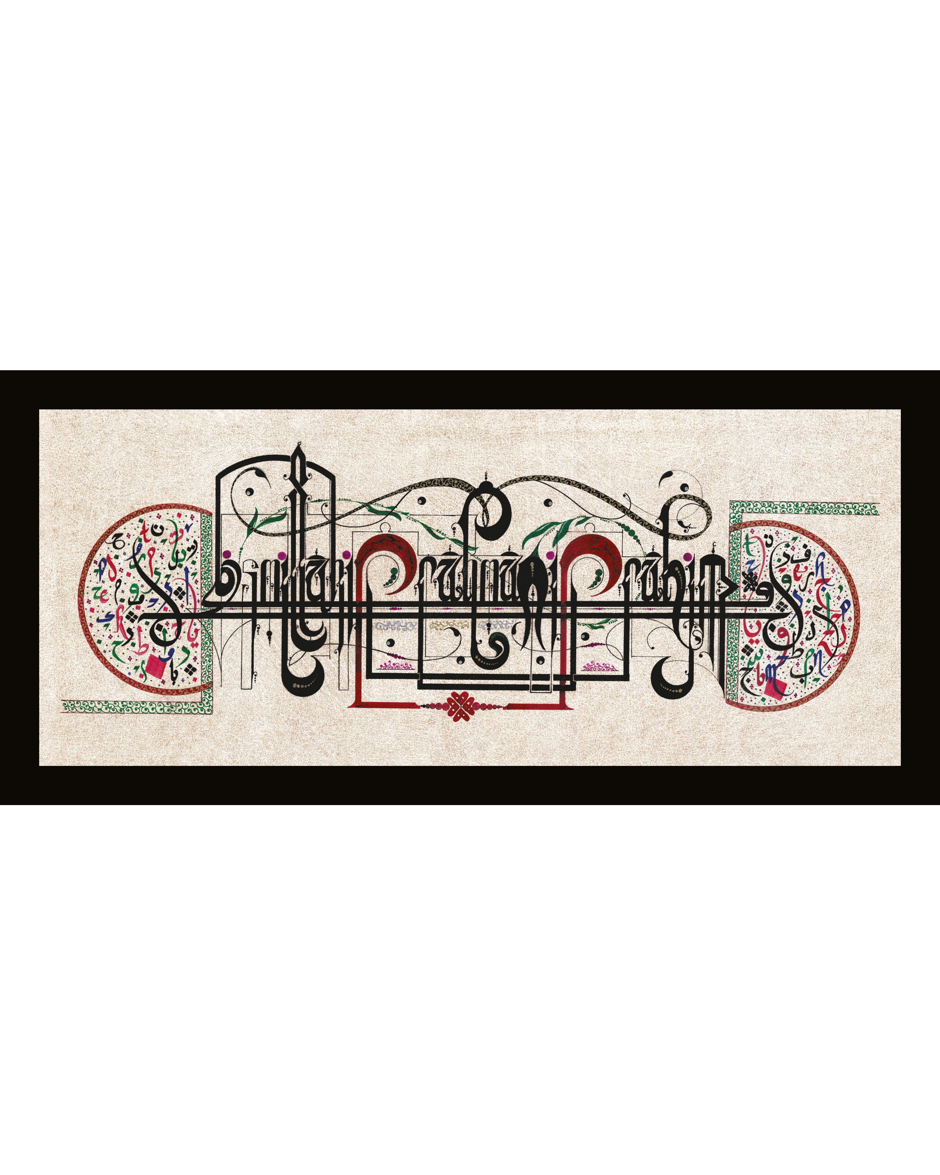 Türkçe Besmele-i Şerif. Sağ ve sol yarım dairelere harfler tasarlandı. Orta bölüme soldan sağa doğru Türkçe “BismillahirRahmanirRahim” yazıldı. Yoğun motiflerden oluşan çalışmanın harfleri de özgün biçimde çalışıldı.