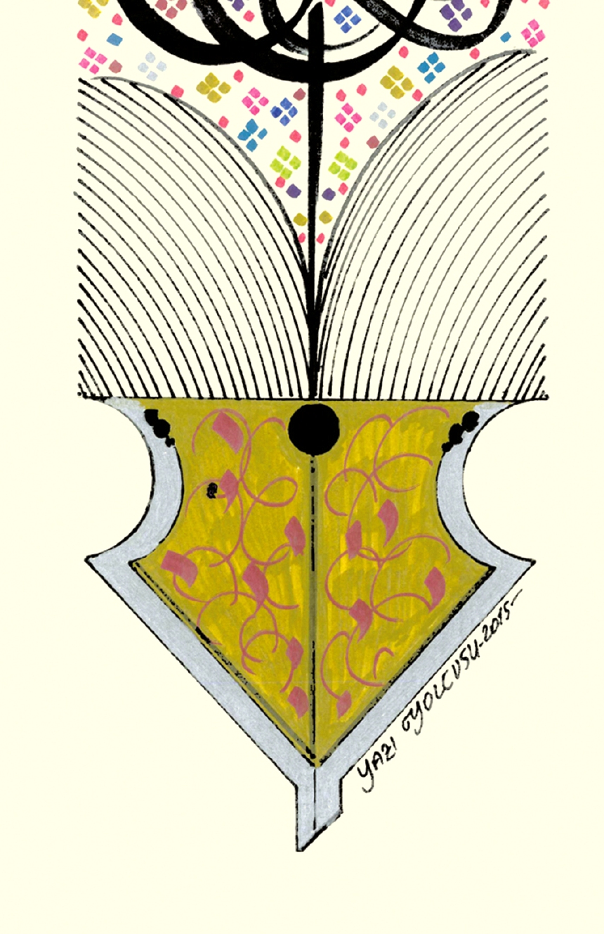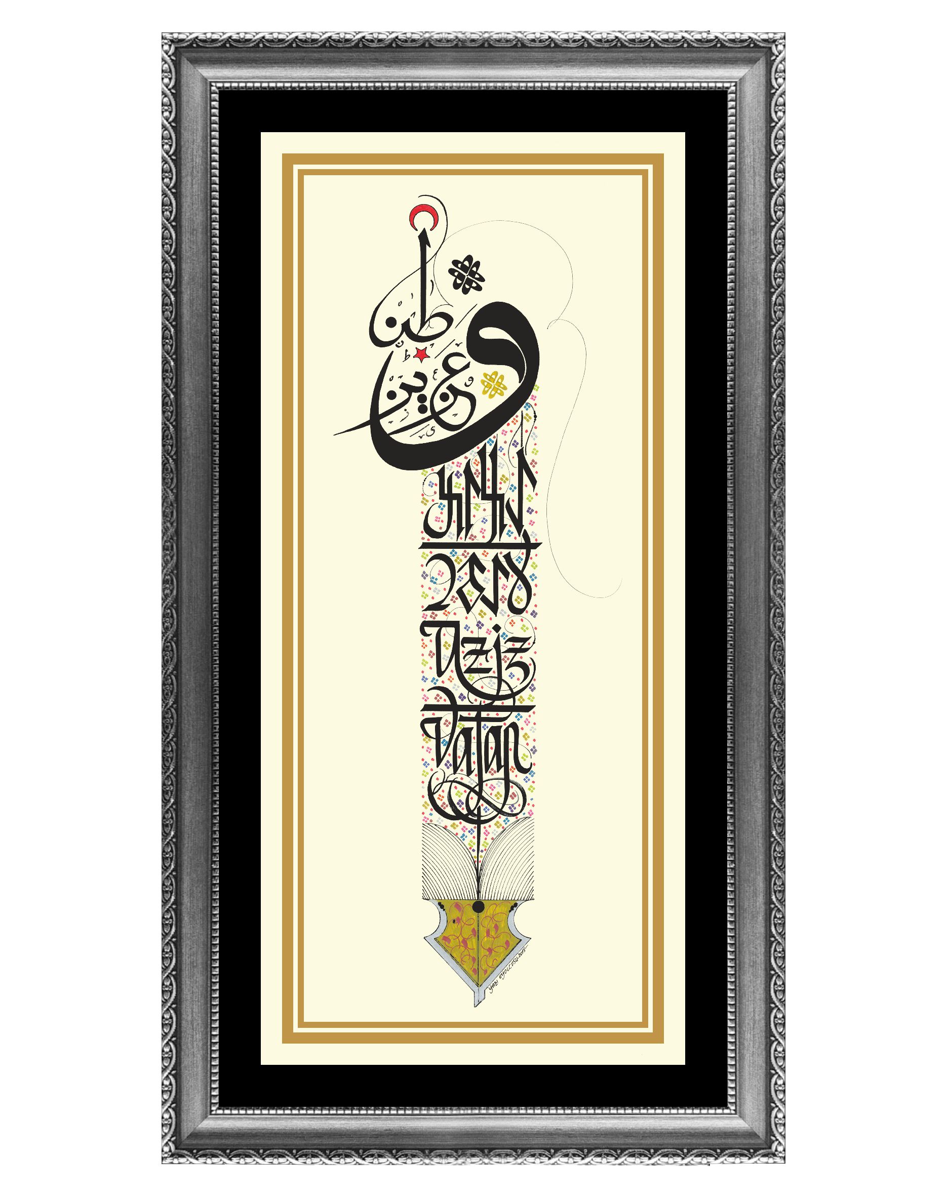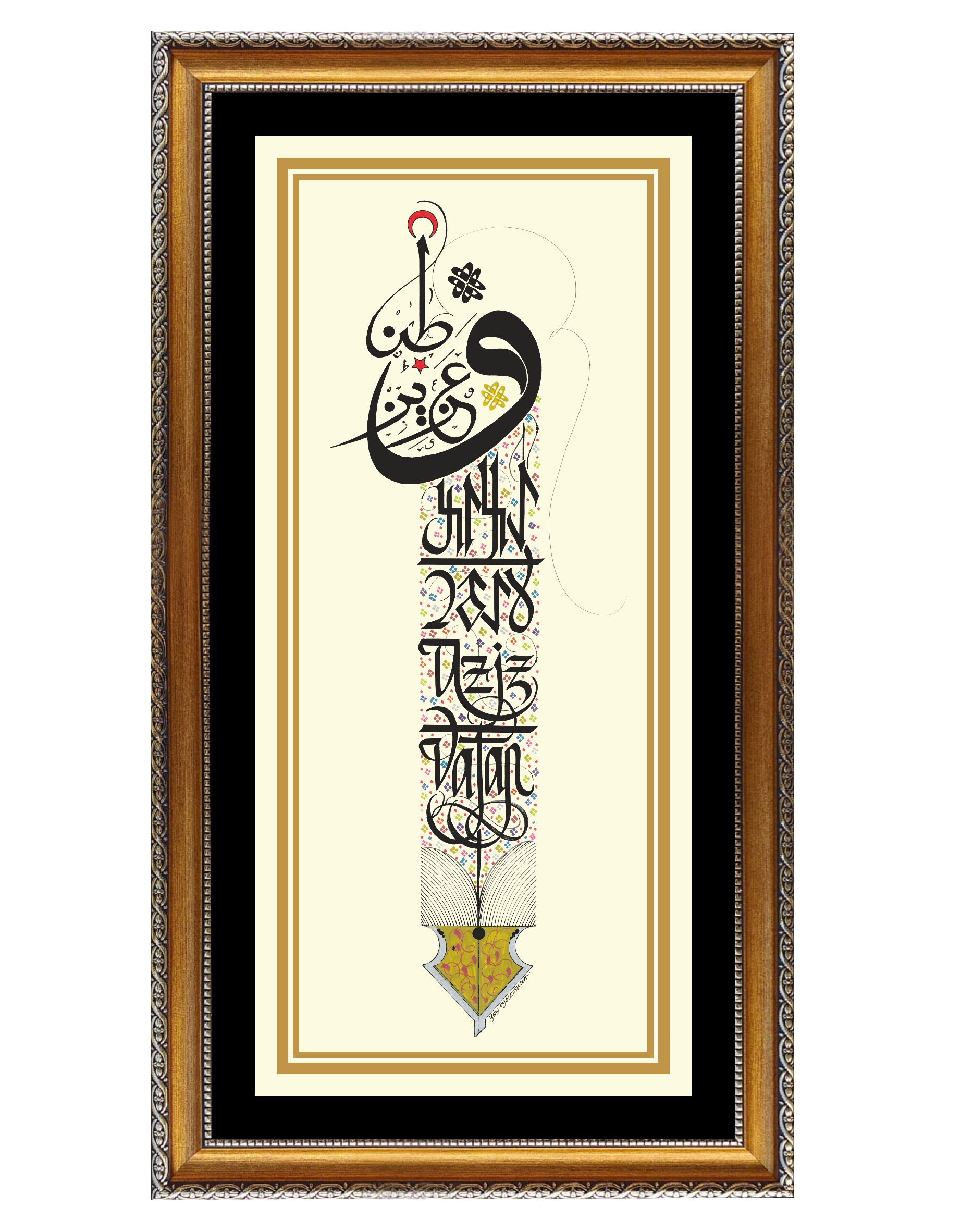 Kalem görselinde Osmanlıca, Göktürkçe ve günümüz Türkçesiyle “Aziz Vatan” yazılı.