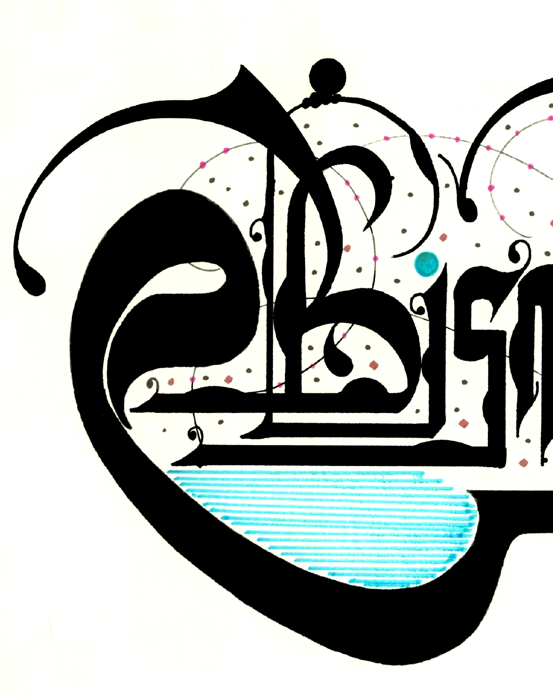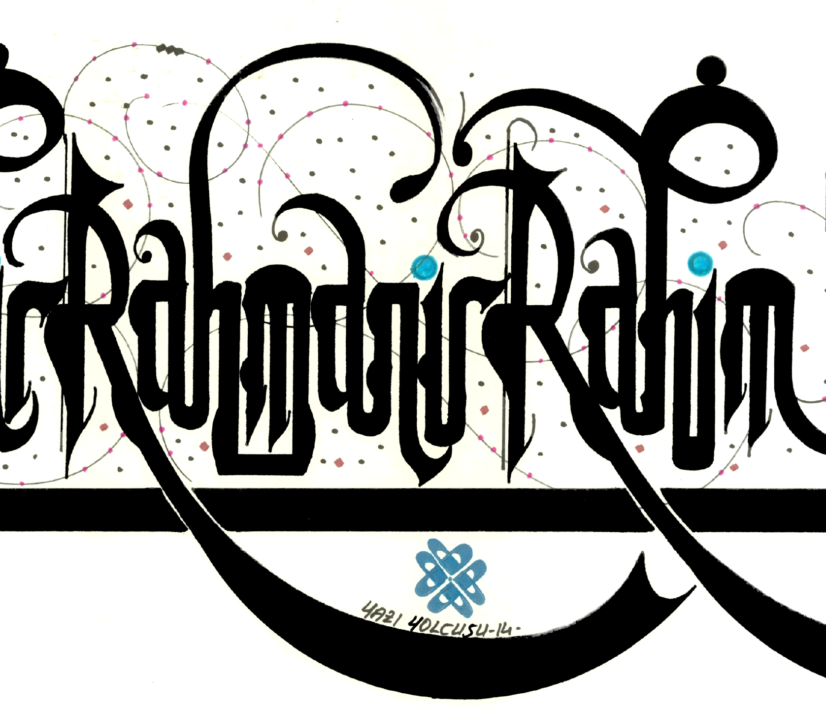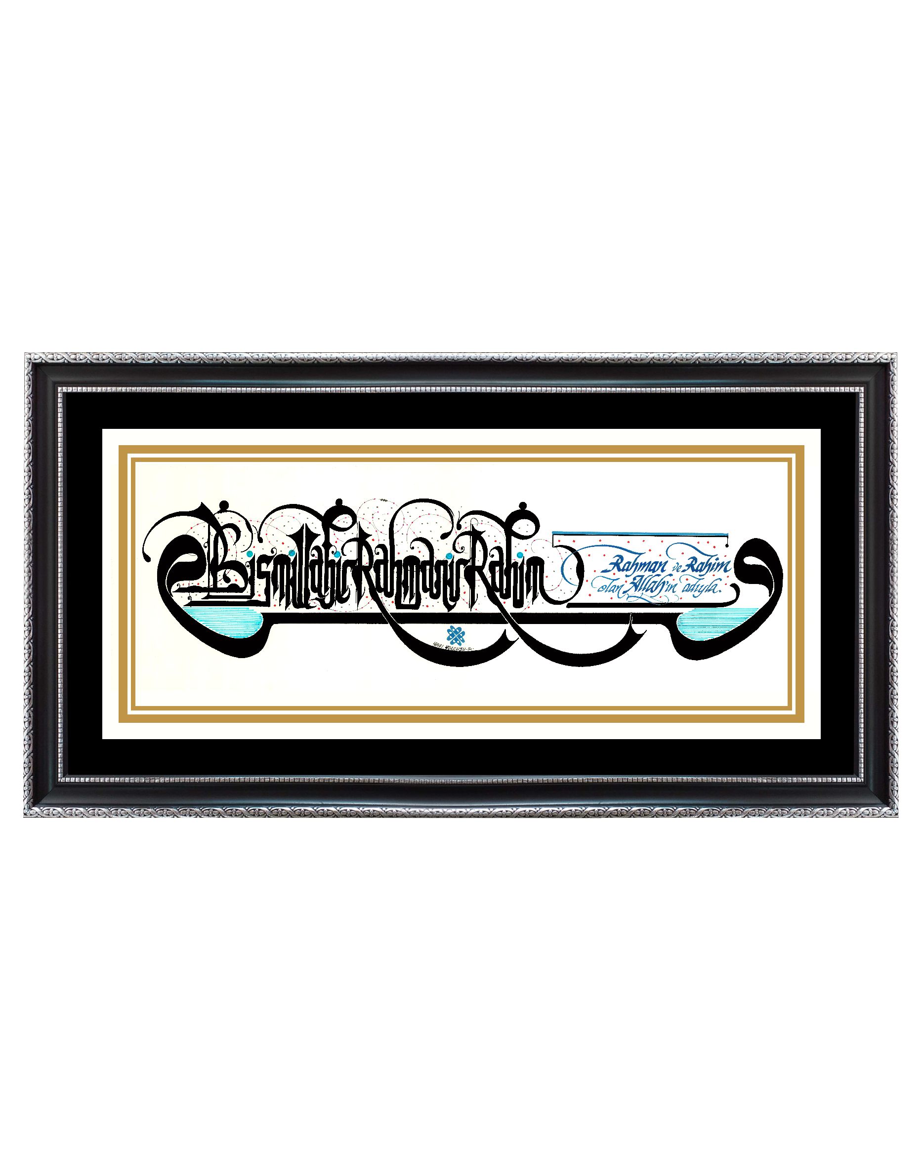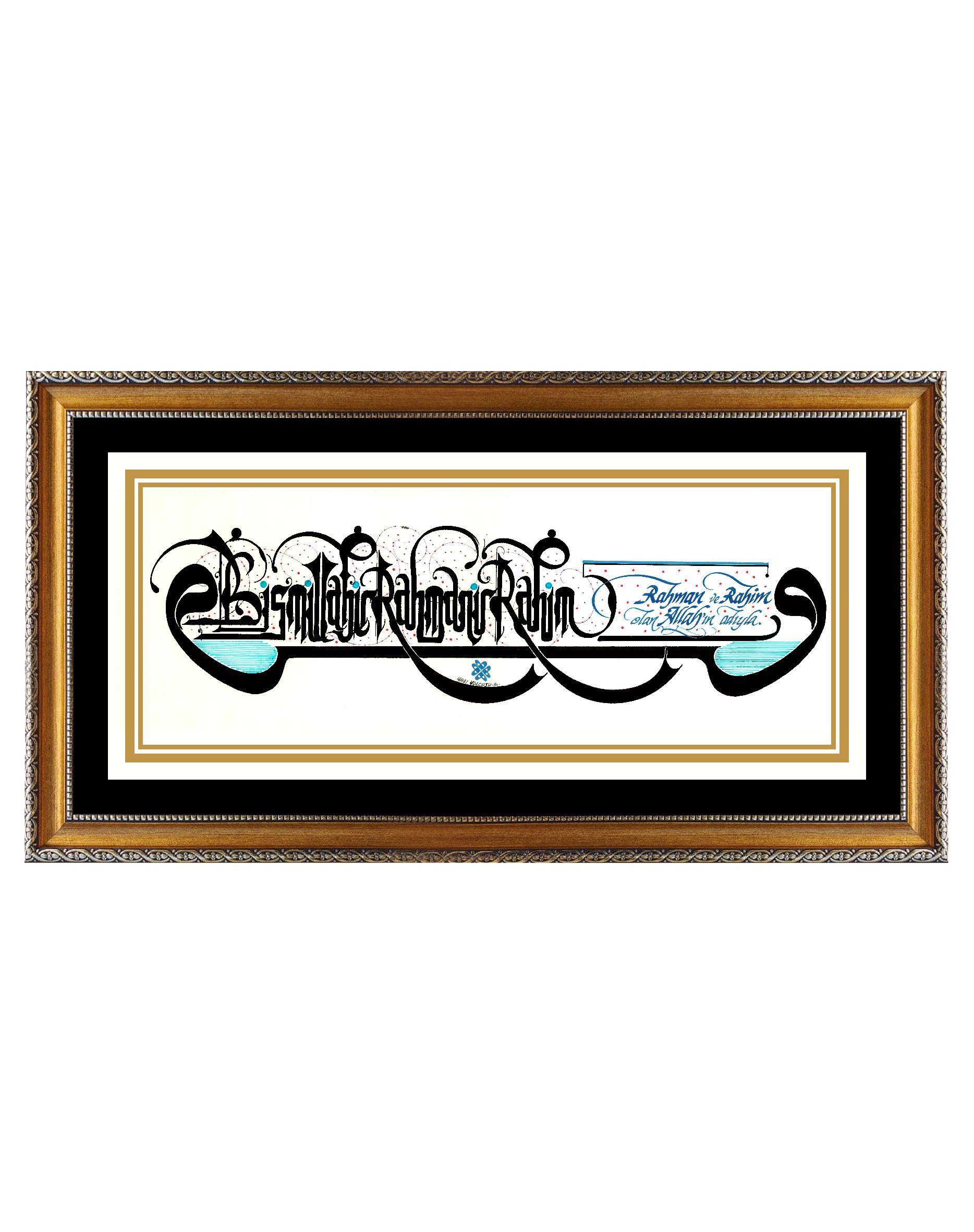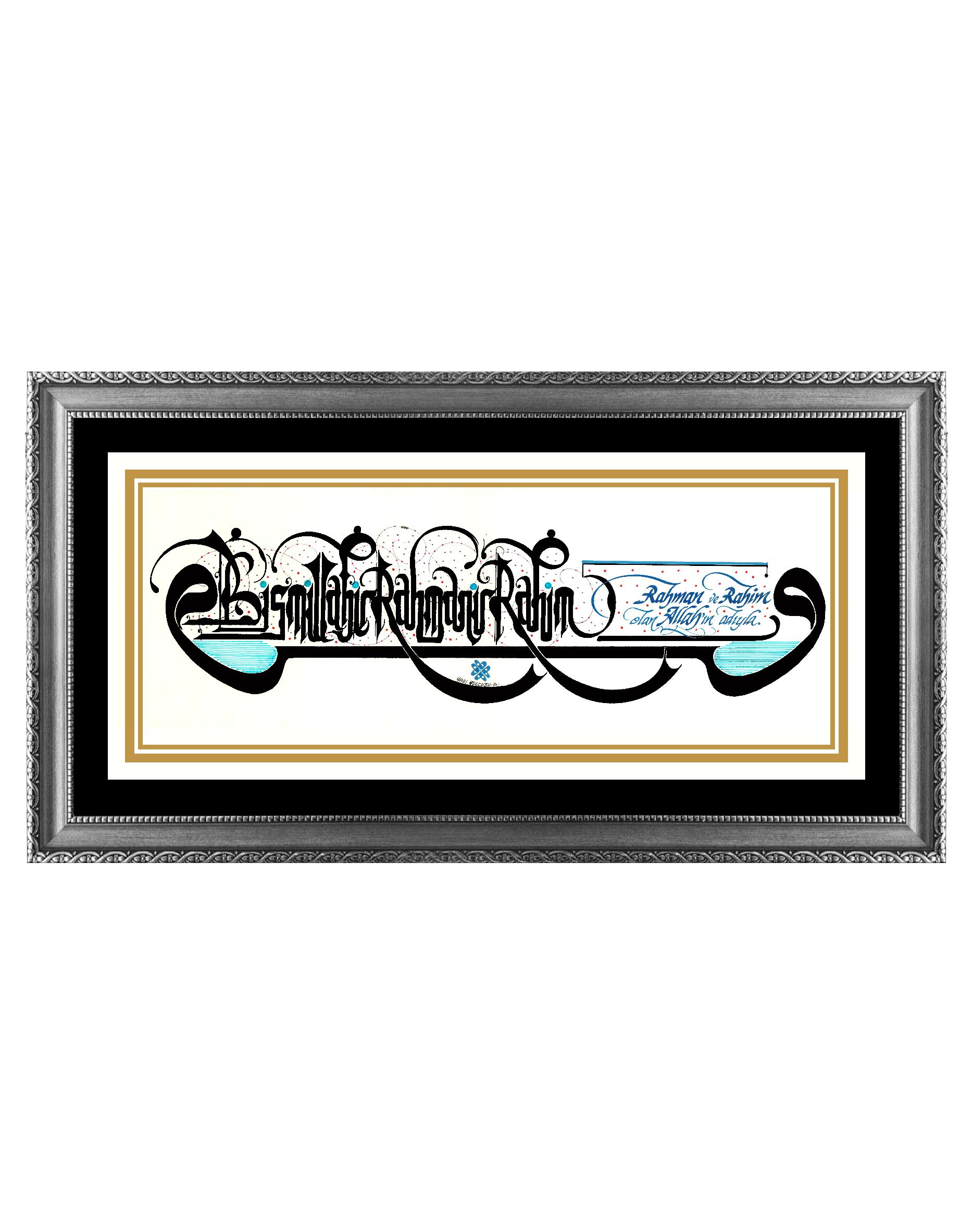 Sağ ve solda Arapça “vav” harfleri, ortada Latin harfleriyle Besmelenin telaffuzu “BismillahirRahmanirRahim”. Sağ bölümde Türkçe meali “Rahman ve Rahim olan Allah’ın adıyla” yazılarak tasarlandı.