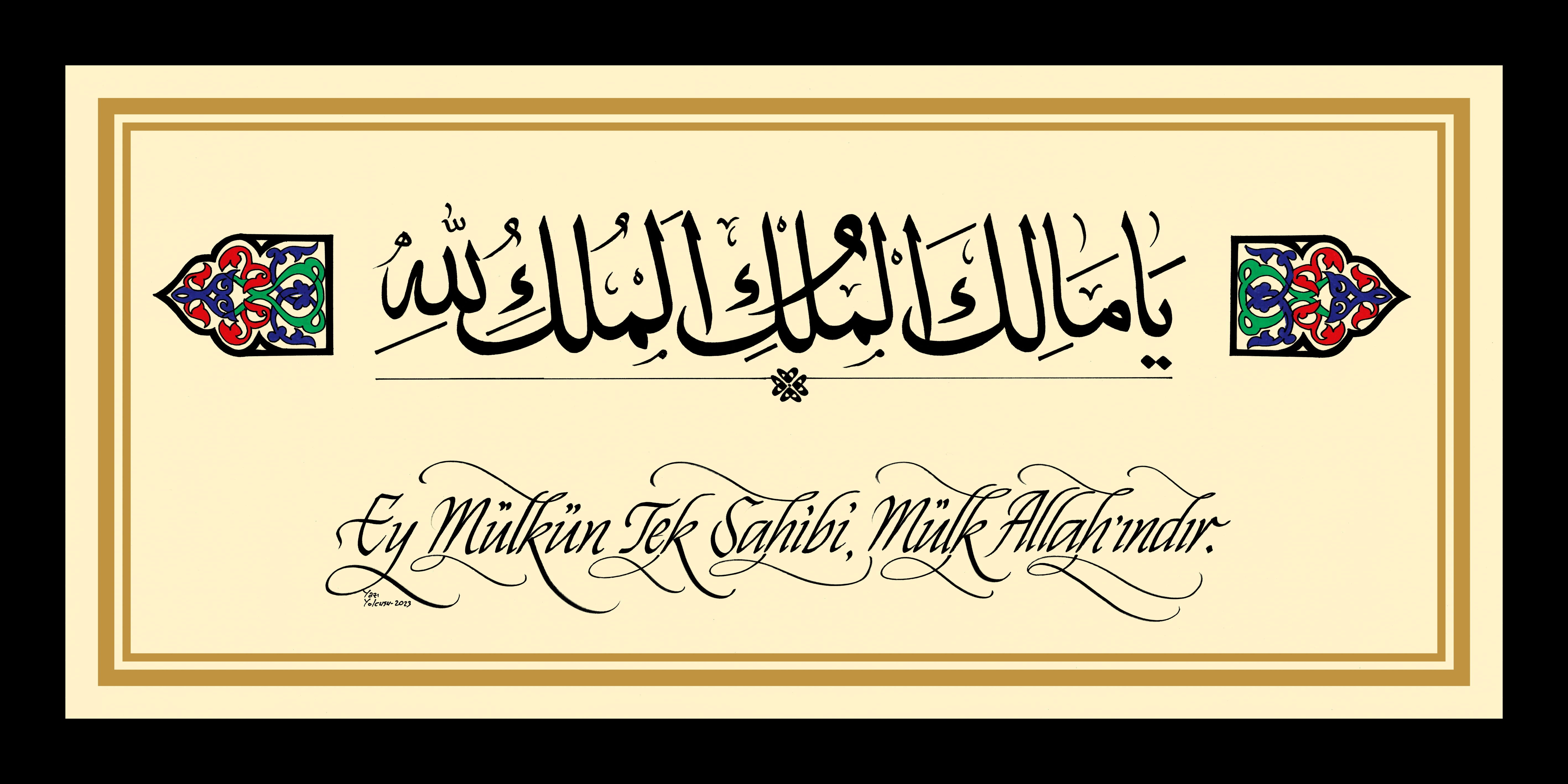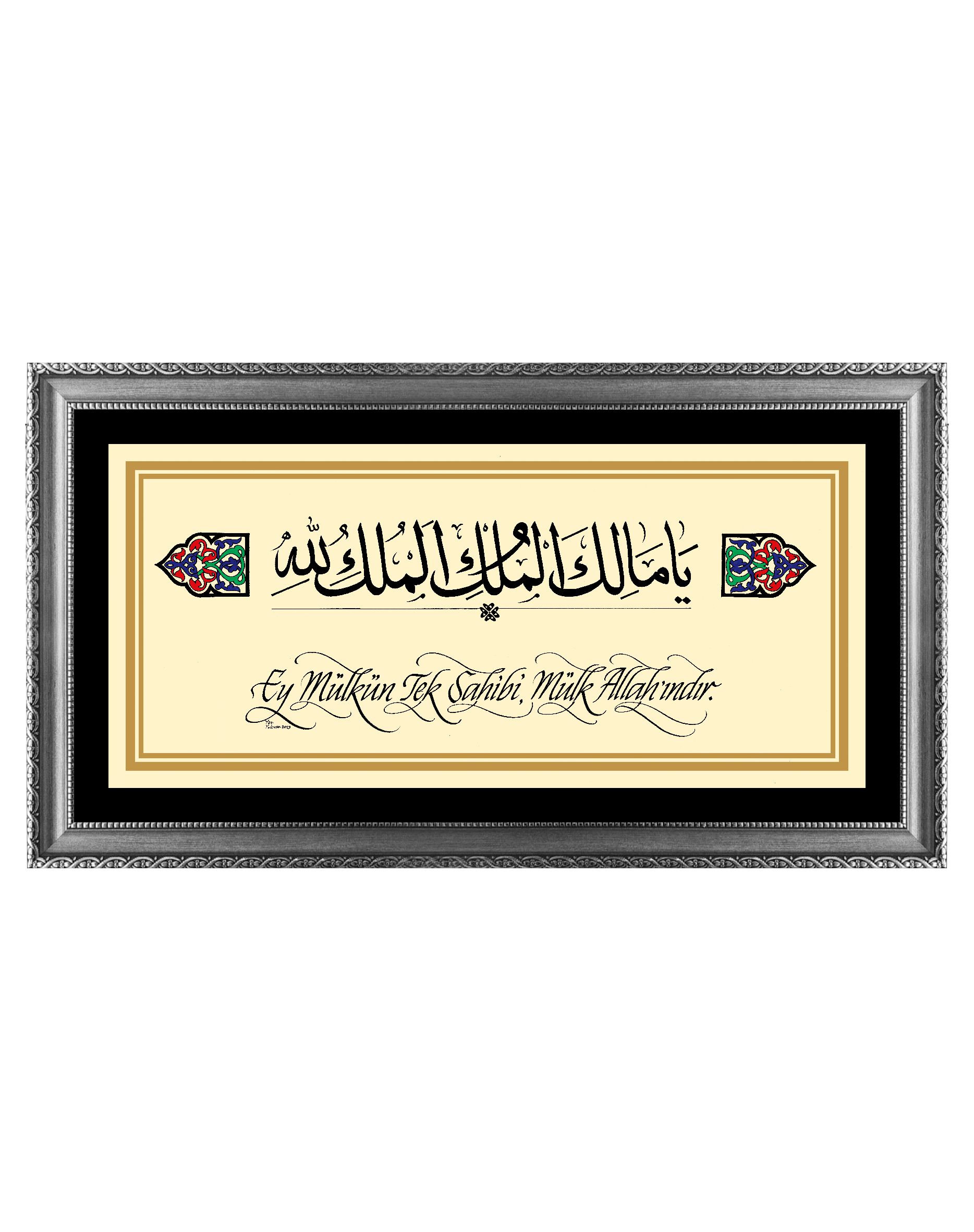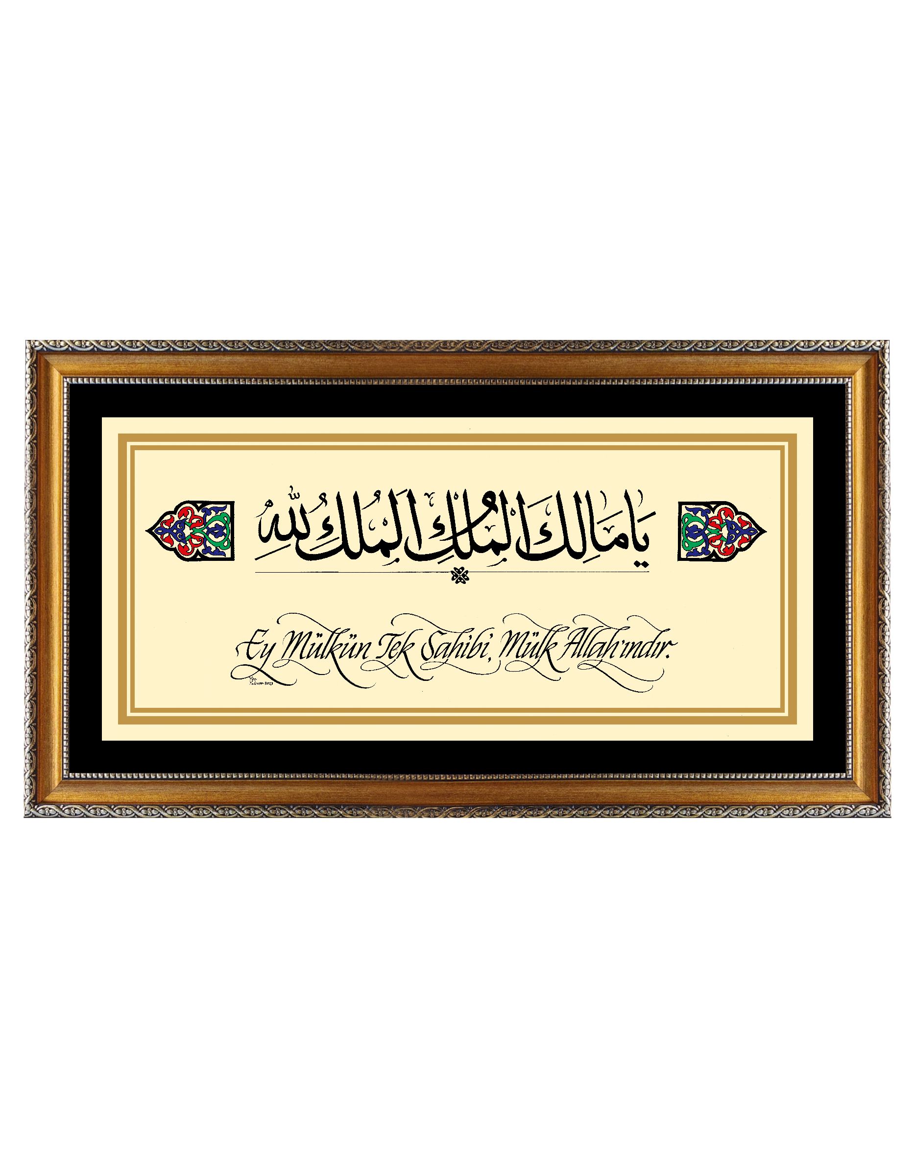 Arapça “Yâ Mâlike’l Mülk, El Mülkü Lîllah” - Türkçe “Ey Mülk’ün Tek Sahibi, Mülk Allah’ındır”. Sağ ve sol bölüme motif işlendi. Zemin krem rengi.