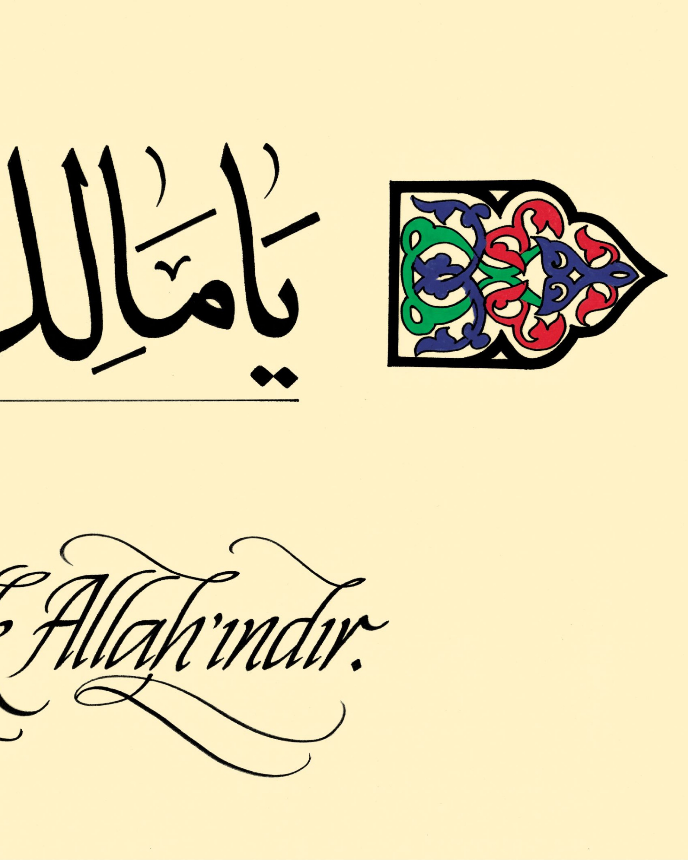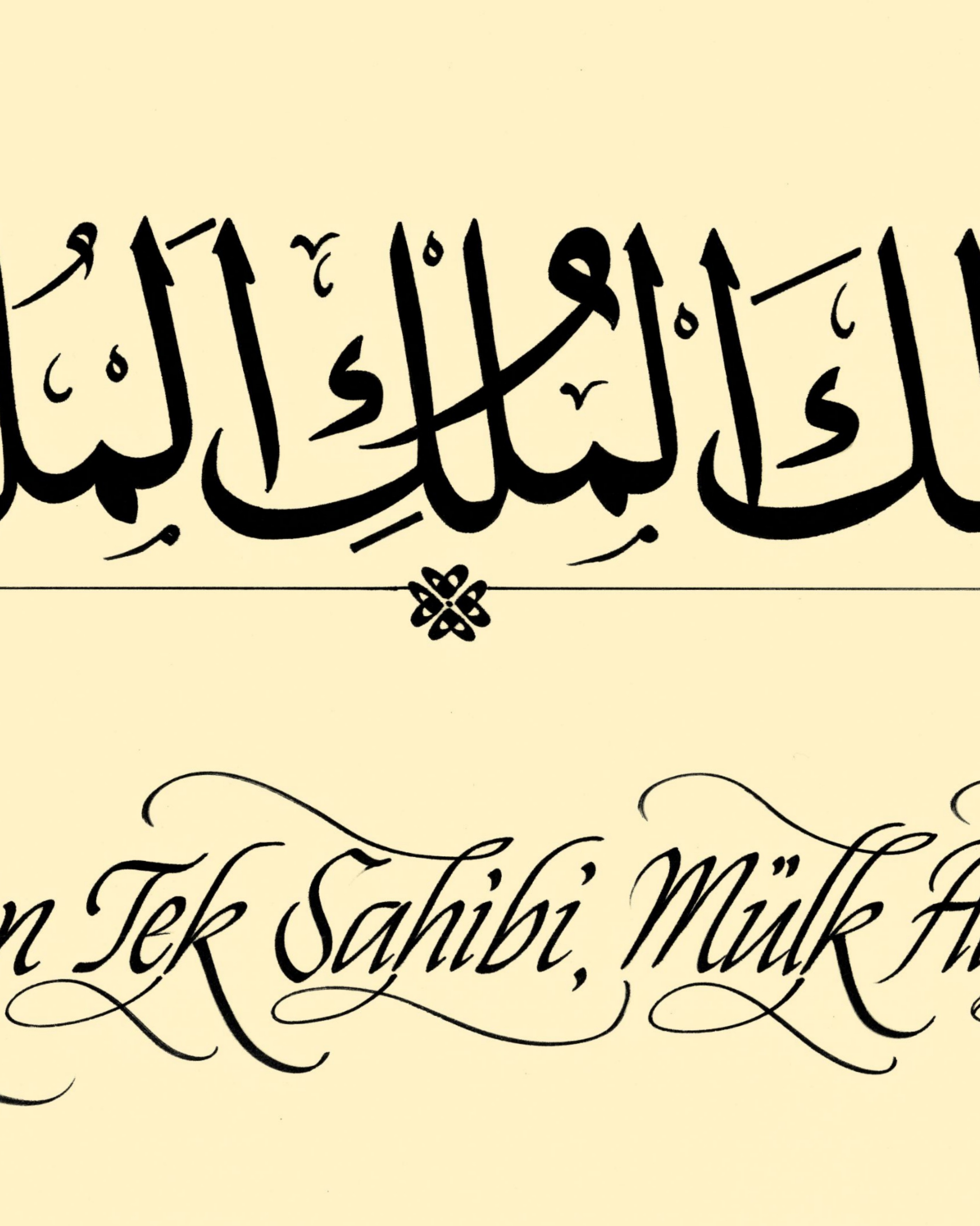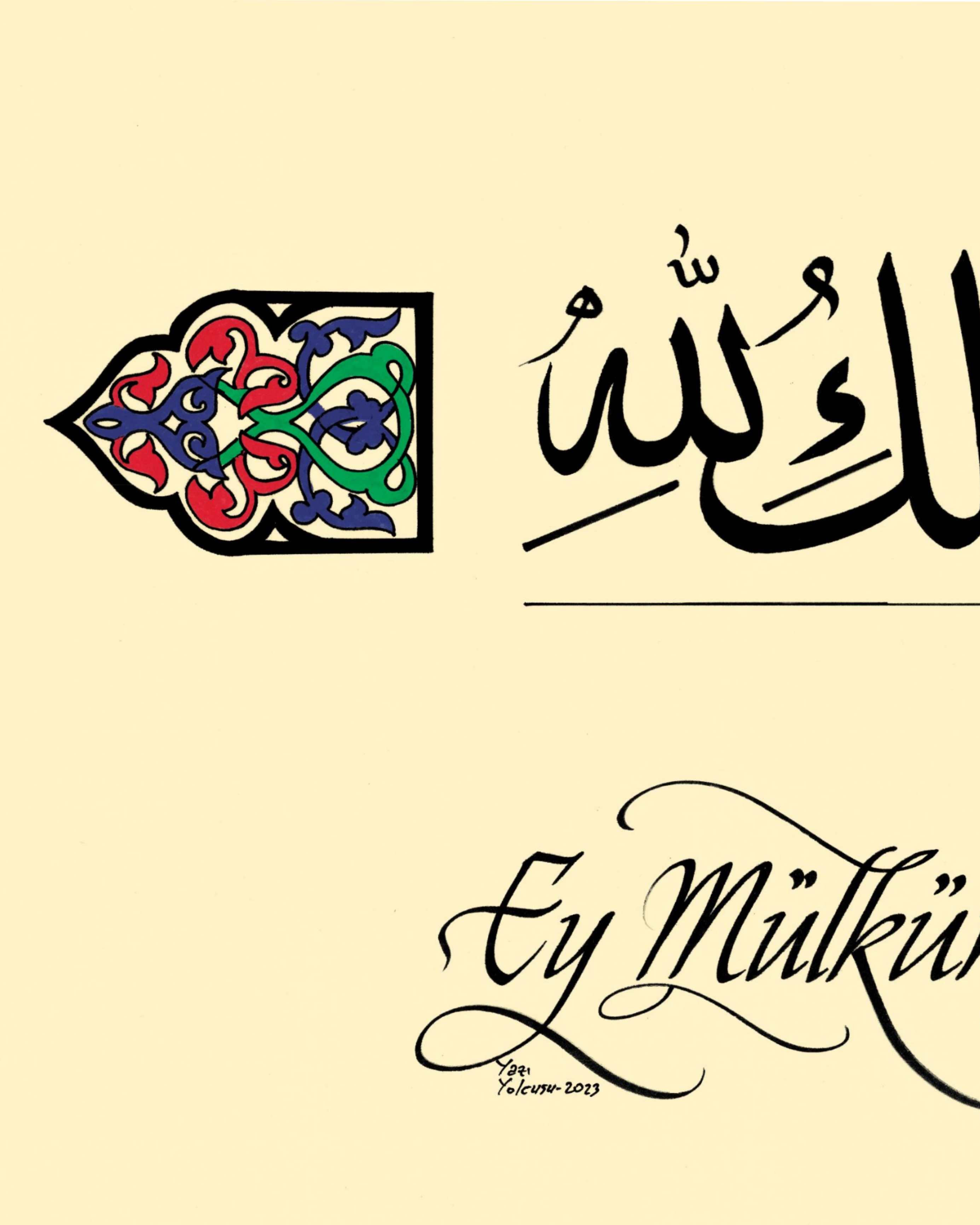 Arapça “Yâ Mâlike’l Mülk, El Mülkü Lîllah” - Türkçe “Ey Mülk’ün Tek Sahibi, Mülk Allah’ındır”. Sağ ve sol bölüme motif işlendi. Zemin krem rengi.