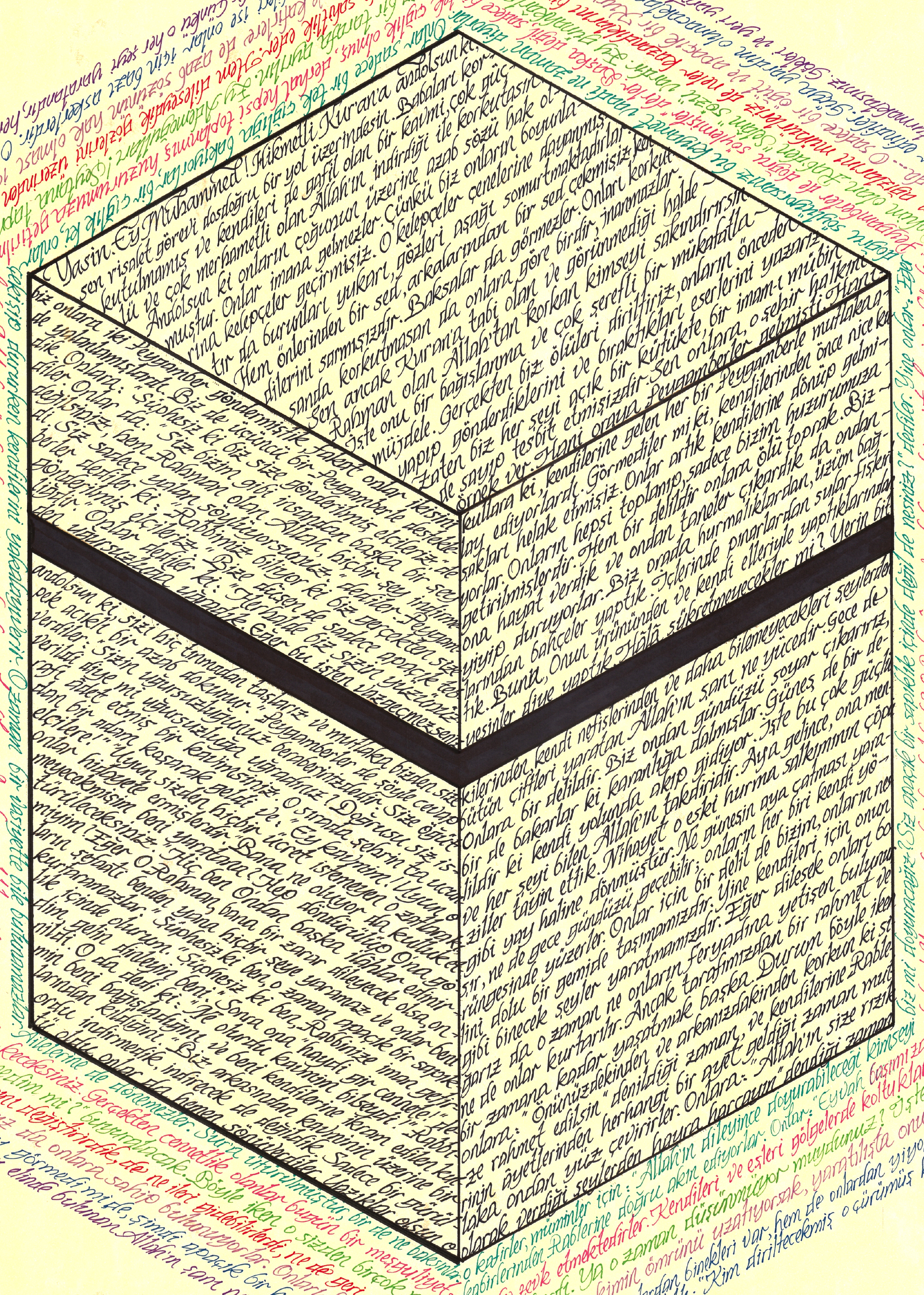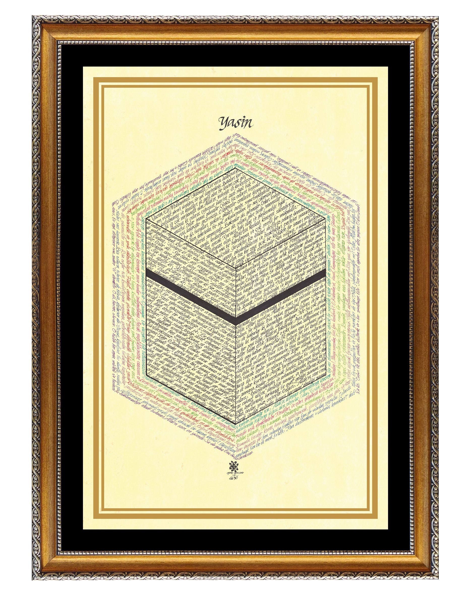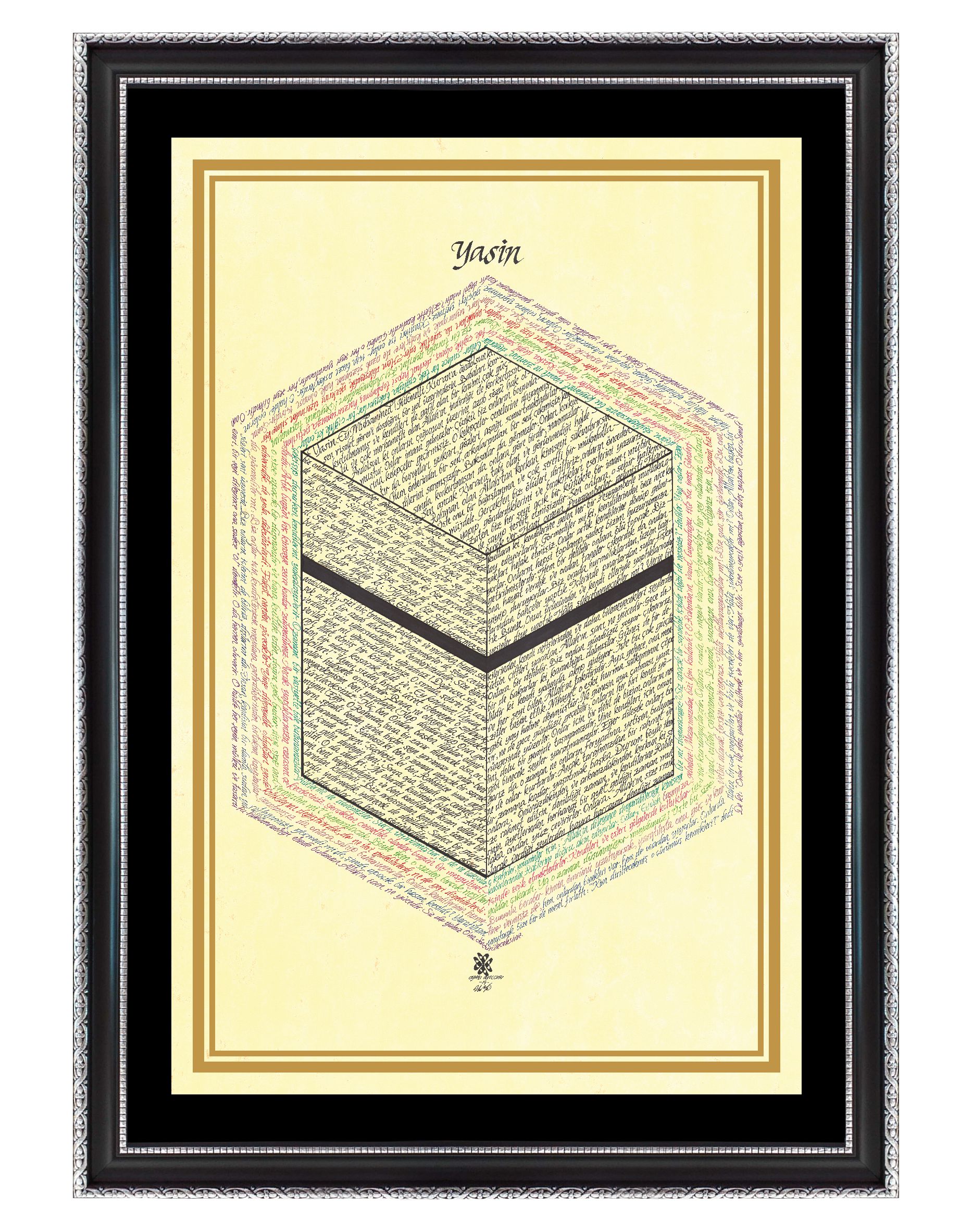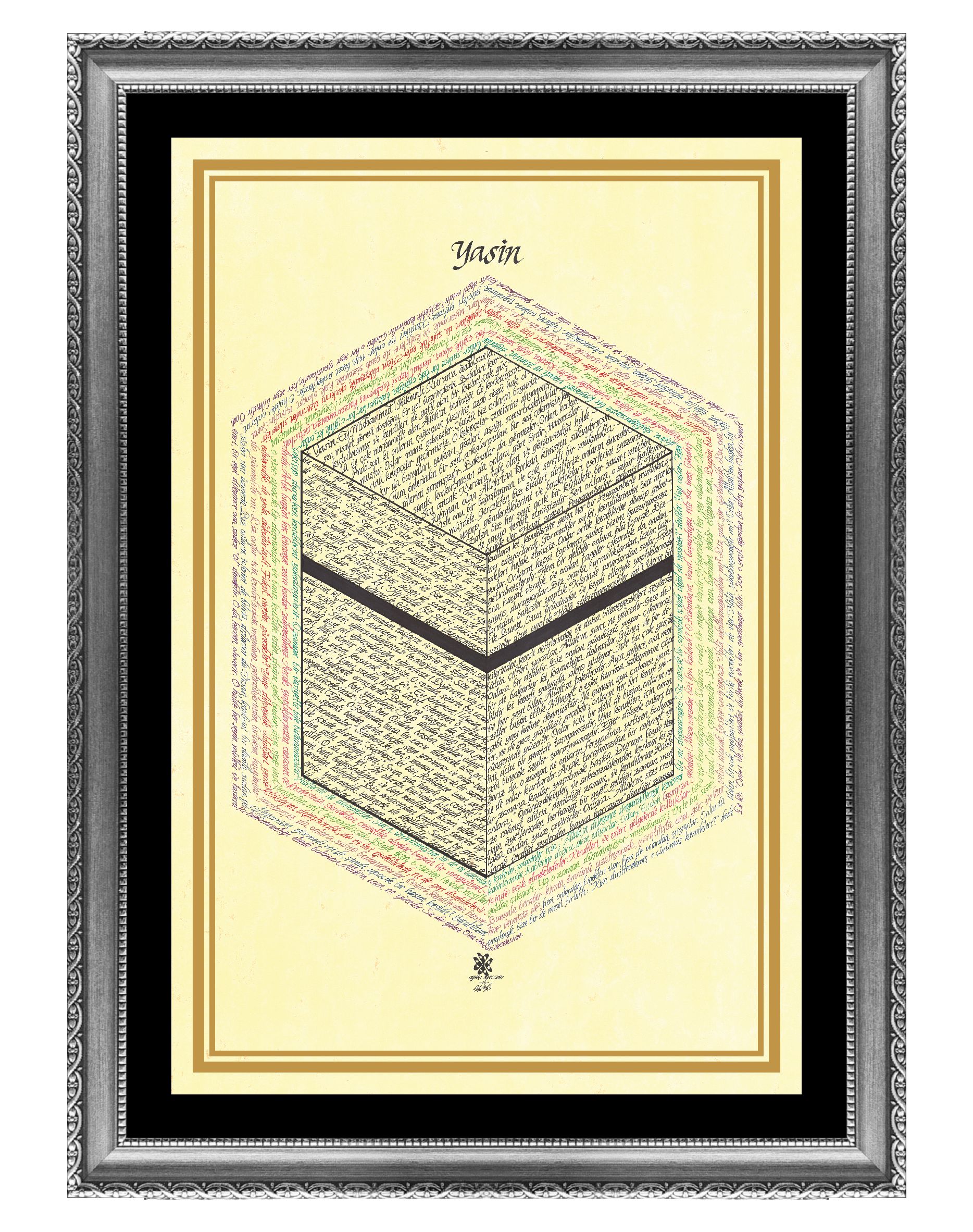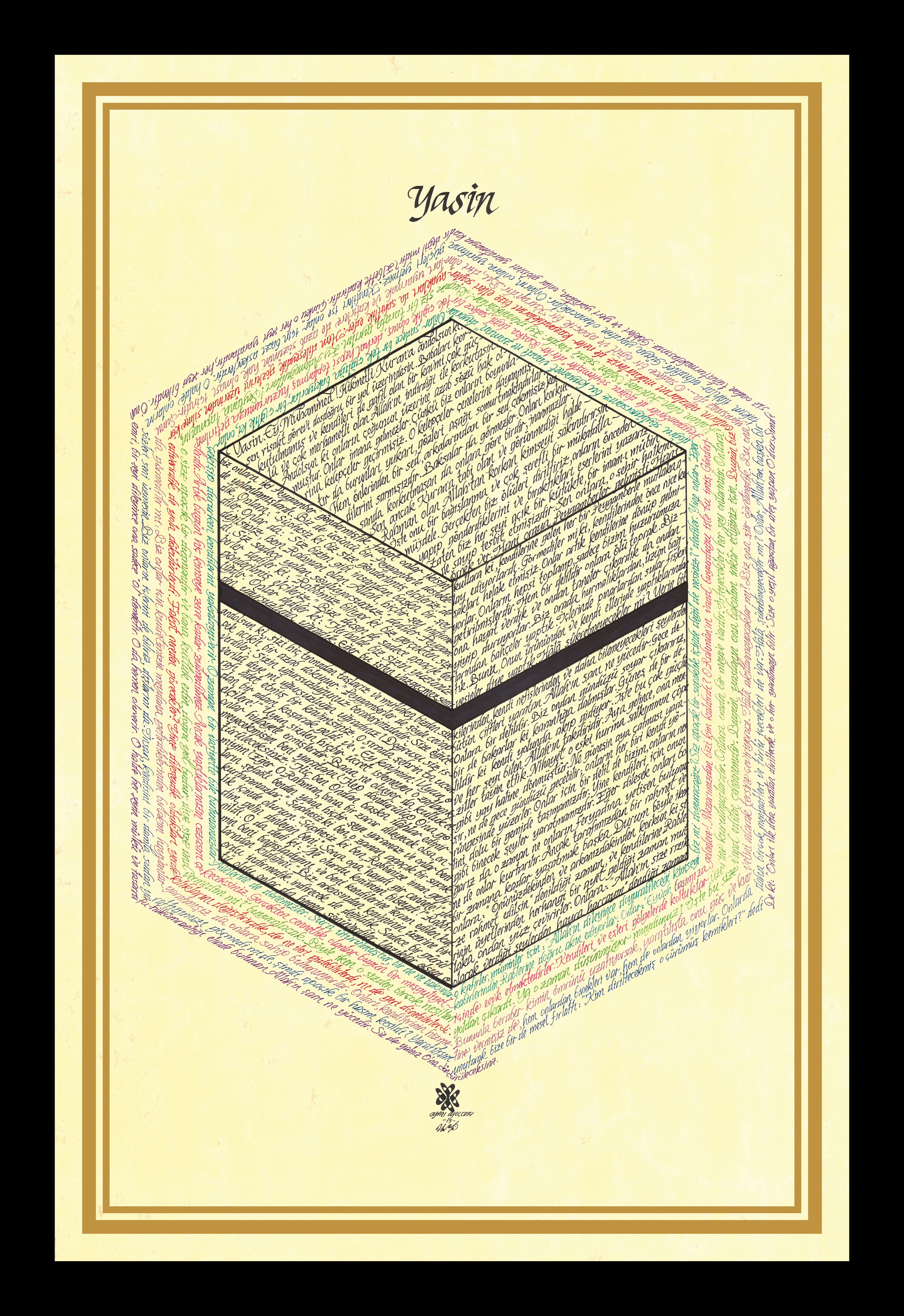 Kabe görselinde Yasin Suresi tamamının Türkçe Meali. Kabe etrafı tavafa vurgu yapılarak 7 farklı renkte saf halinde tasarlandı.